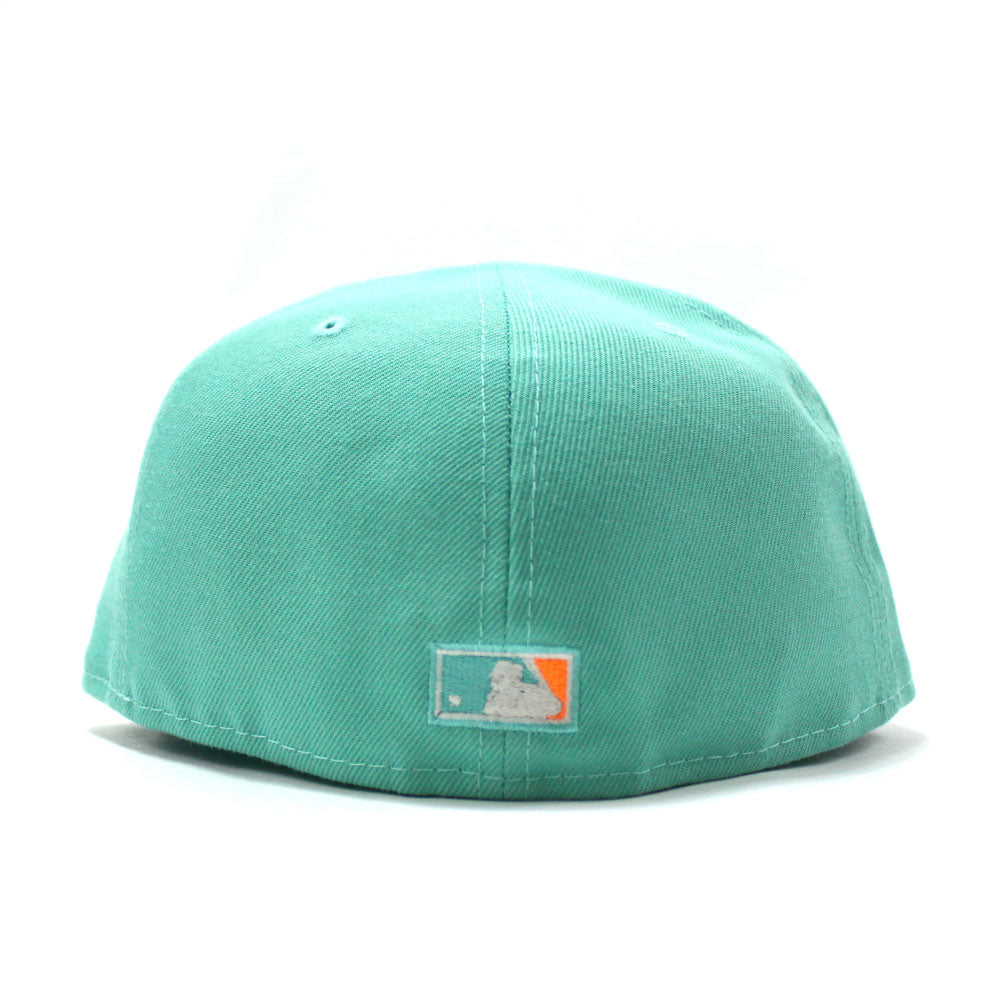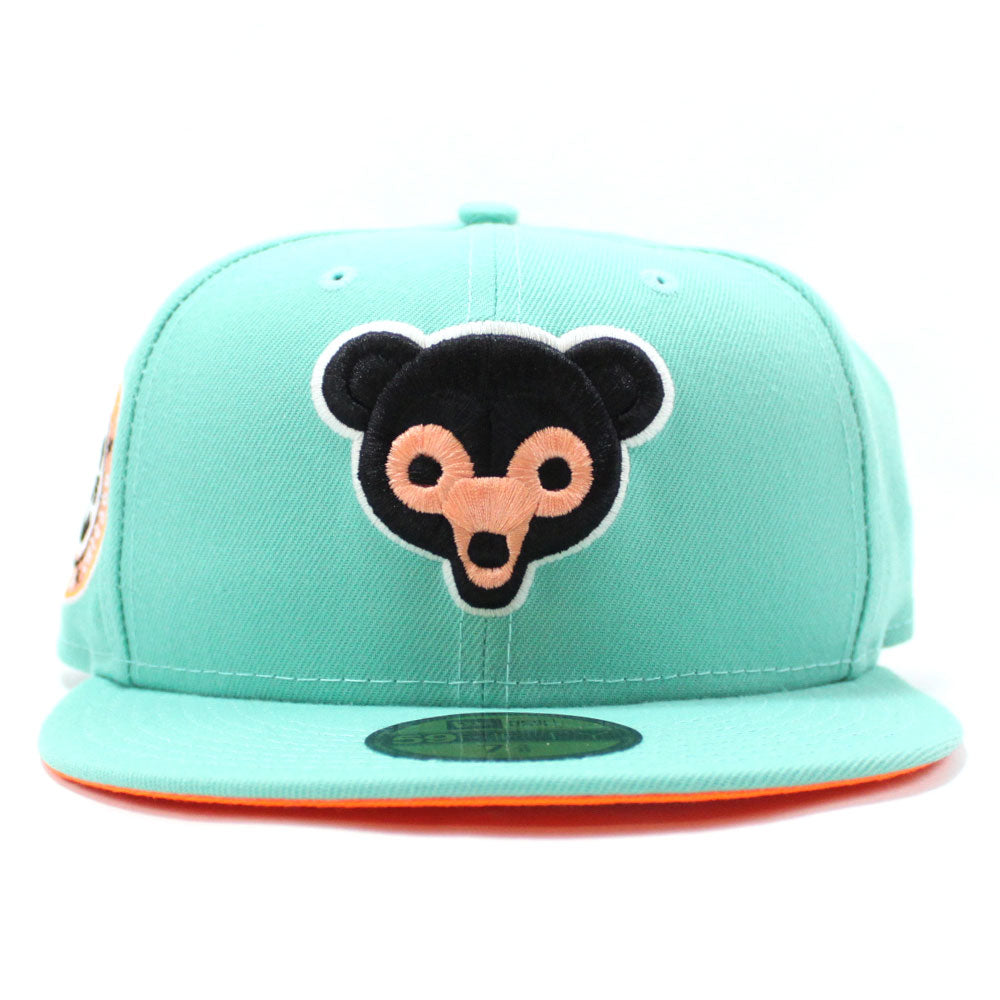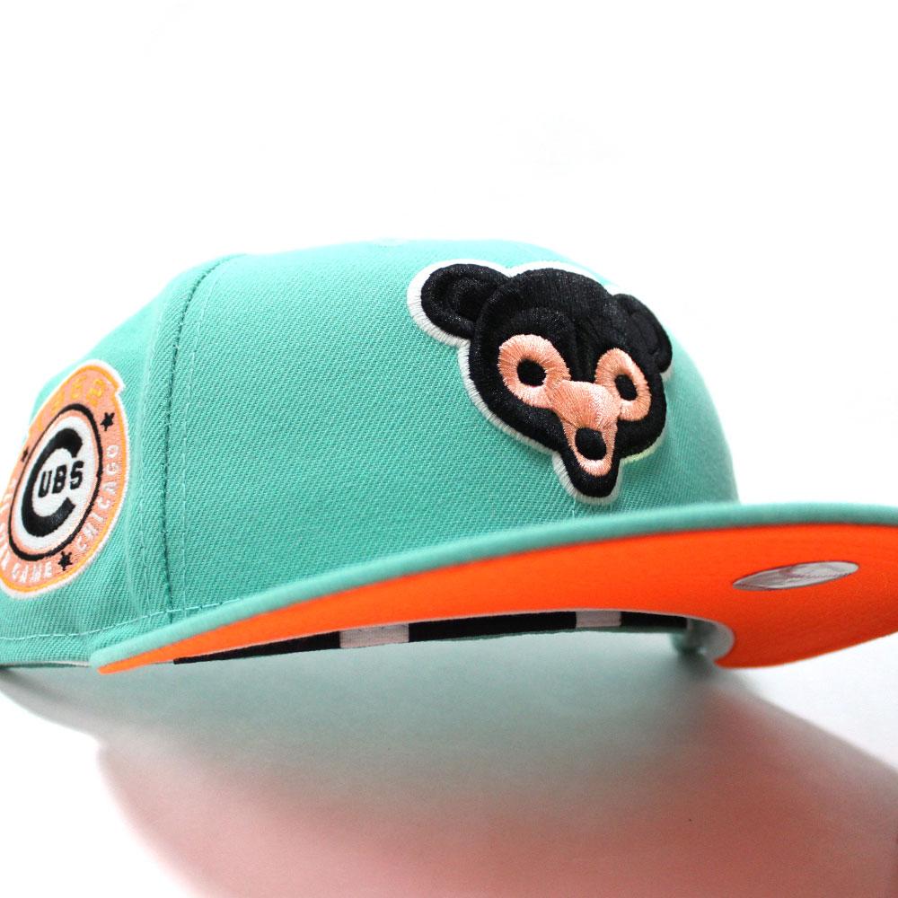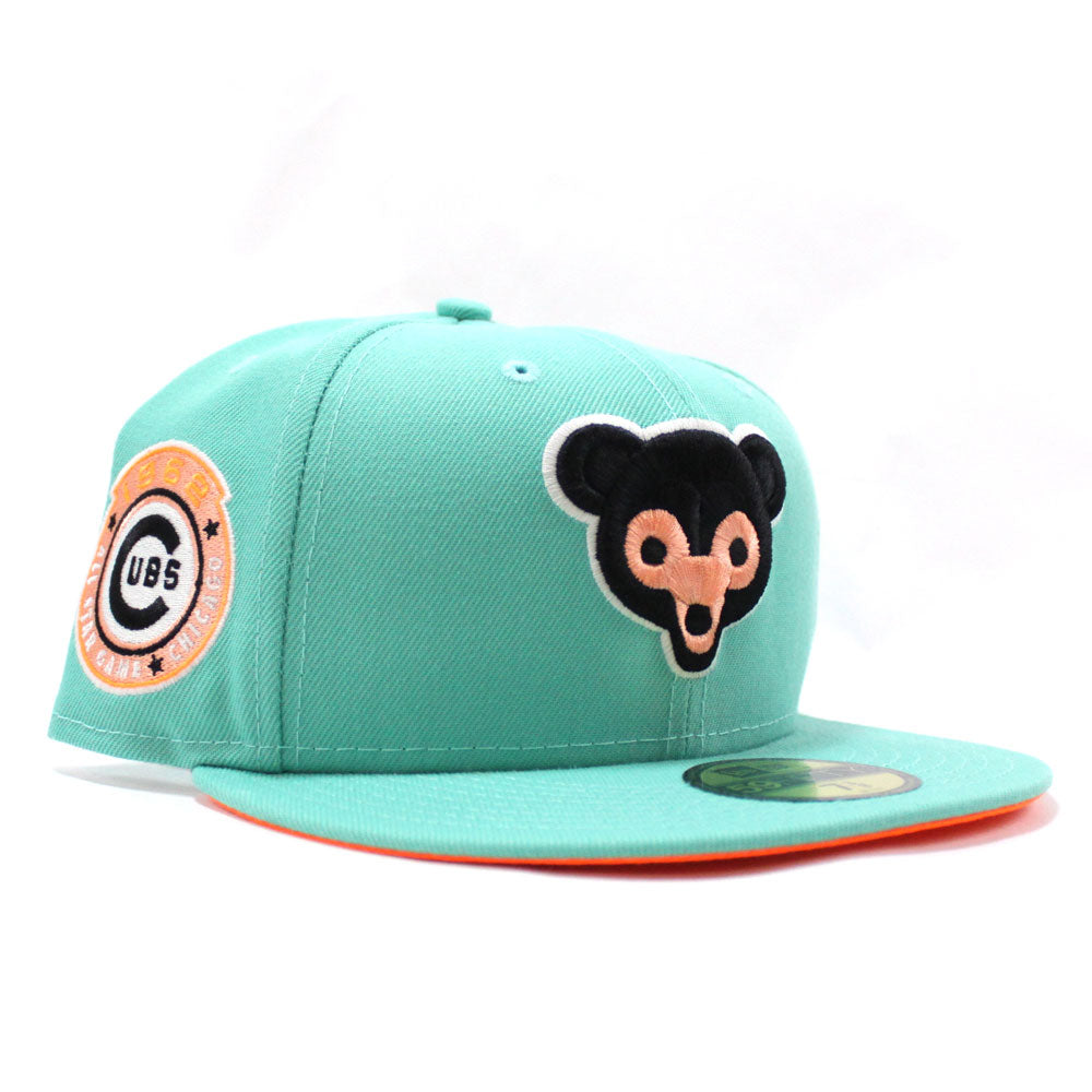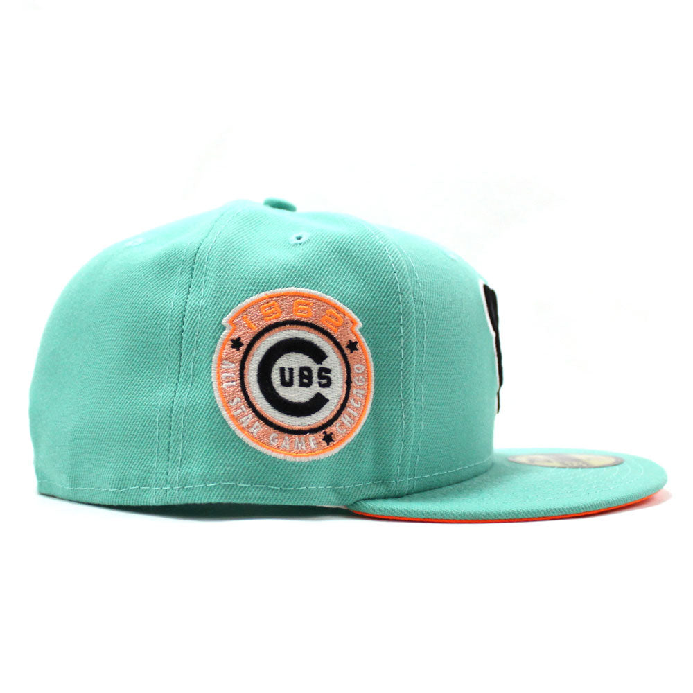 Chicago Cubs 1962 All Star Game 59Fifty New Era Fitted Hat in Clear Mint & Neon Orange Under Brim. Logo: Glow in the Dark