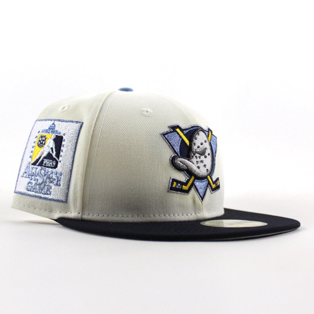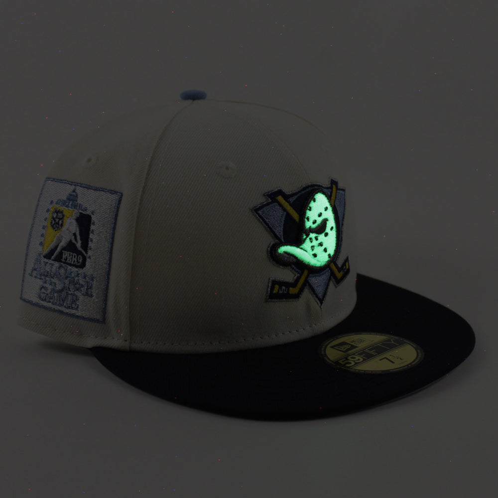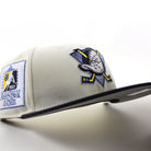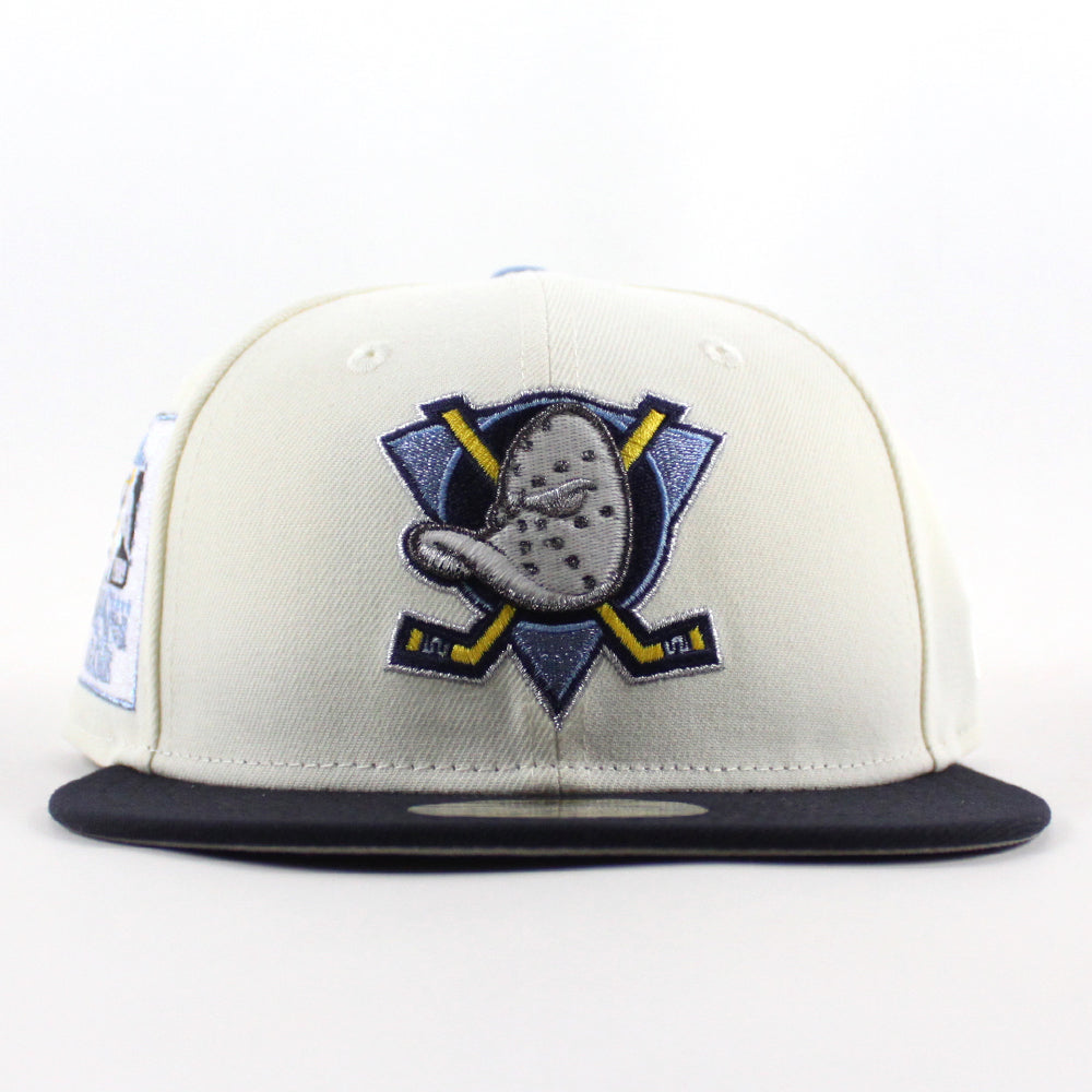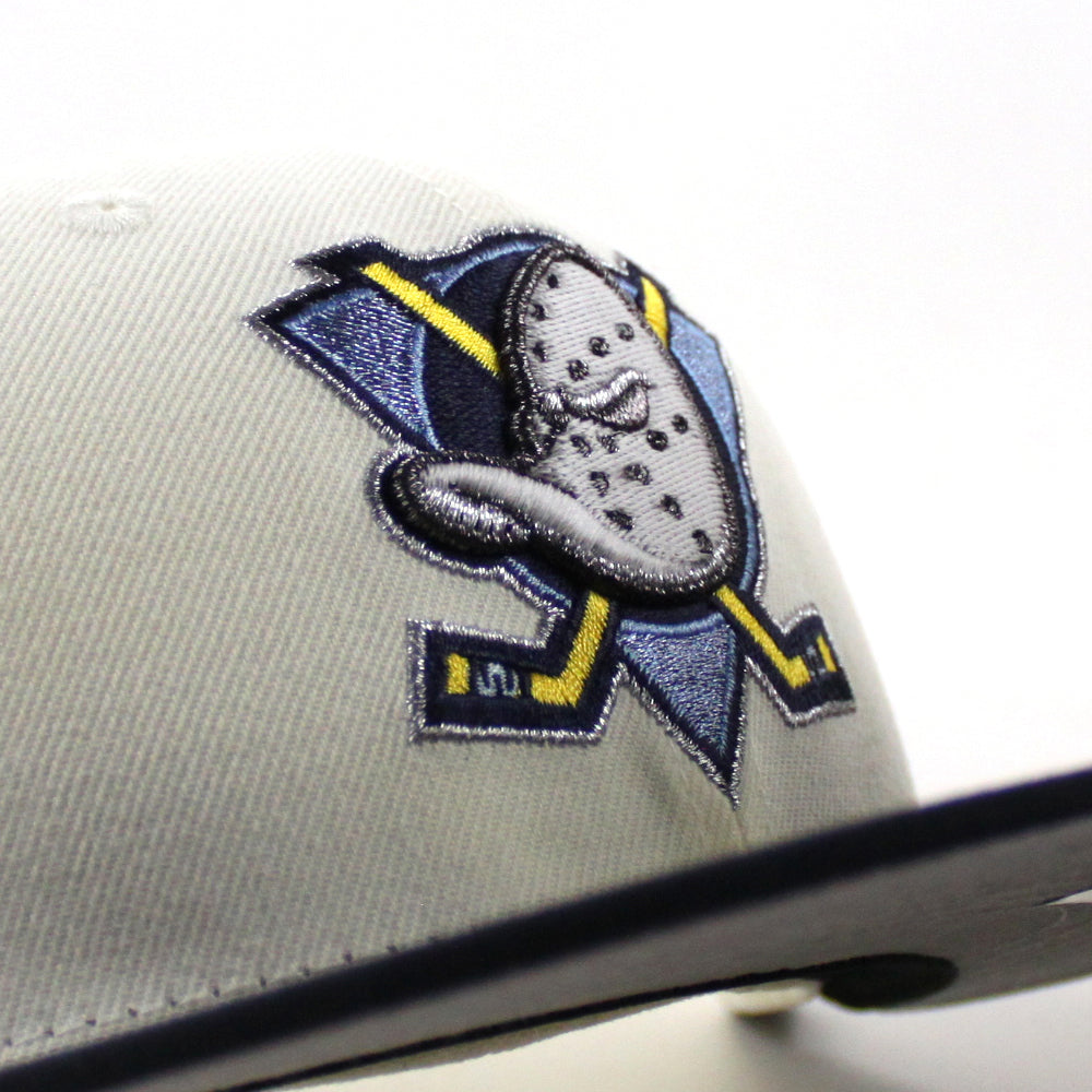 Anaheim Ducks 25 Years New Era 59Fifty Fitted Hat in Chrome White, Navy and Gray Under brim.
