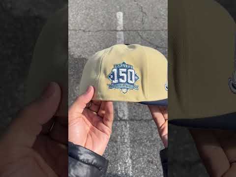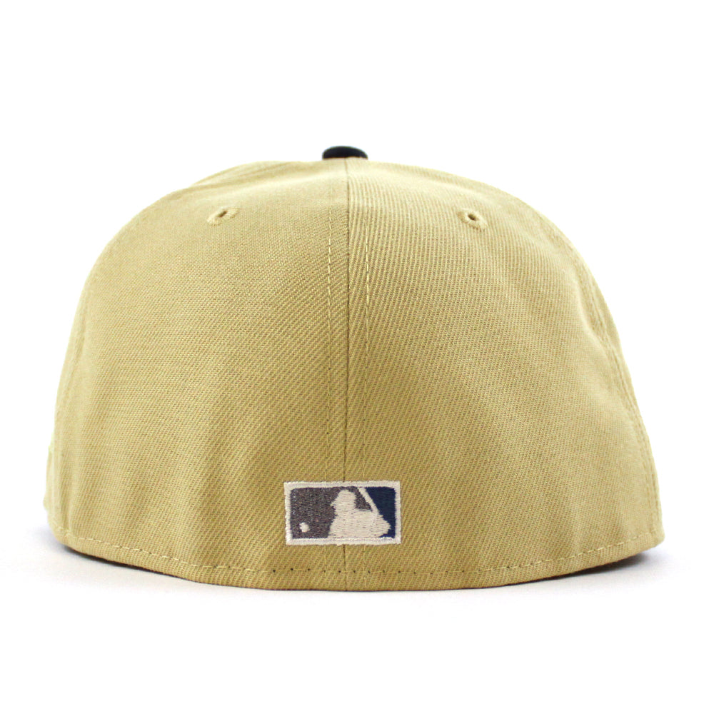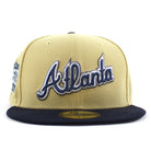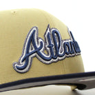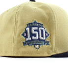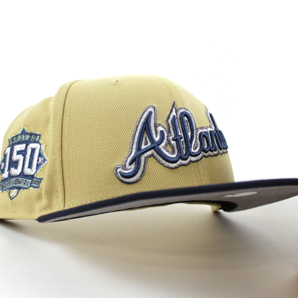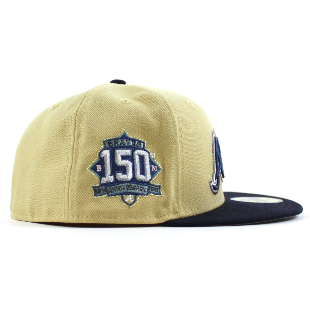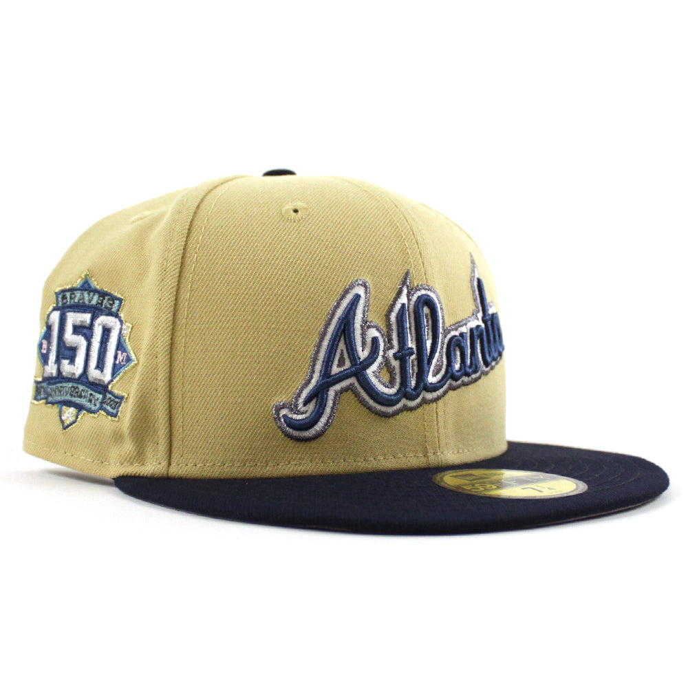 Atlanta Braves 150th ANNIVERSARY New Era 59Fifty Fitted Hat in Vegas Gold, Night Shift Navy and Gray Under Brim.