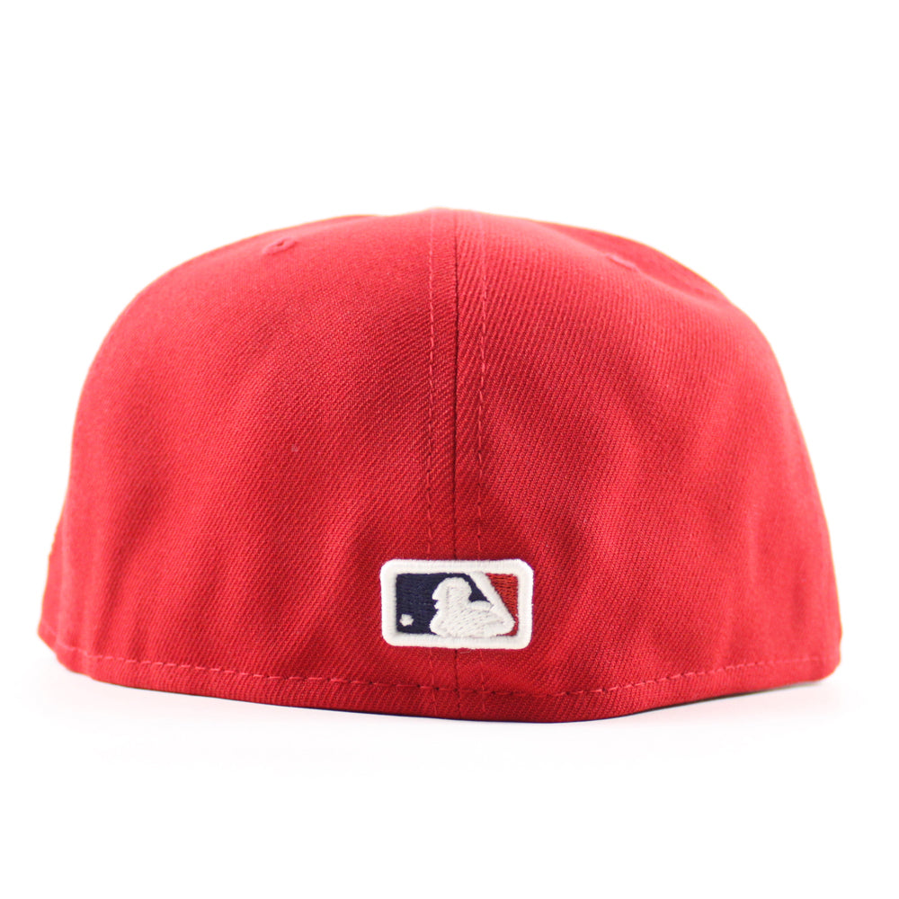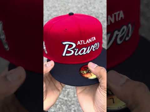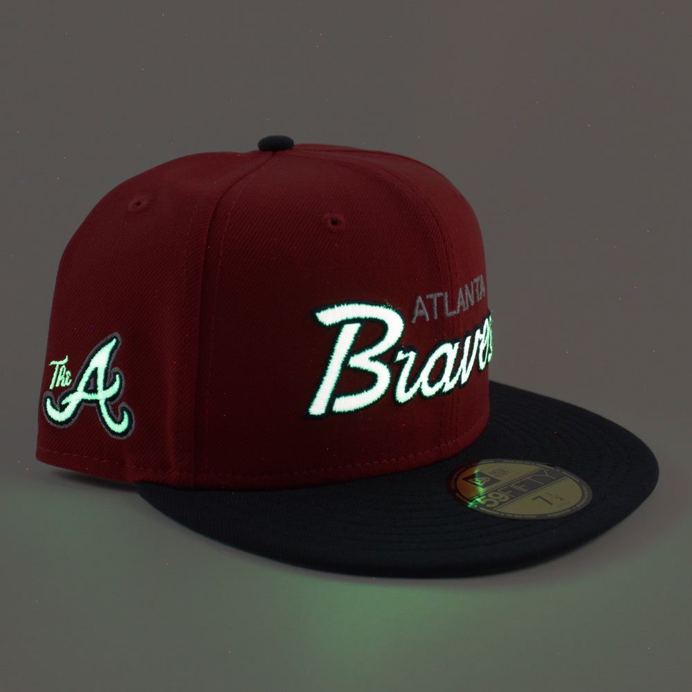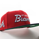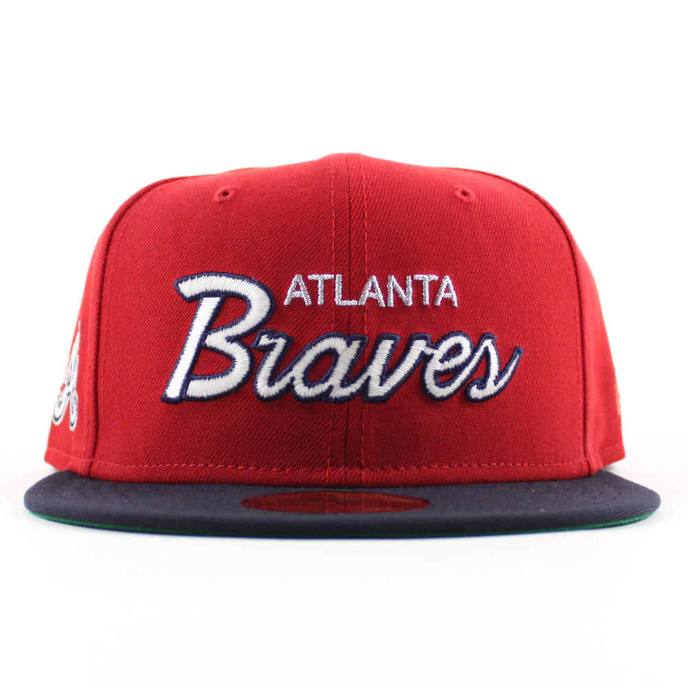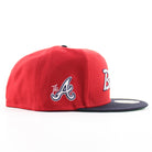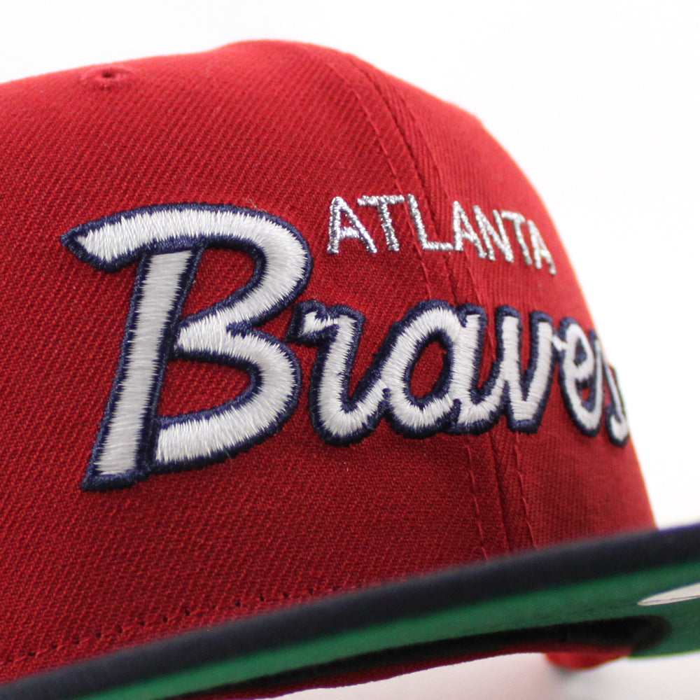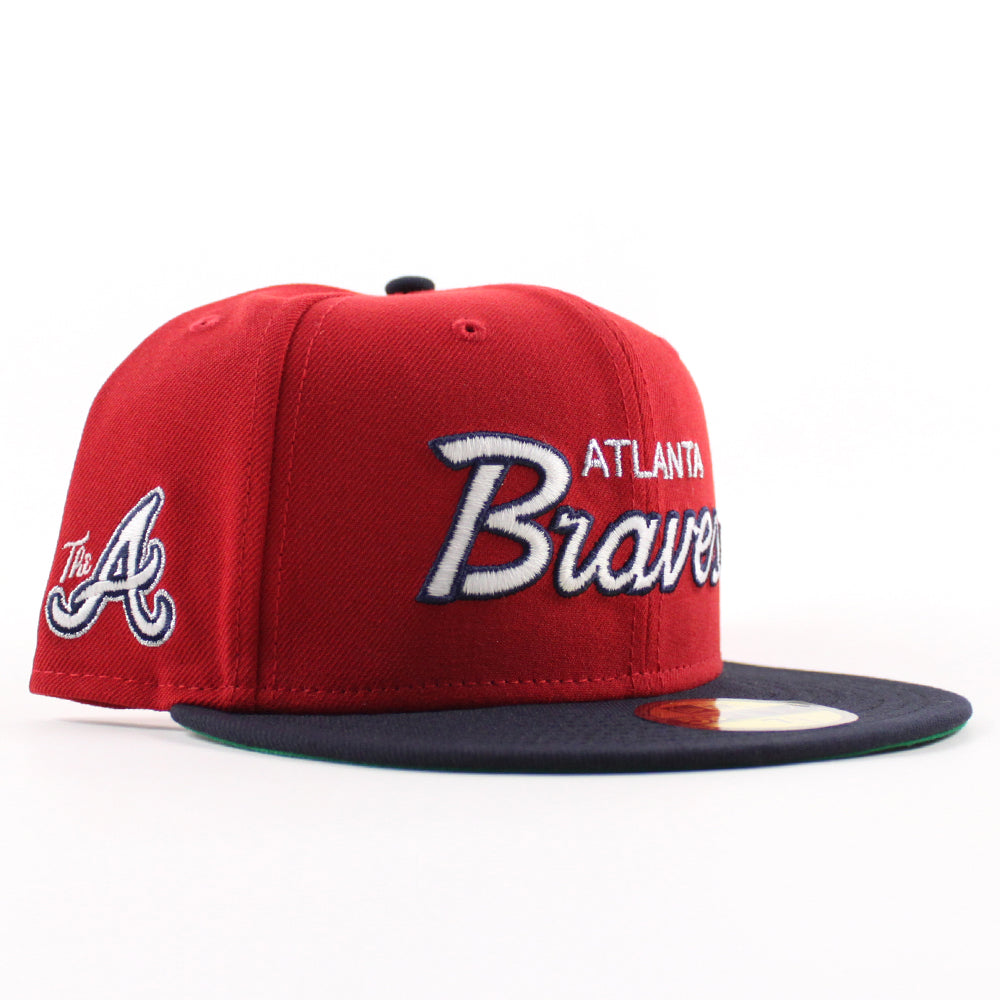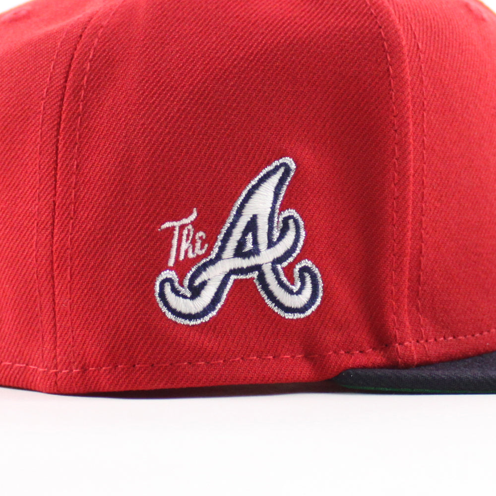Atlanta Braves "The A" Patch New Era 59Fifty Fitted Hat in Scarlet Red, Navy and Green Under Brim.