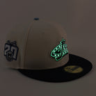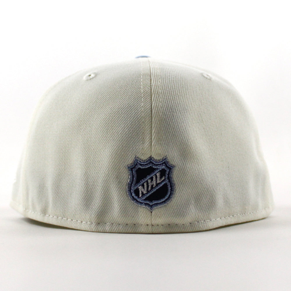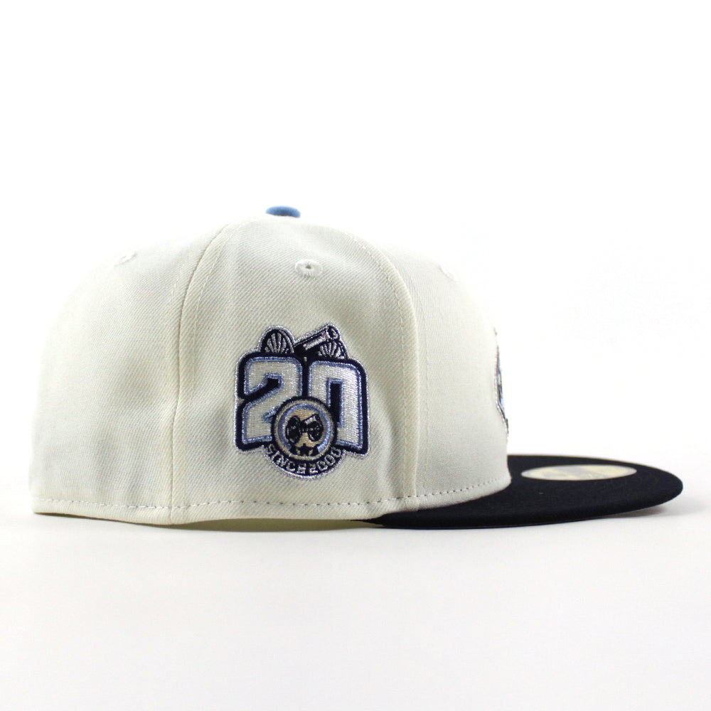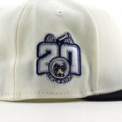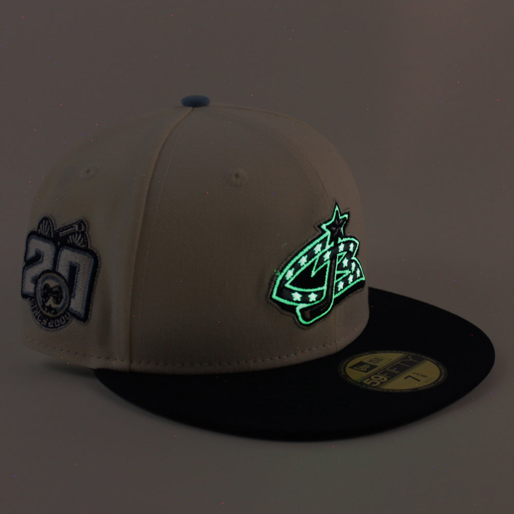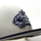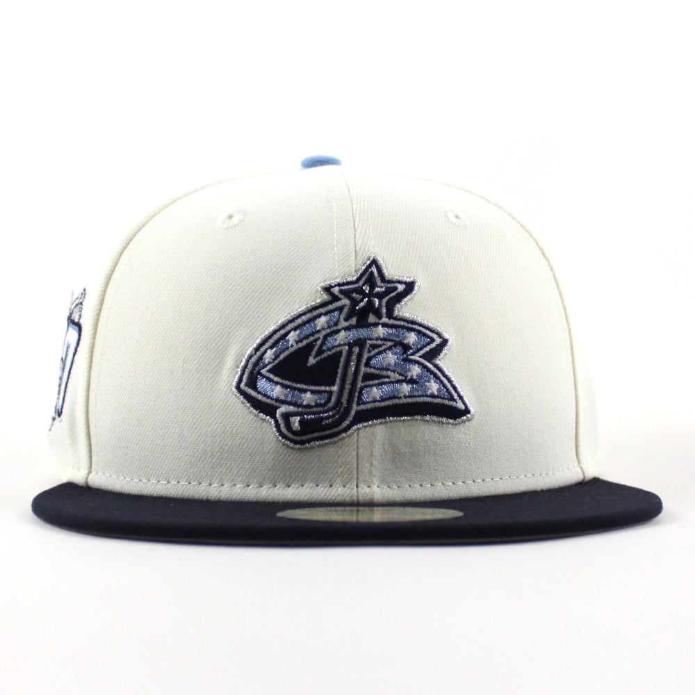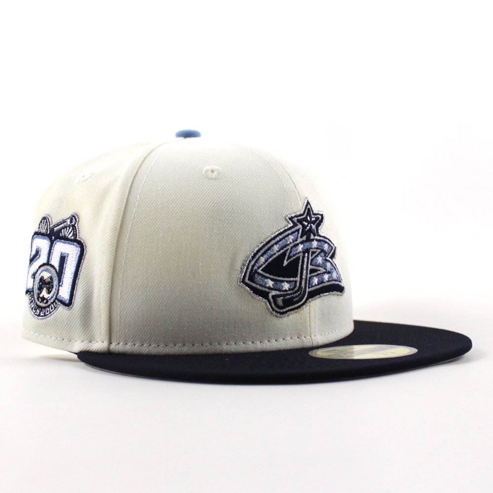 Retro Columbus Blue Jackets 20 Years New Era 59Fifty Fitted Hat in Chrome White, Navy and Gray Under brim.
