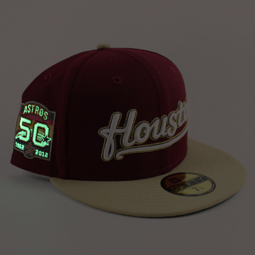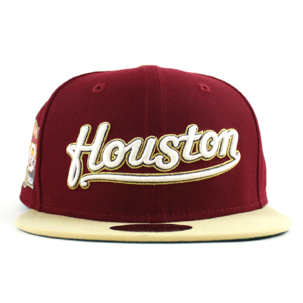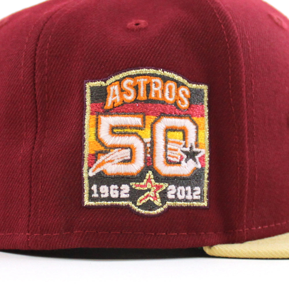 Houston Astros 50th Anniversary New Era 59Fifty Fitted Cap in Cardinal, Vegas Gold and Green Under Brim.
