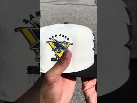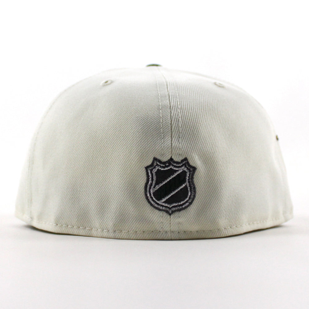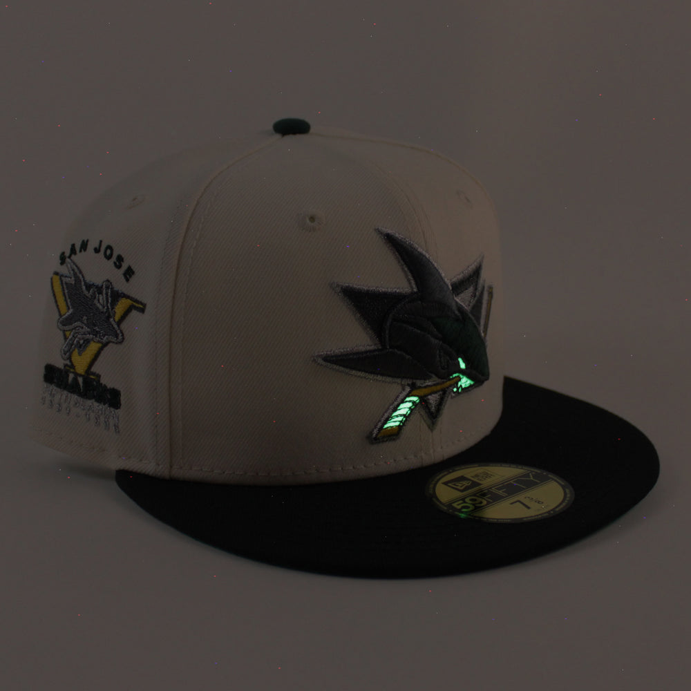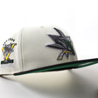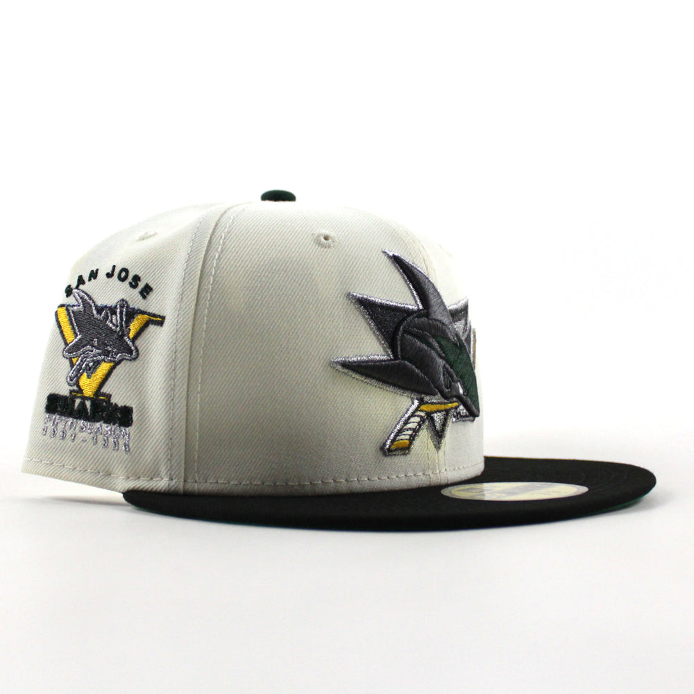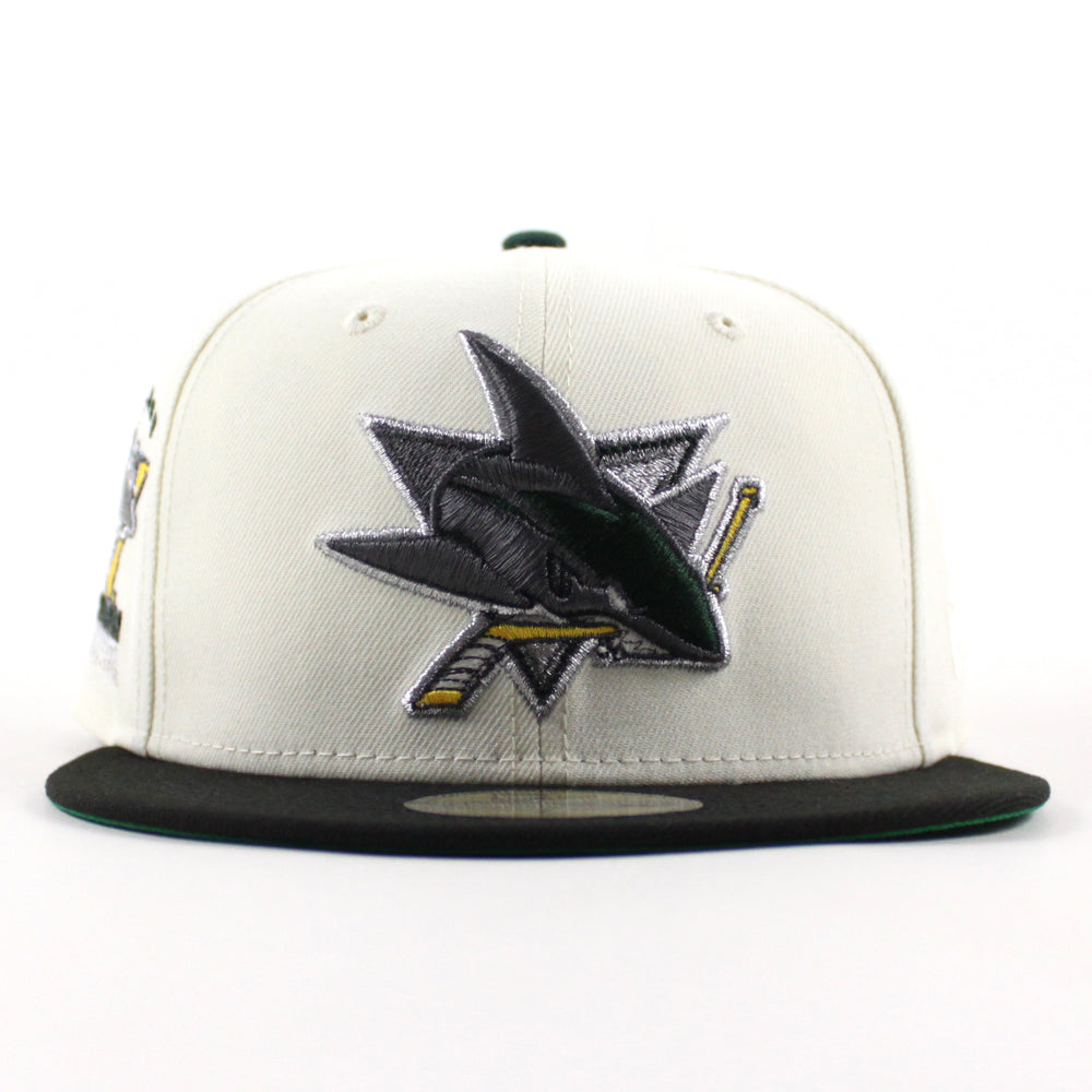 Retro San Jose Sharks 5th Season New Era 59Fifty Fitted Hat in Chrome White, Black with Green Under Brim.