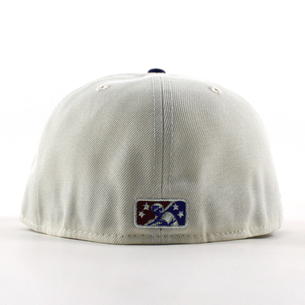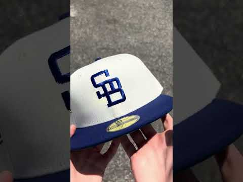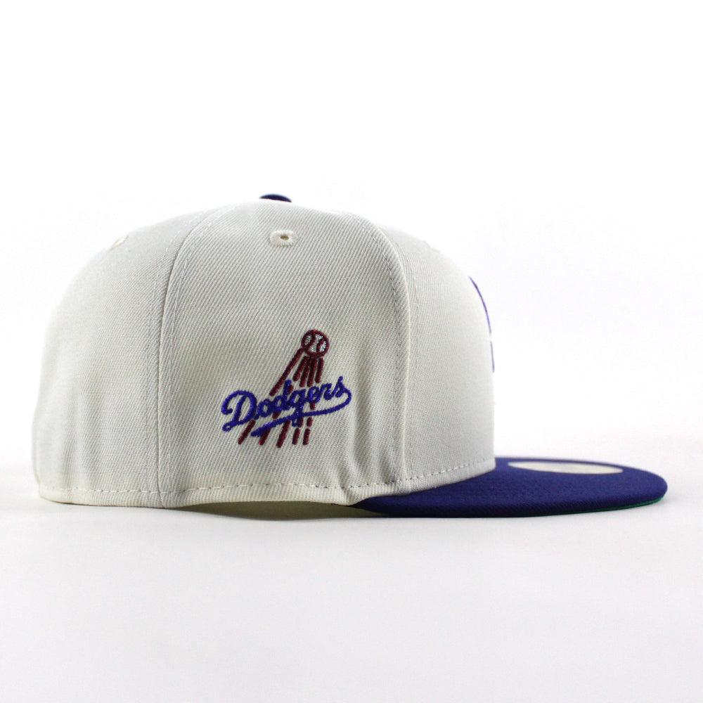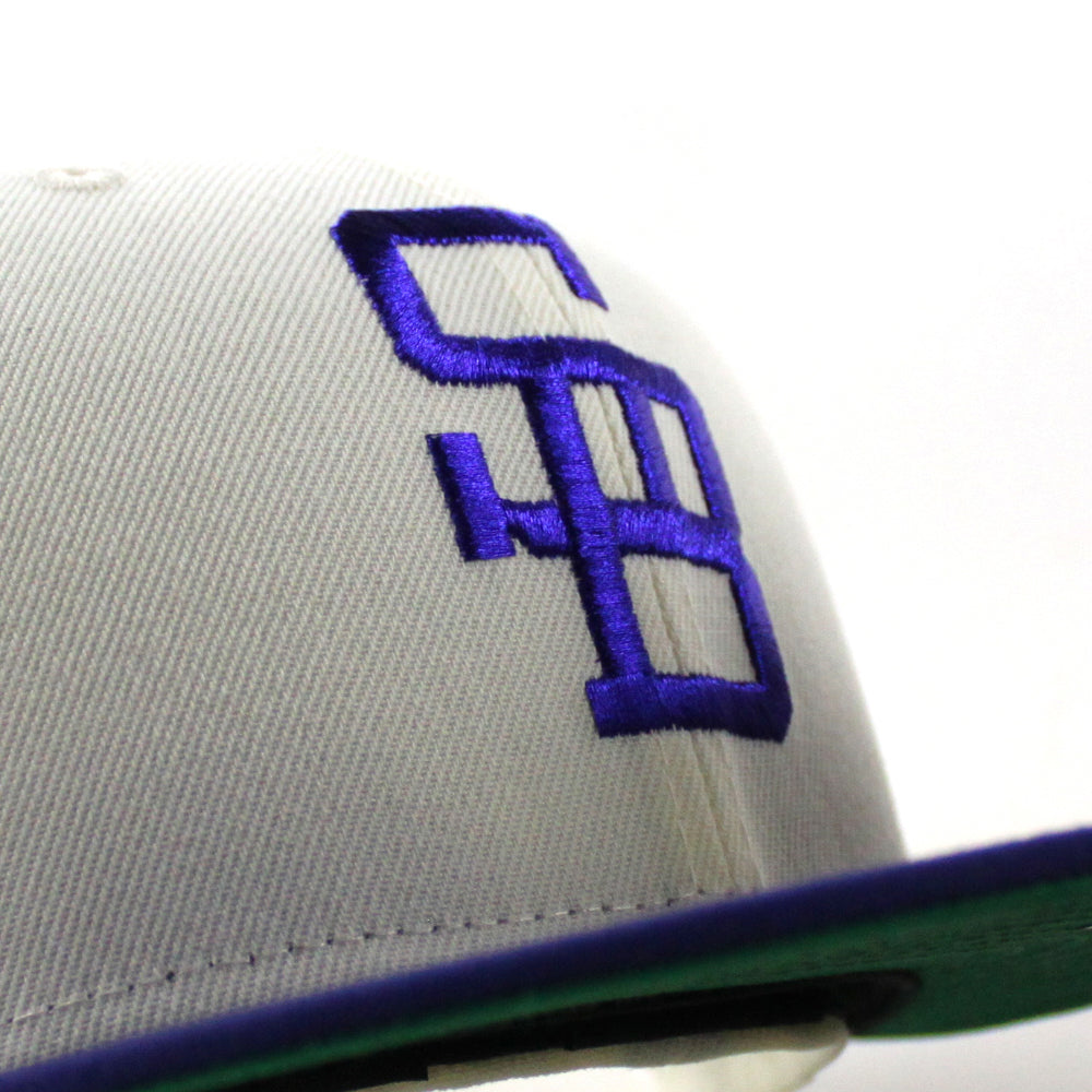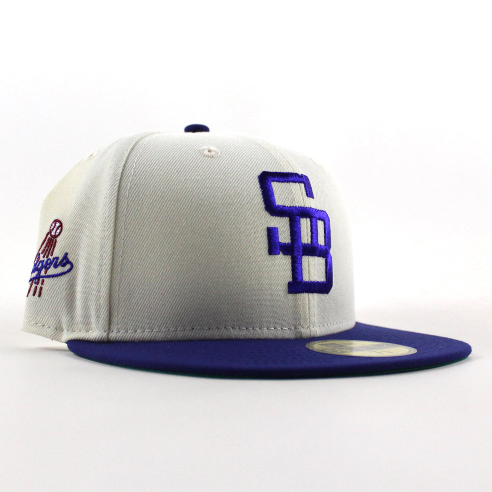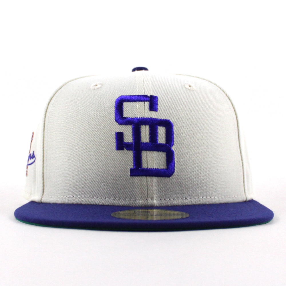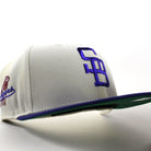 Santa Barbara Dodgers Patch 59Fifty New Era Fitted Cap in Chrome White with Royal Blue and Green Under Brim.
