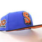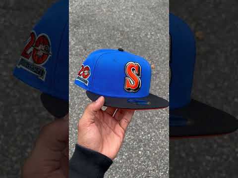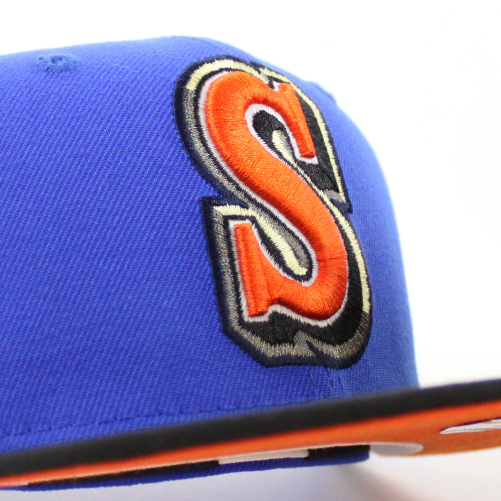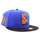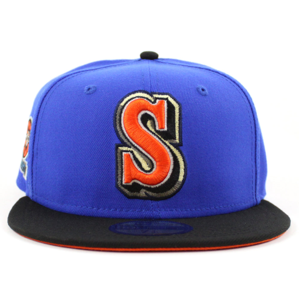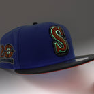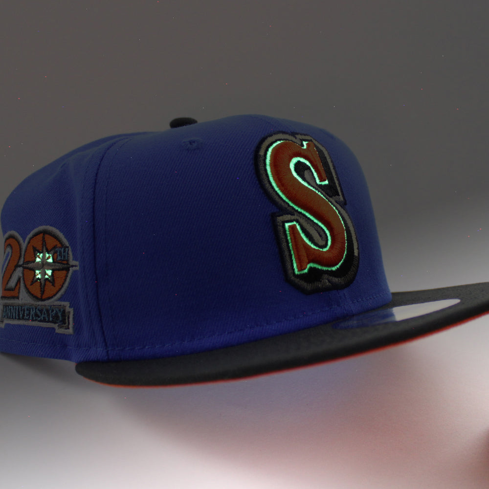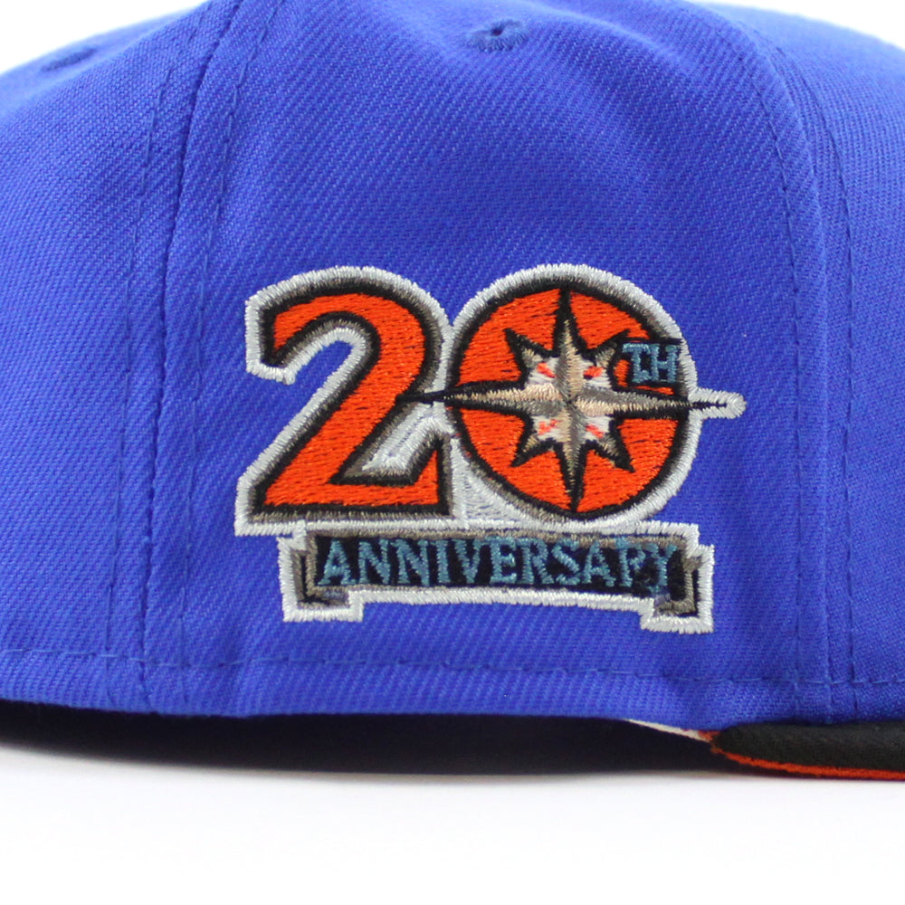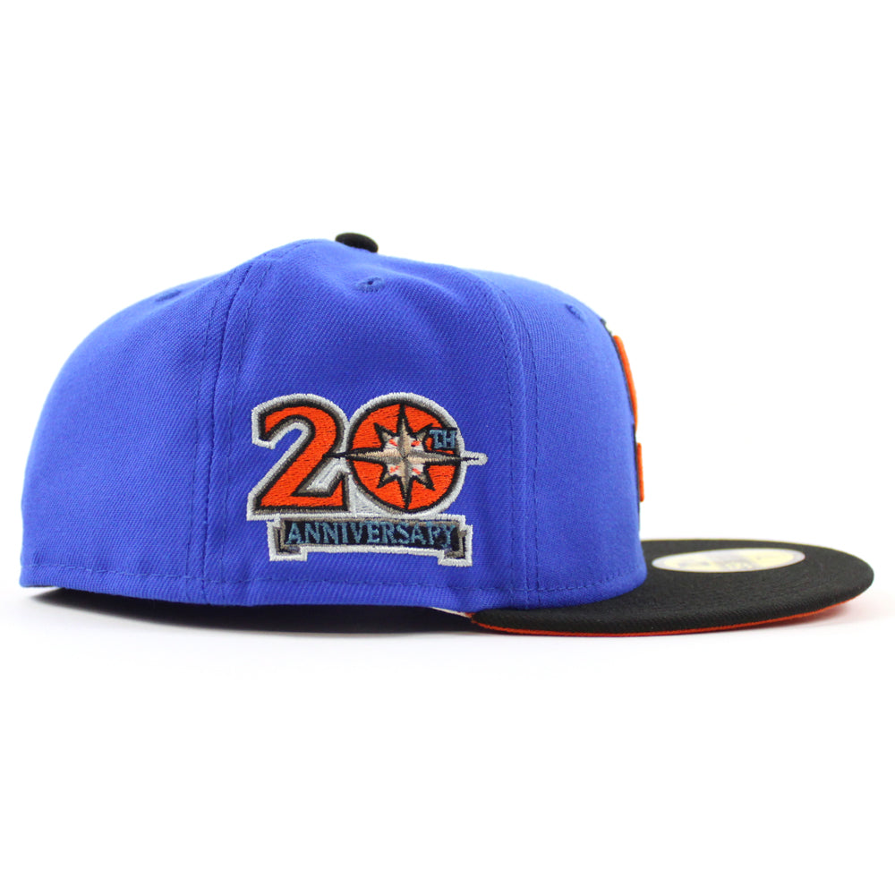 Seattle Mariners 20th Anniversary New Era 59Fifty Fitted Hat in Blue Bead, Black and CountDown Orange Under Brim.