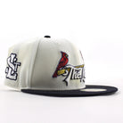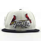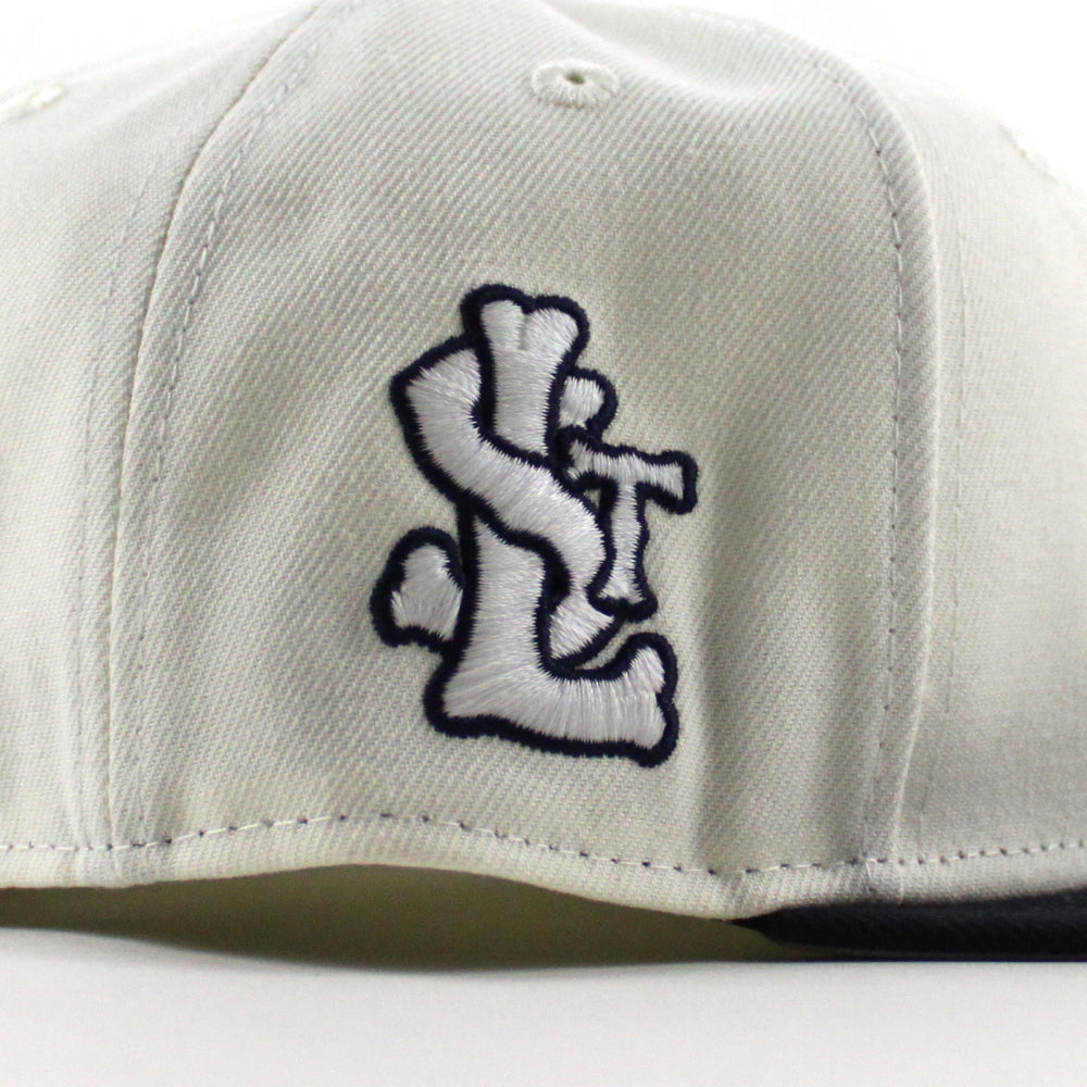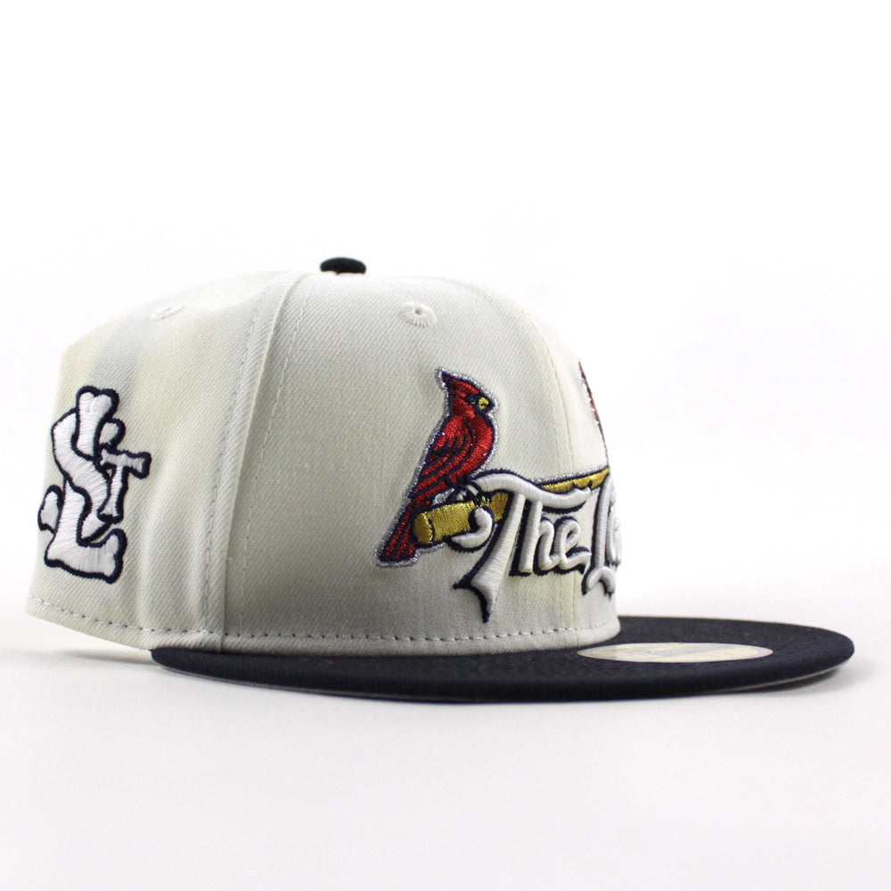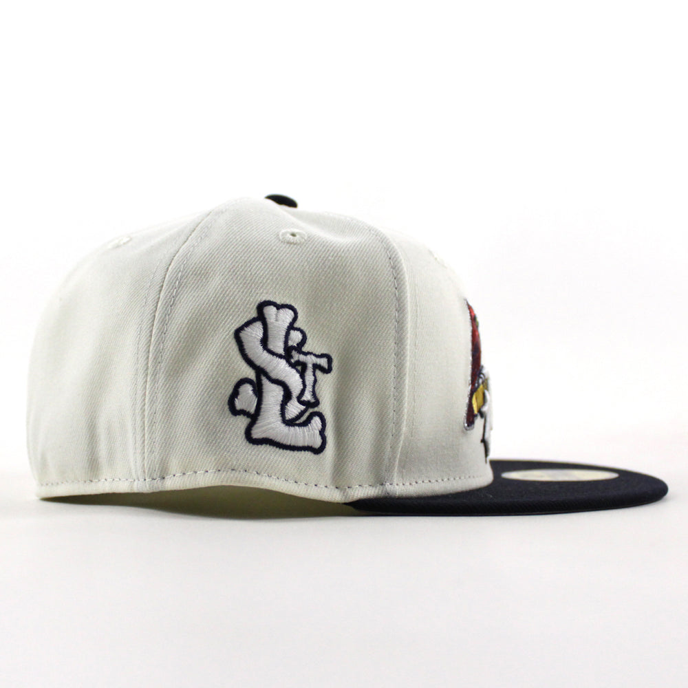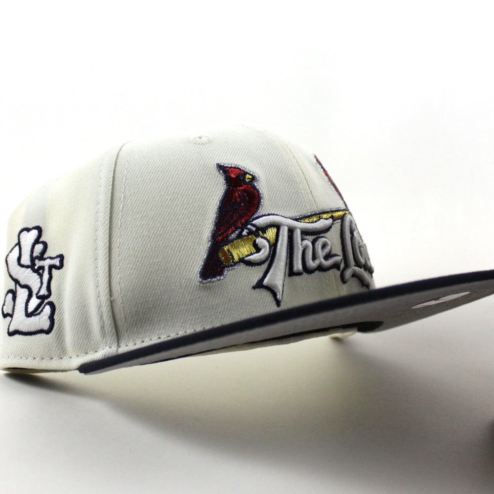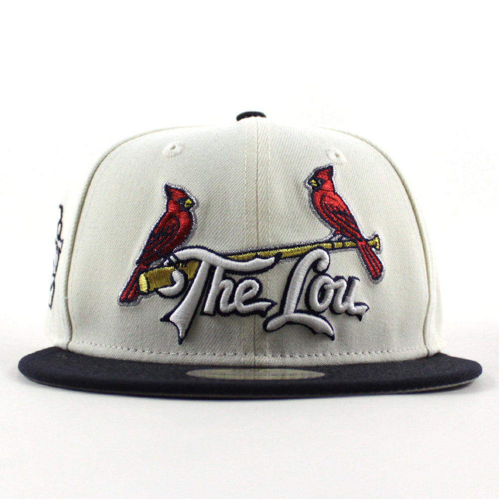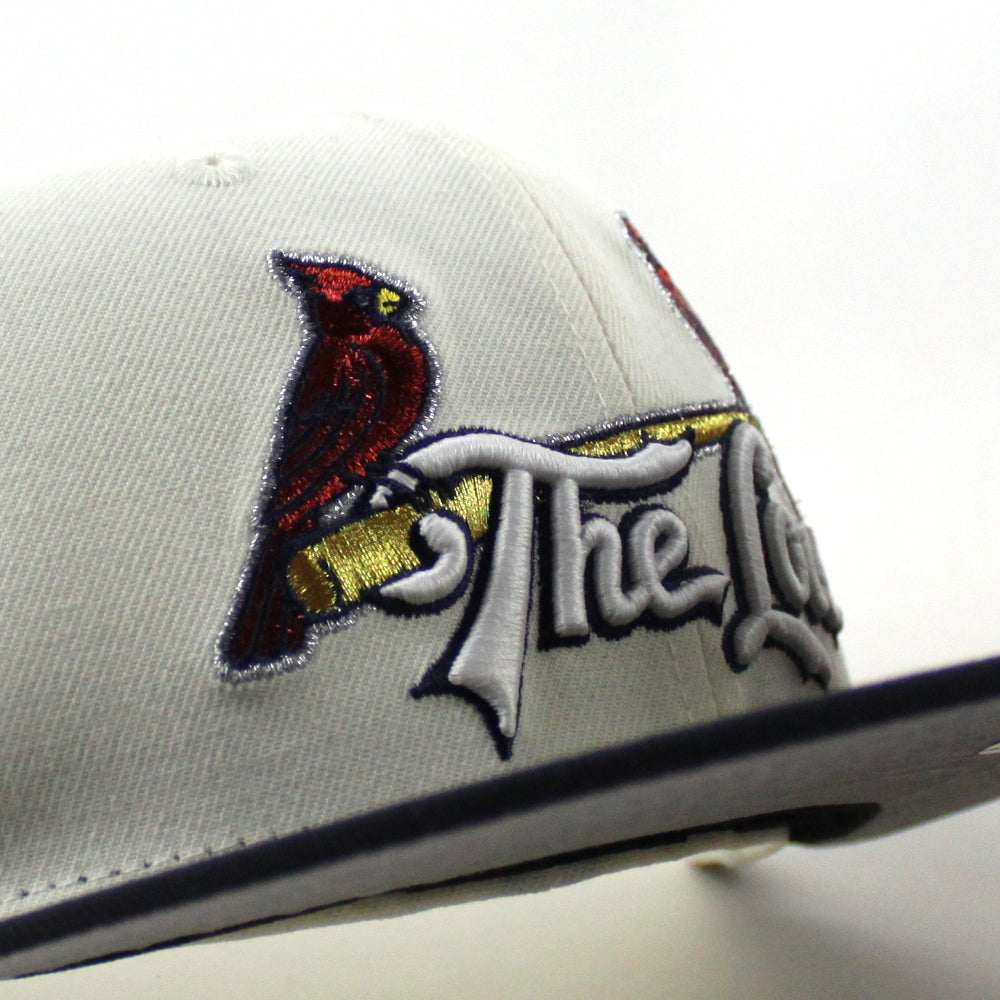 The Lue St. Louis Cardinals The Lou STL Patch New Era 59Fifty Fitted Hat in Chrome White, Navy and Gray Under Brim.