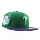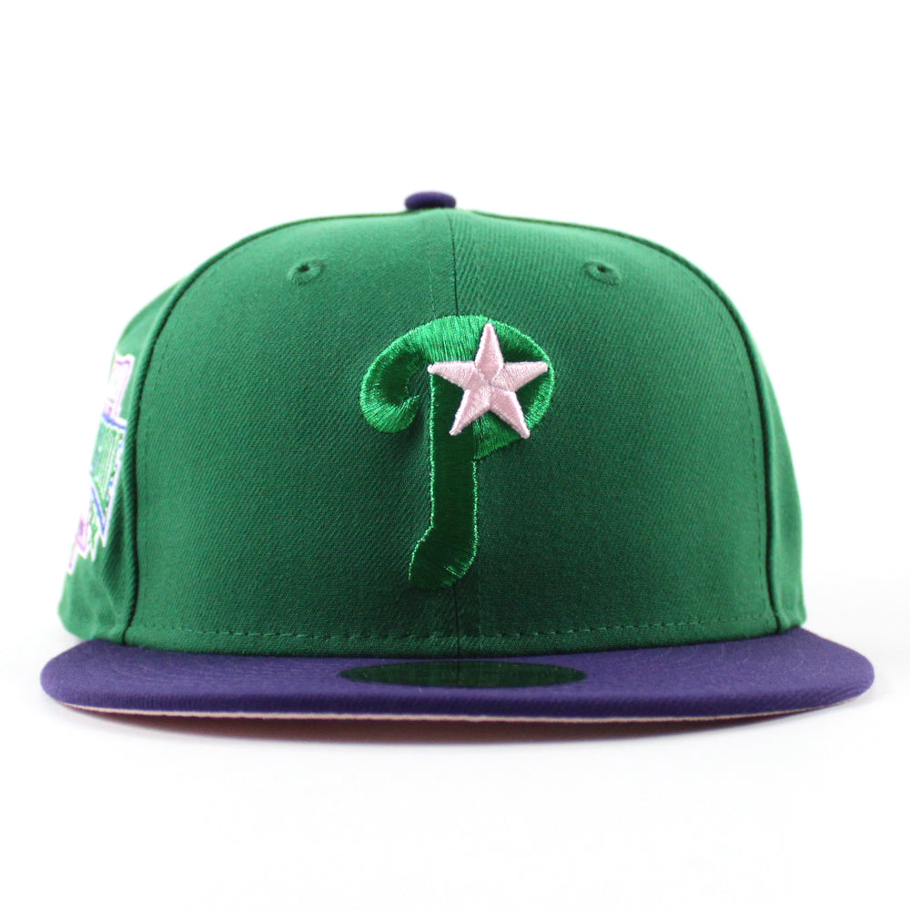 Philadelphia Phillies 1996 All Star Game 59Fifty New Era Fitted Hat in Kelly Green and Purple With a Pink Under Brim.