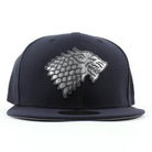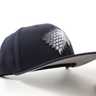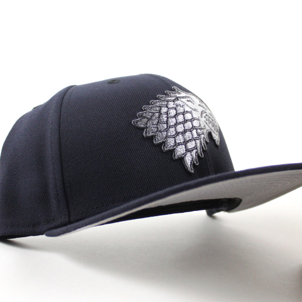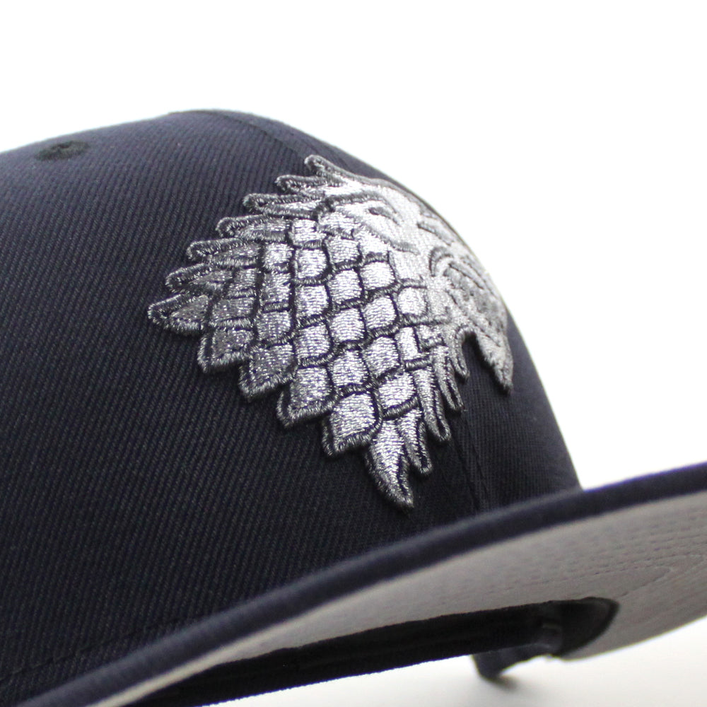Game of Thrones House Stark of Winterfell Direwolf New Era 59Fifty Fitted Hat is Navy and Gray with Gray Under Brim.