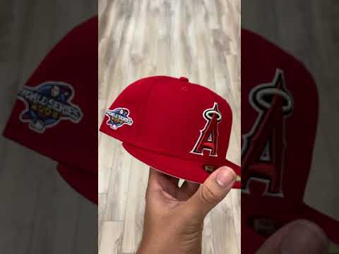 Anaheim Angels 2002 World Series New Era 59Fifty Fitted Hat is Red & Pink Under Brim.