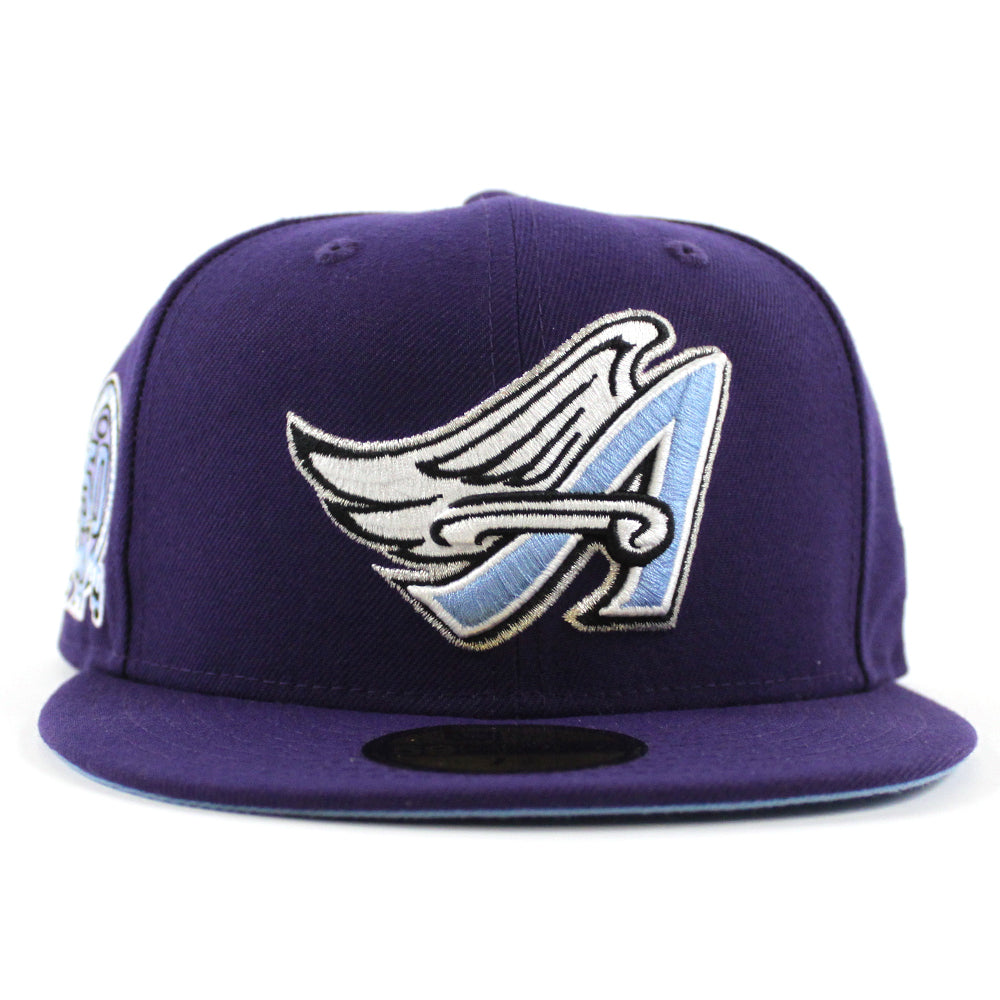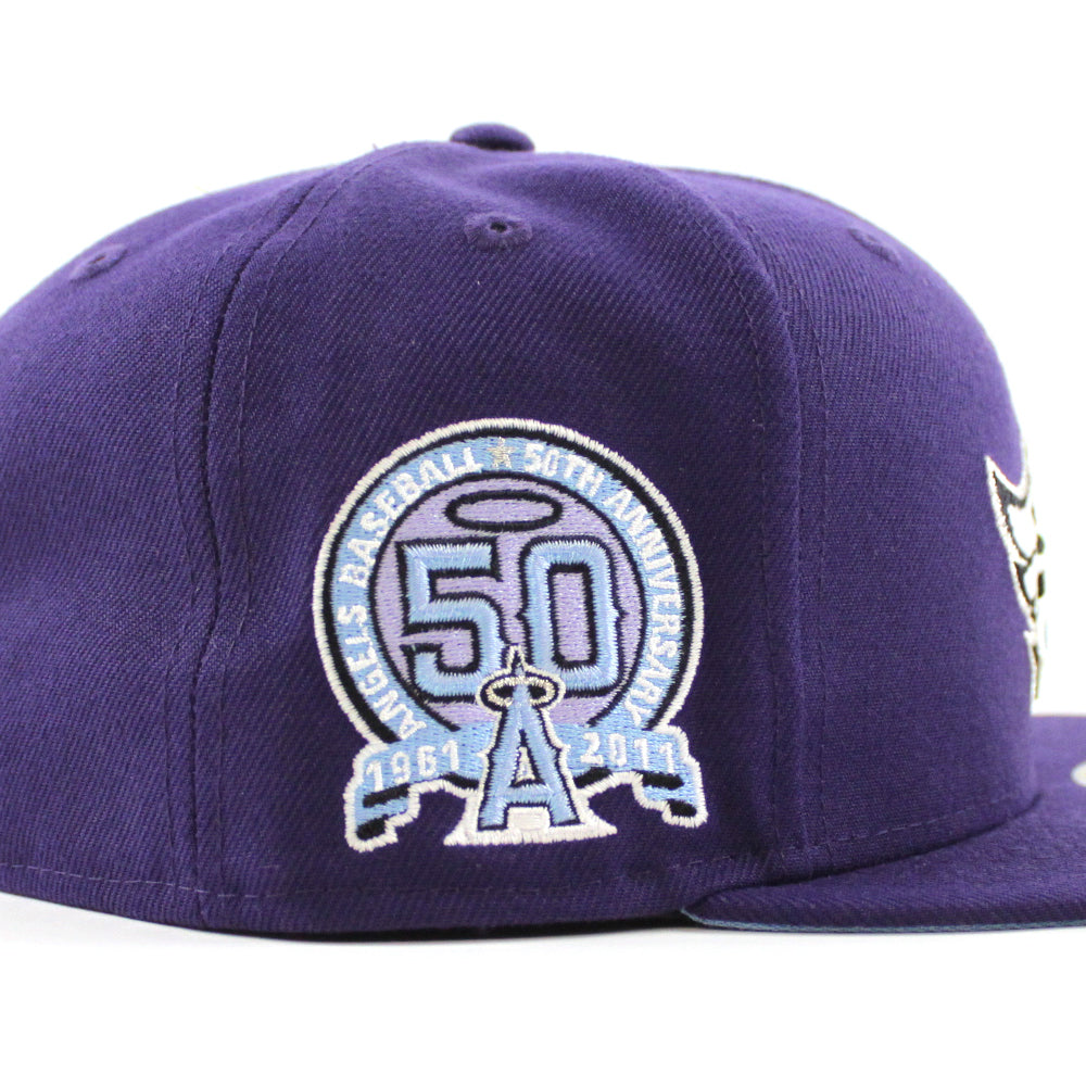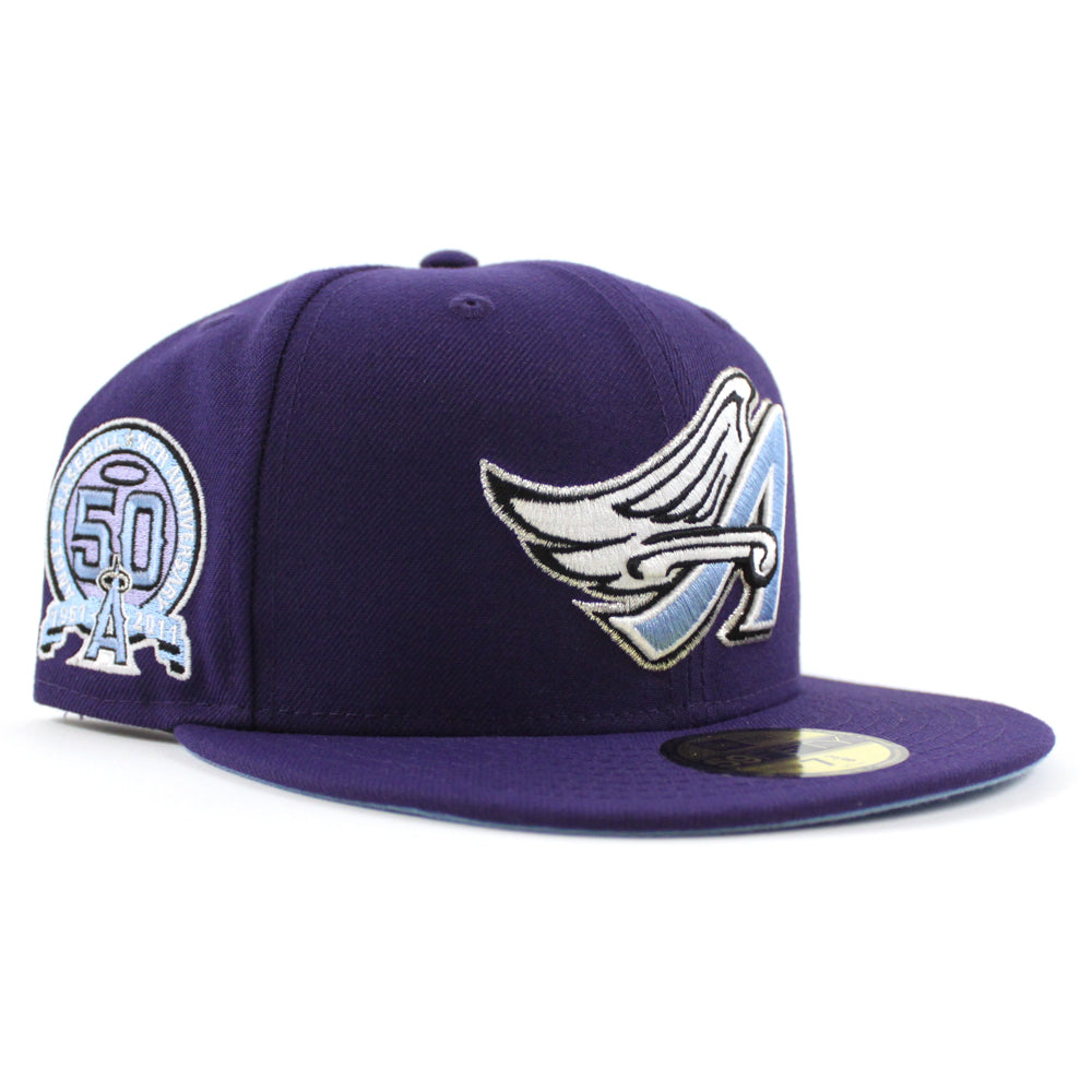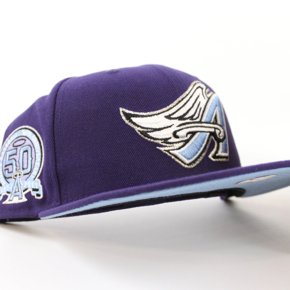 Anaheim Angels 50th Anniversary New Era 59Fifty Fitted Hat is Purple & Sky Blue Under Brim.