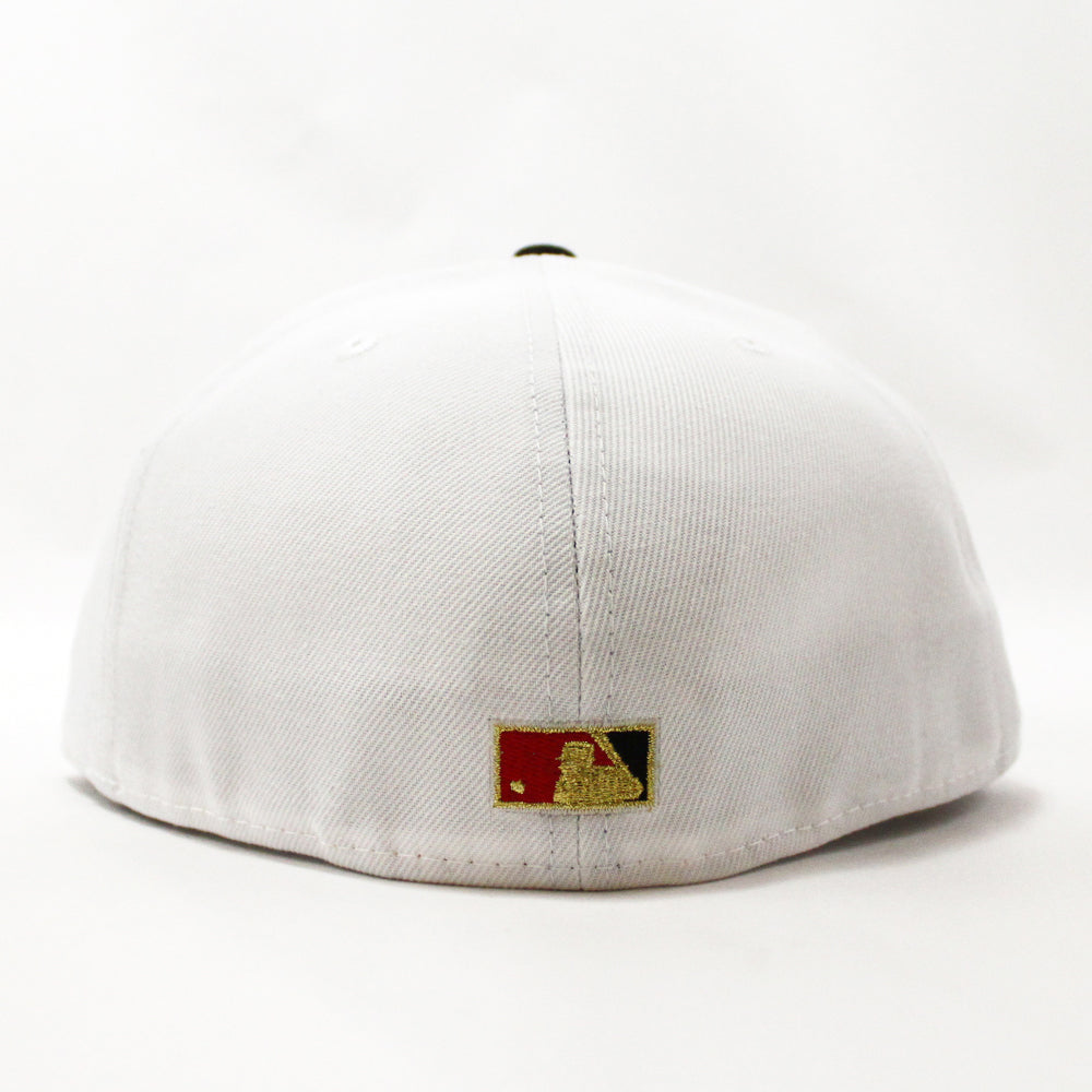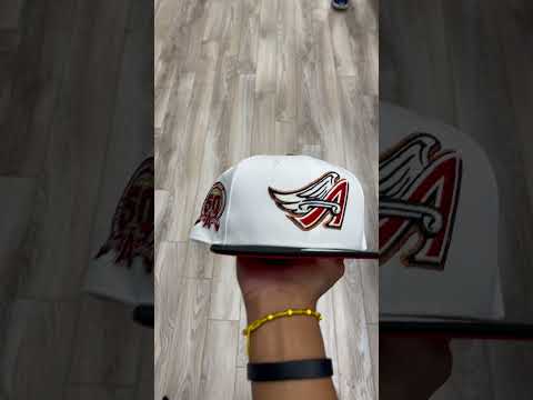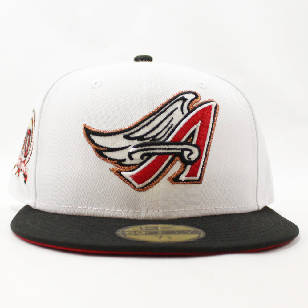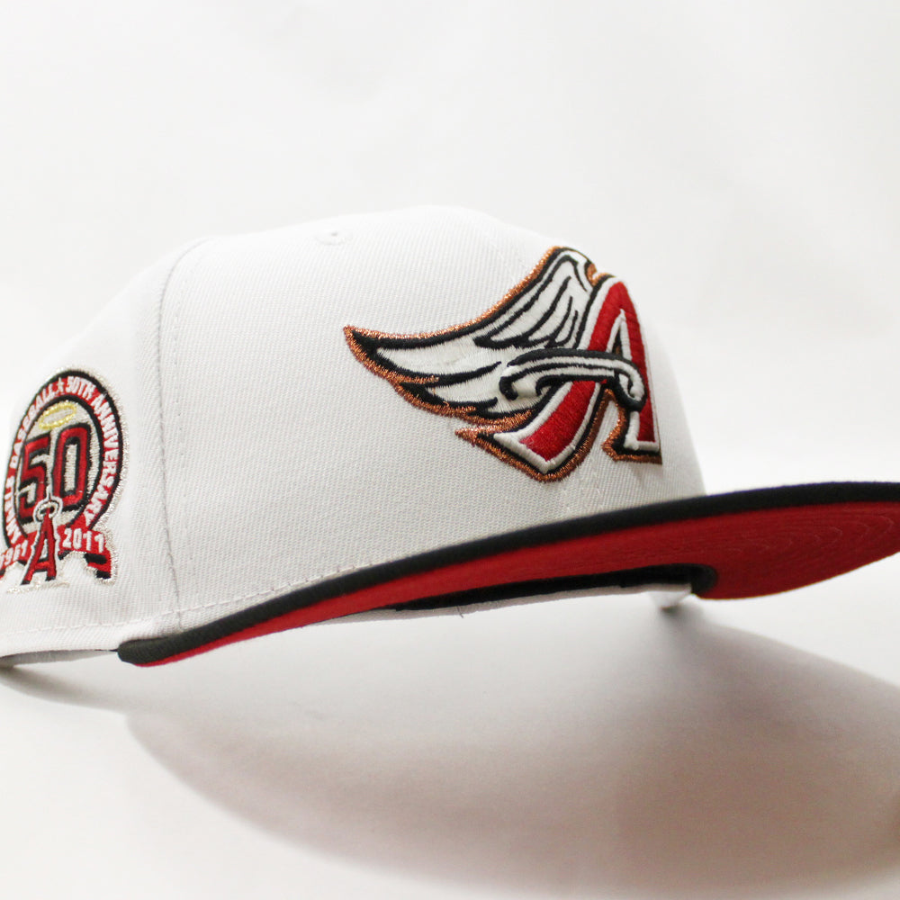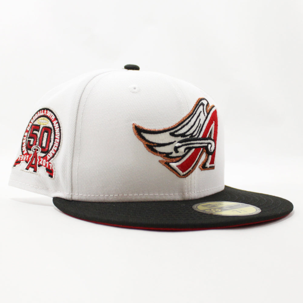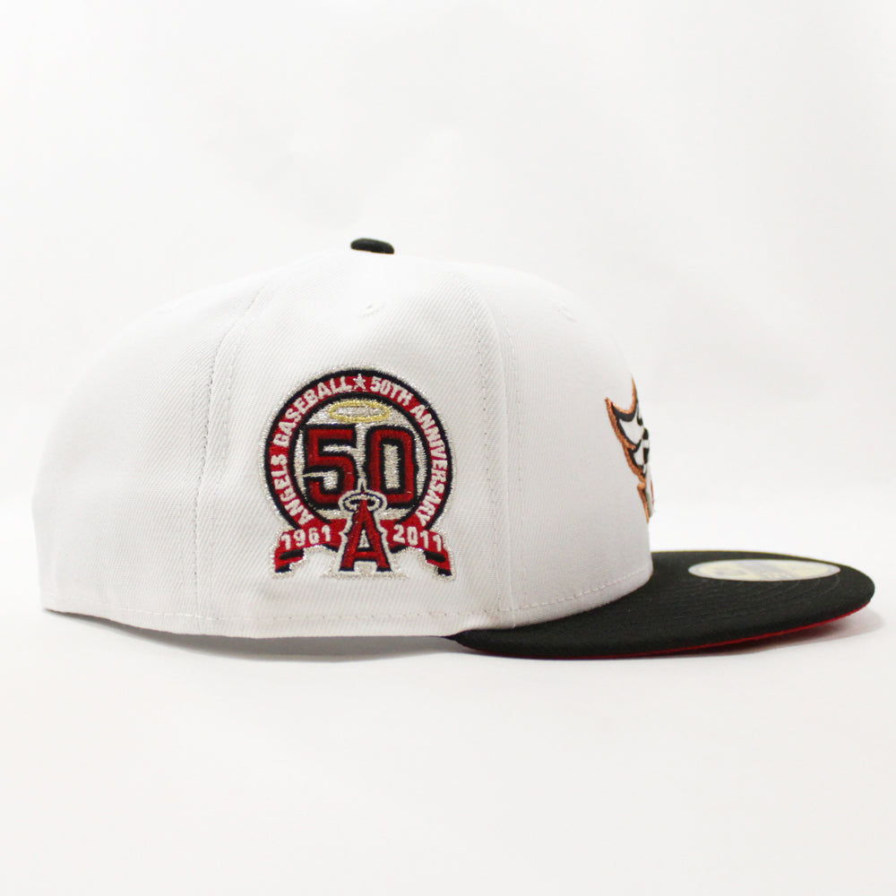 Anaheim Angels 50th Anniversary New Era 59Fifty Fitted Hat is White, Black & Red Under Brim.