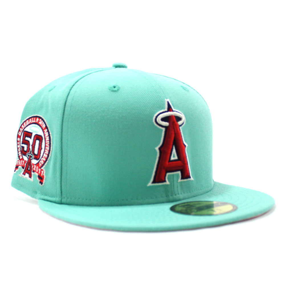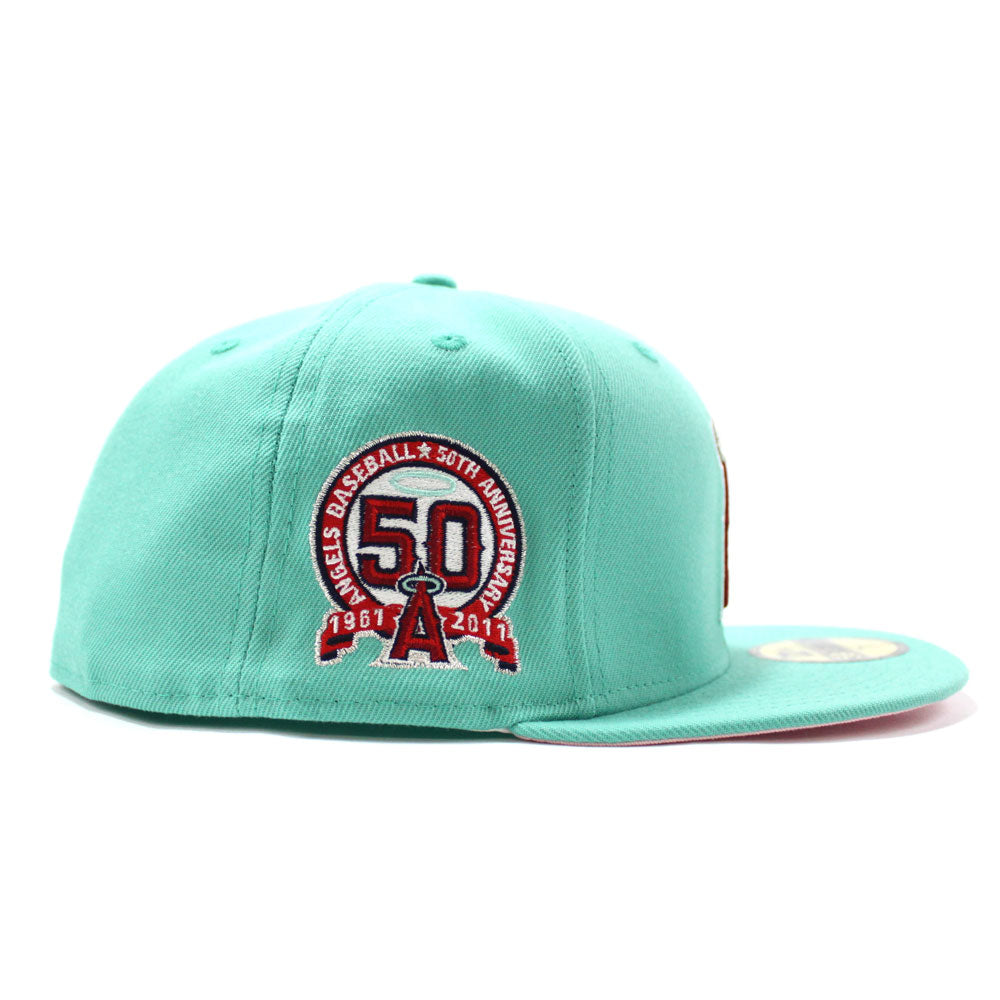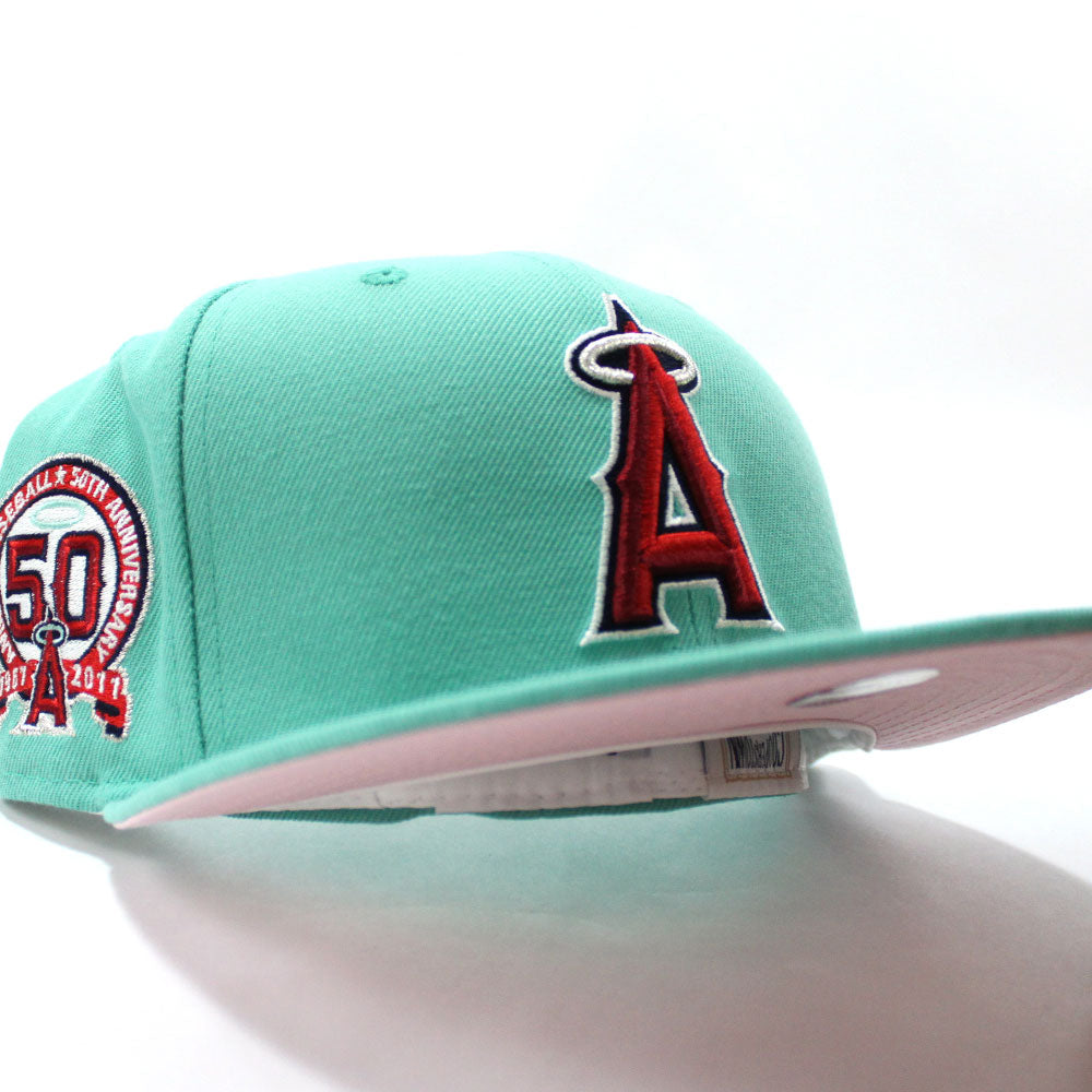 Anaheim Angels 50th Anniversity New Era 59Fifty Fitted Hat is Mint & Pink Under Brim.