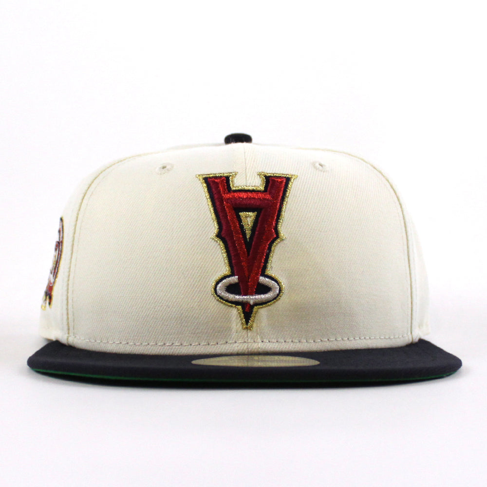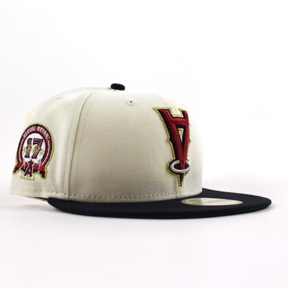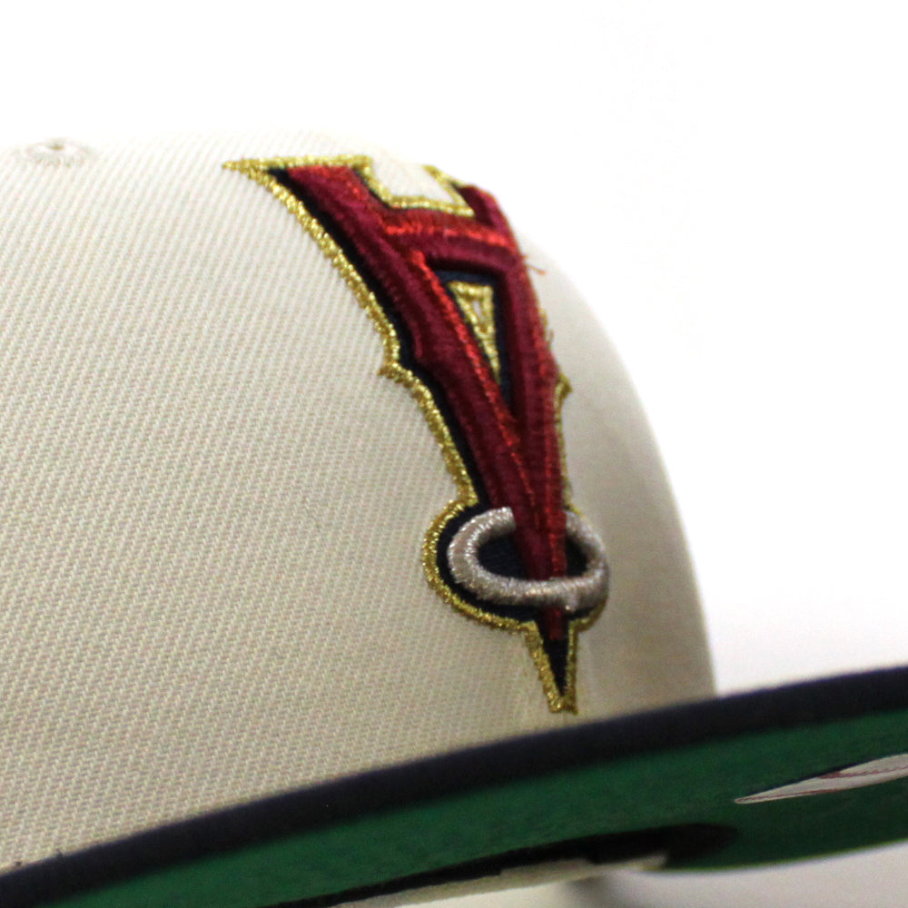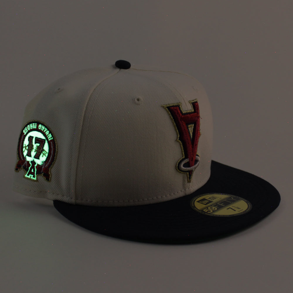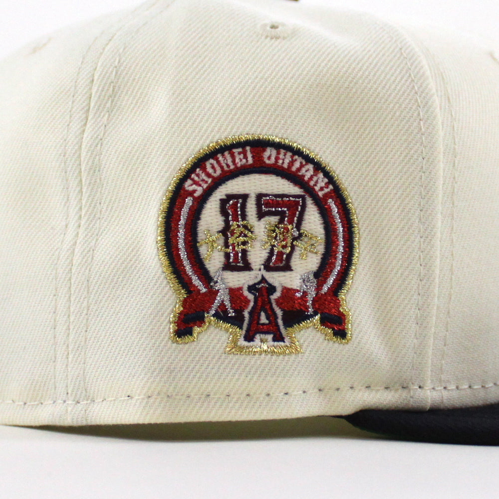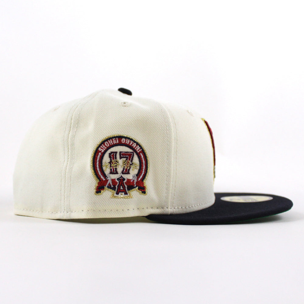 Anaheim Angels Upside Down Shohei Ohtani Patch New Era 59Fifty Fitted Cap in Chrome White, Navy and Green Under Brim.