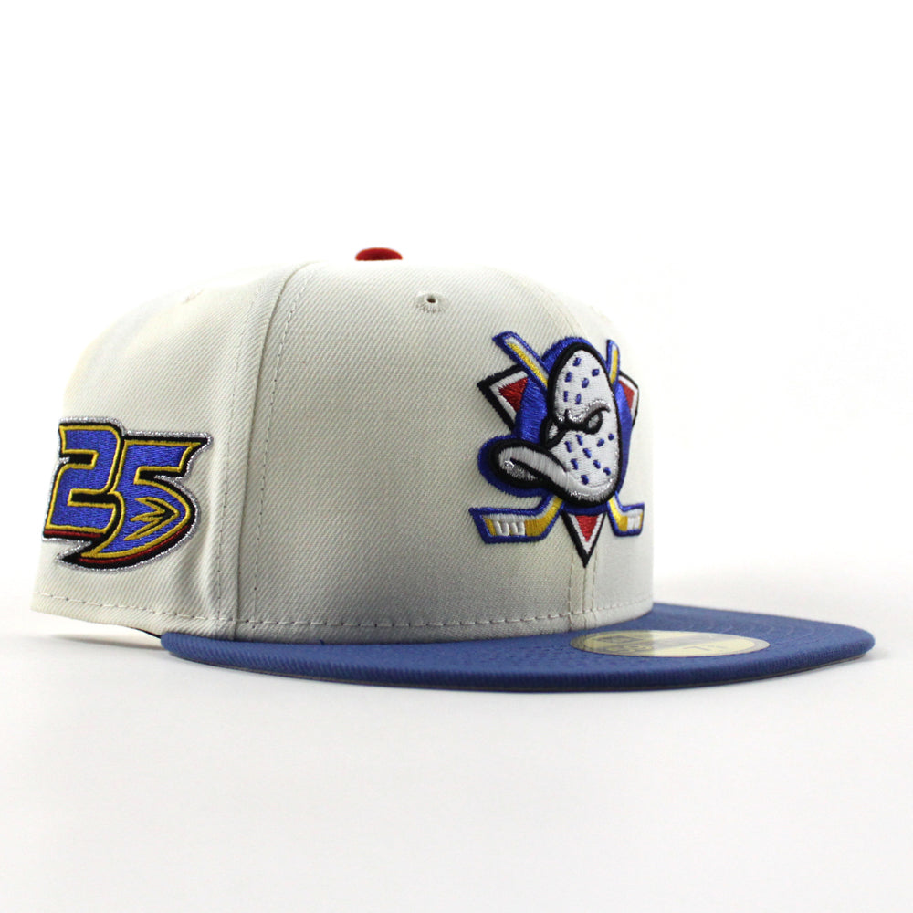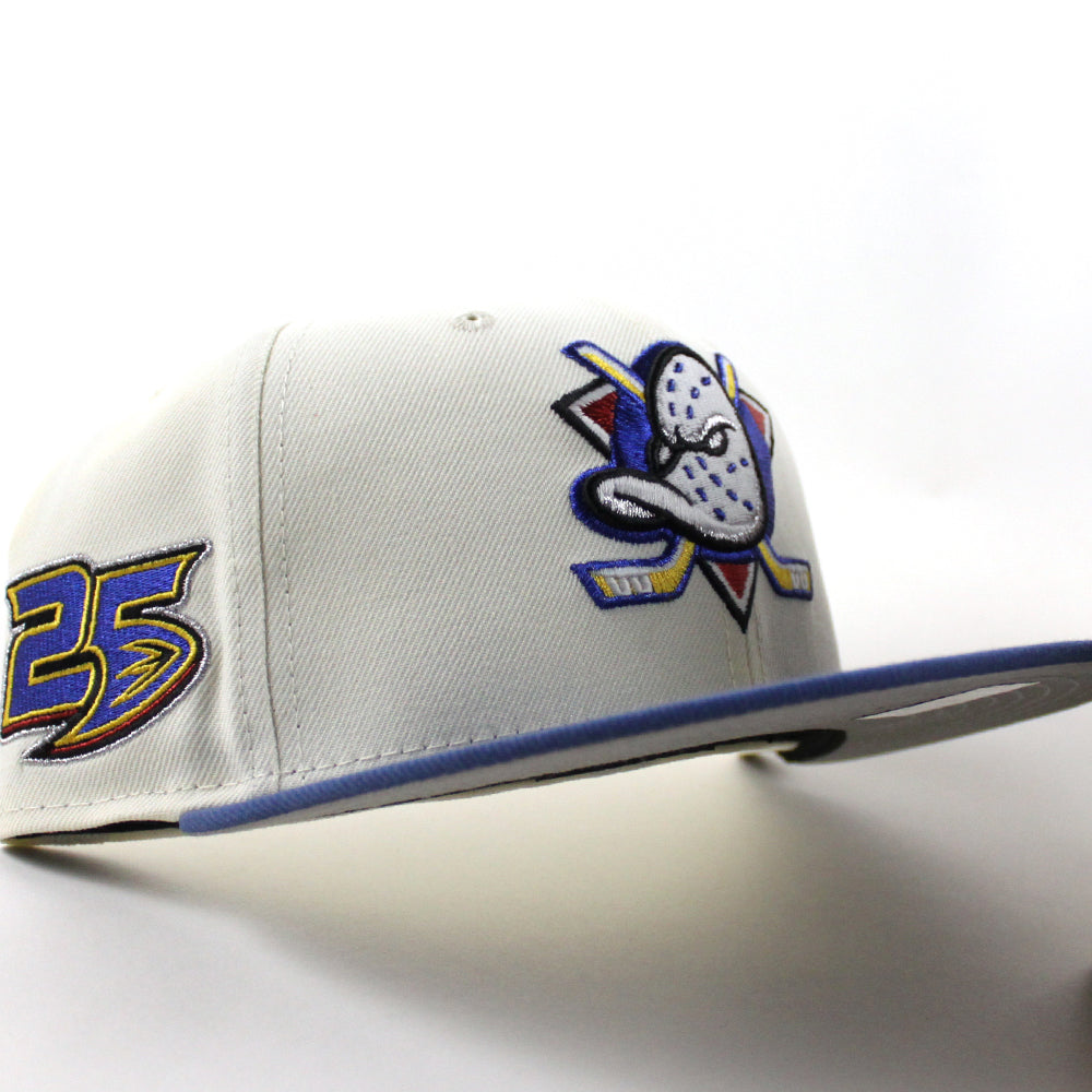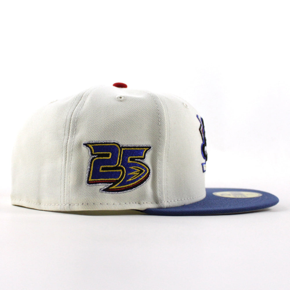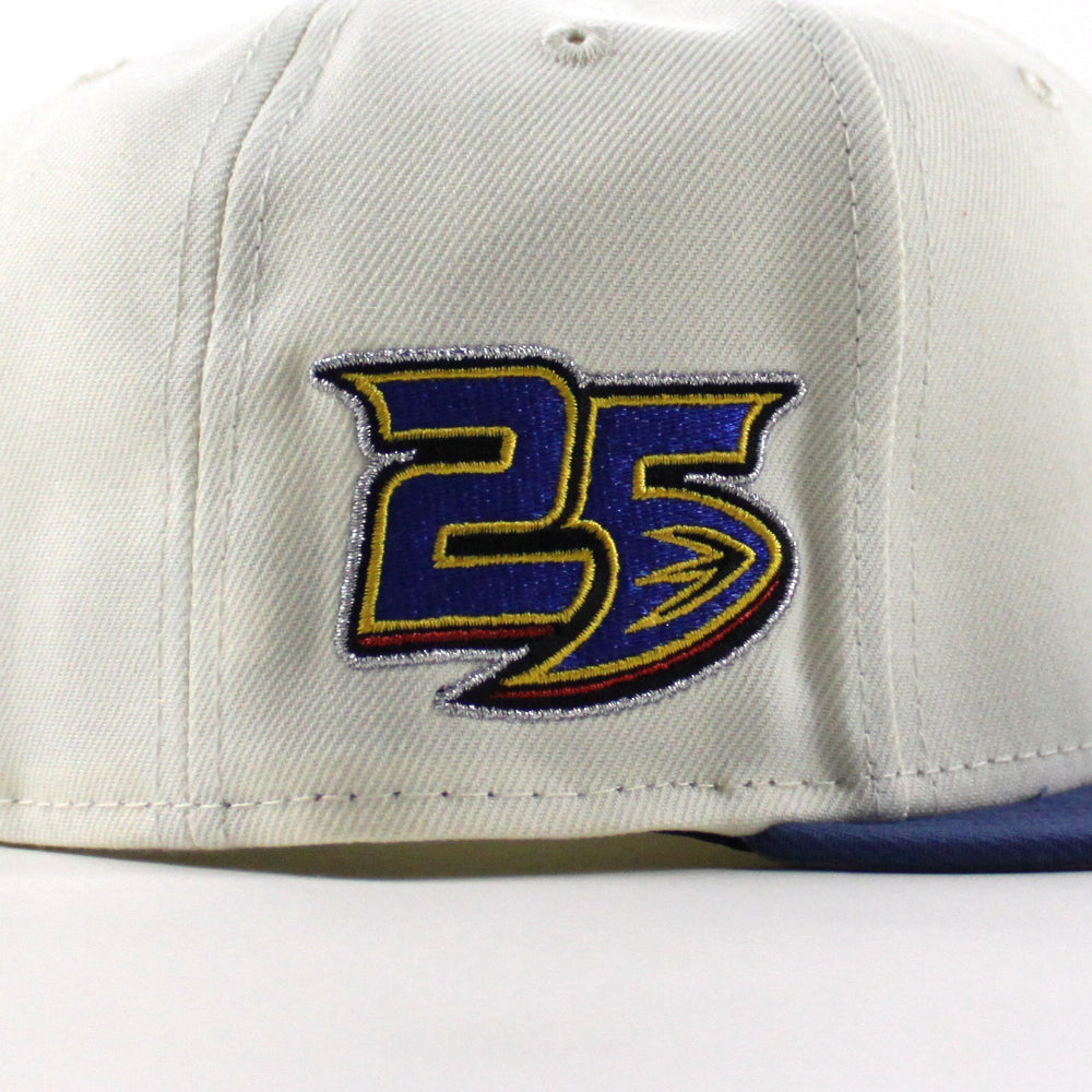 Anaheim Ducks 25 Years New Era 59Fifty Fitted Hat in Chrome White Royal Blue and Gray Under brim.