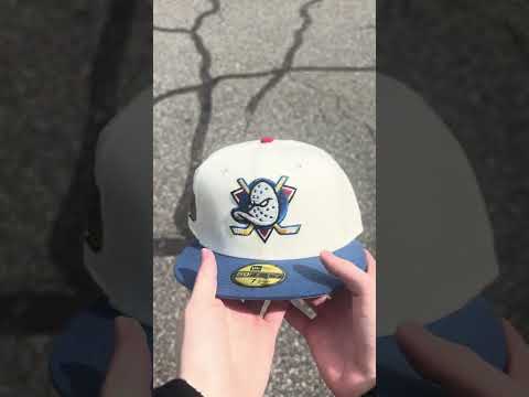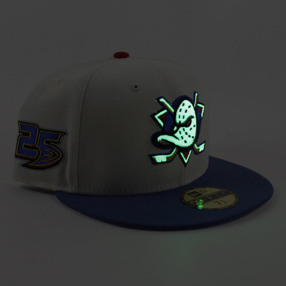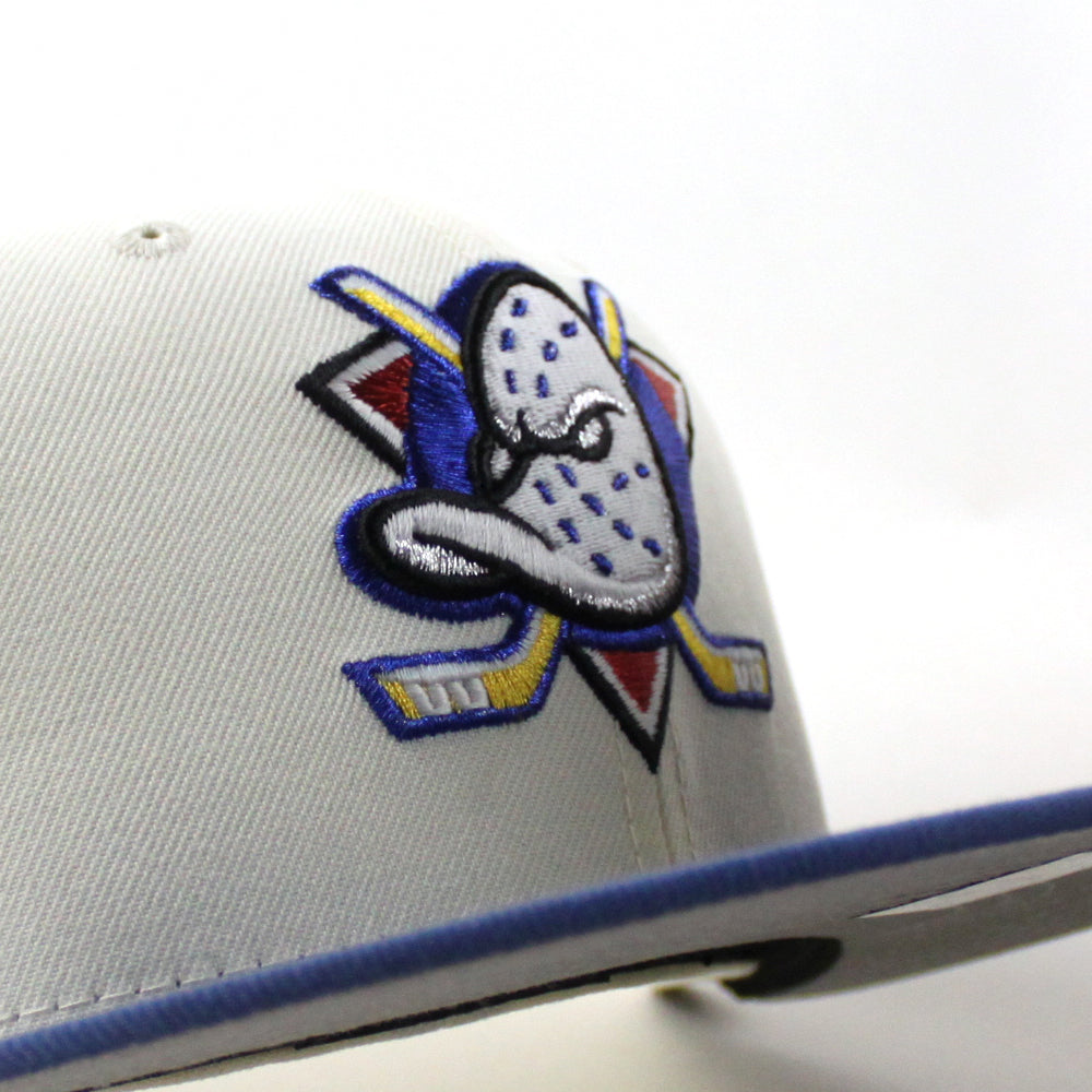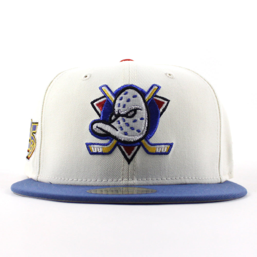 Anaheim Ducks 25 Years New Era 59Fifty Fitted Hat in Chrome White Royal Blue and Gray Under brim.
