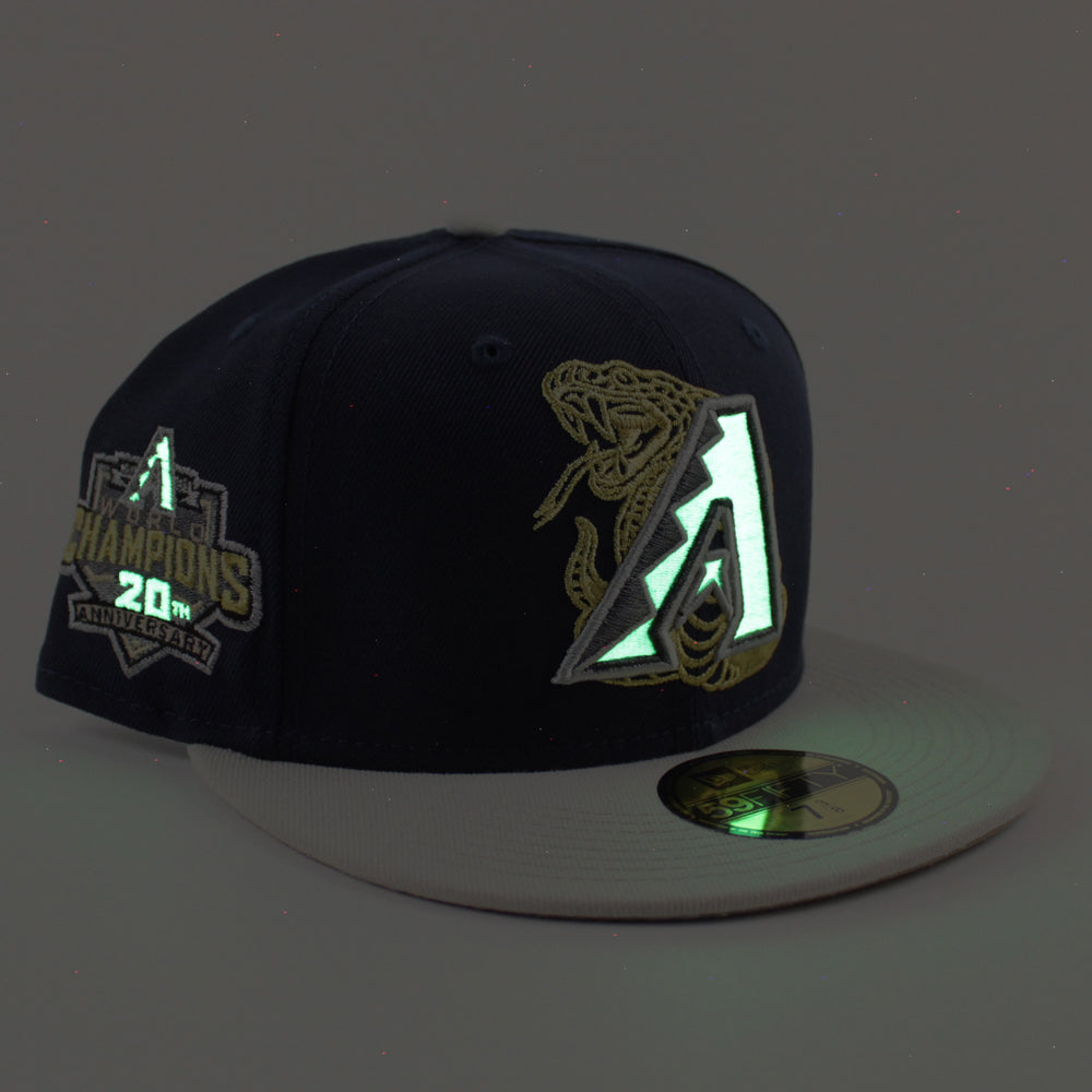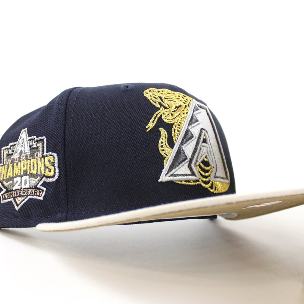 Arizona Diamondbacks 20th Anniversary New Era 59Fifty Fitted Hat in Night Shift, Stone and Khaki Under Brim with Metallic thread in the logo.