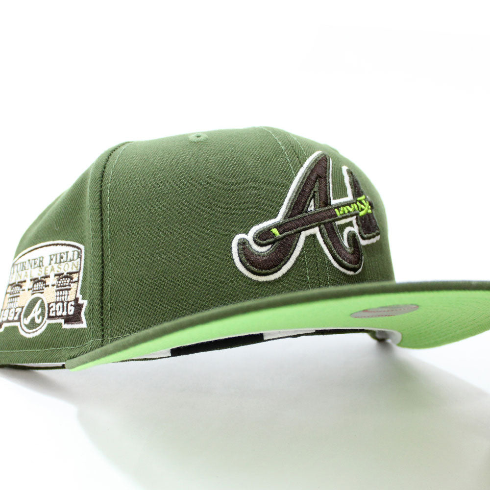 Atlanta Braves Turner Field Final Season New Era 59Fifty Fitted Hat in Hunter Green with a Lime Green Under Brim.