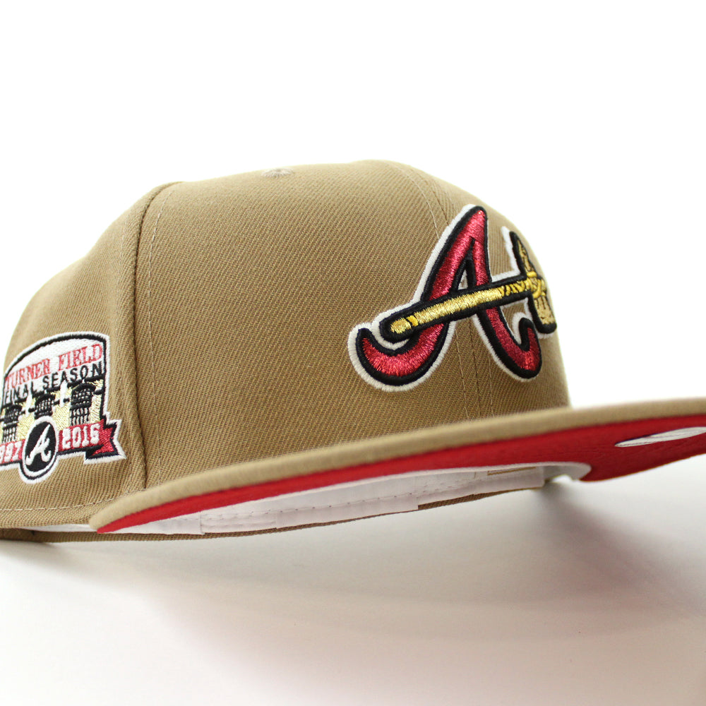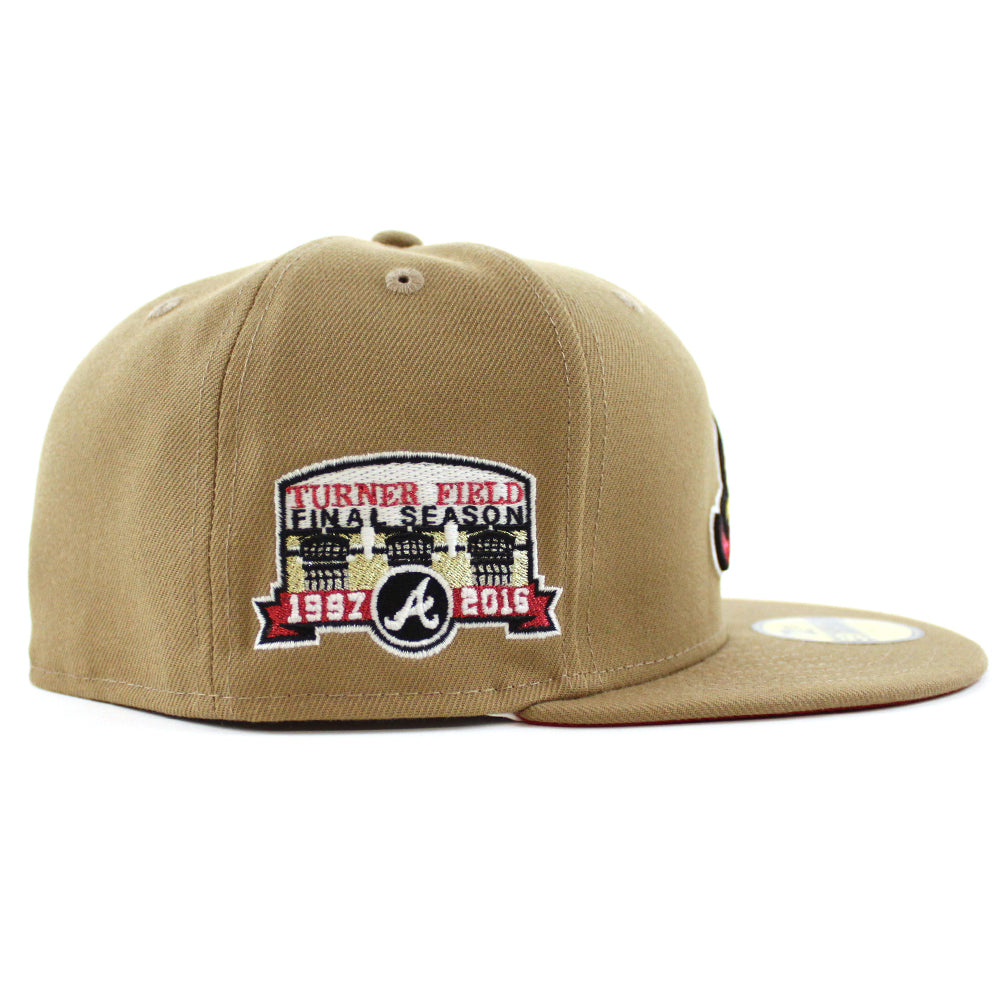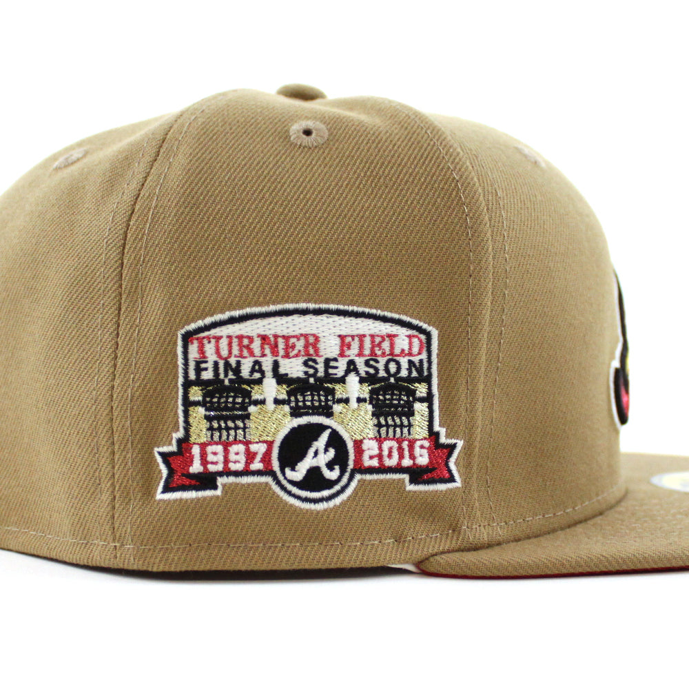 Atlanta Braves Turner Field Final Season New Era 59Fifty Fitted Hat in Khaki and Red Under Brim. Logo Color: M.Red/M.Gold/Black/GITD