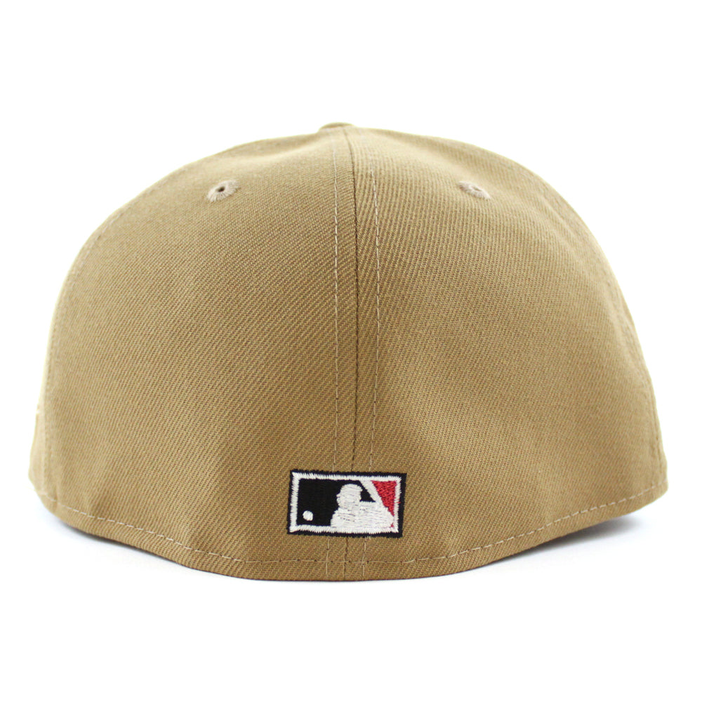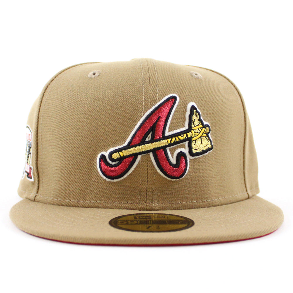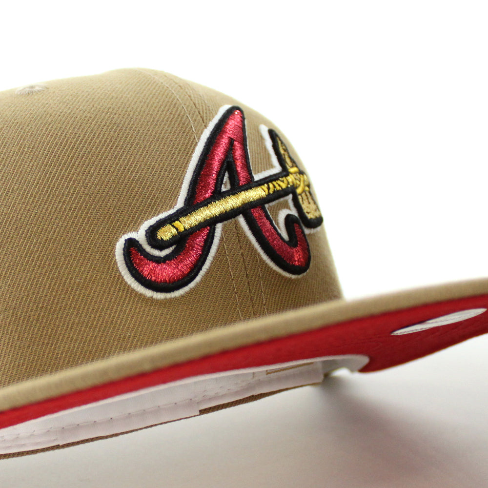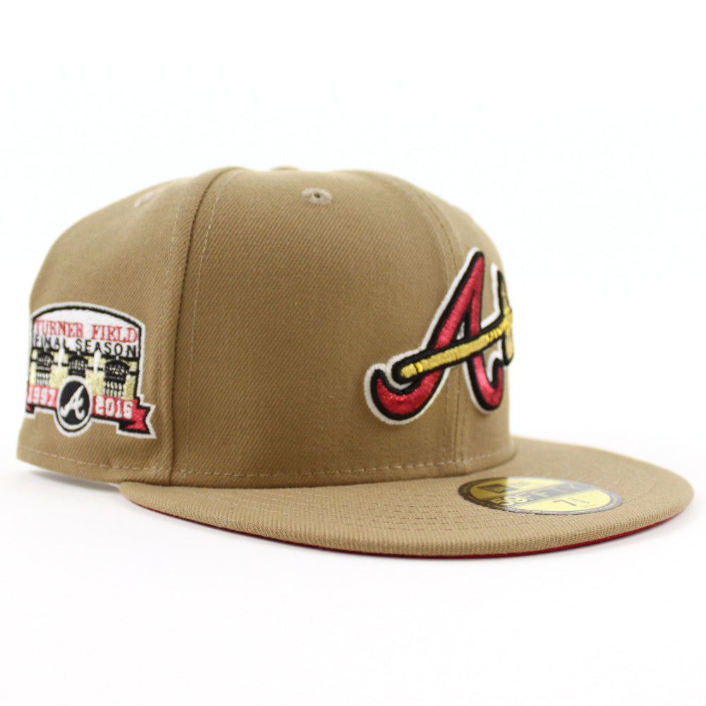 Atlanta Braves Turner Field Final Season New Era 59Fifty Fitted Hat in Khaki and Red Under Brim. Logo Color: M.Red/M.Gold/Black/GITD