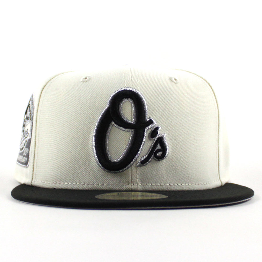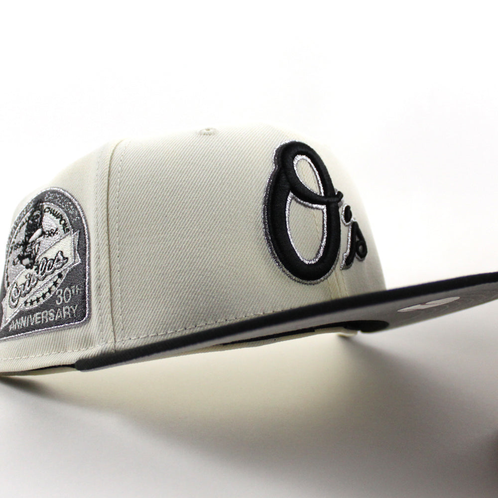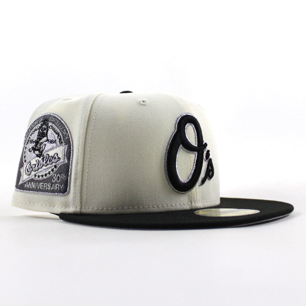 Baltimore Orioles 30th Anniversary 59Fifty New Era Fitted Cap in Chrome White, Black and Metallic Gray Under Brim.