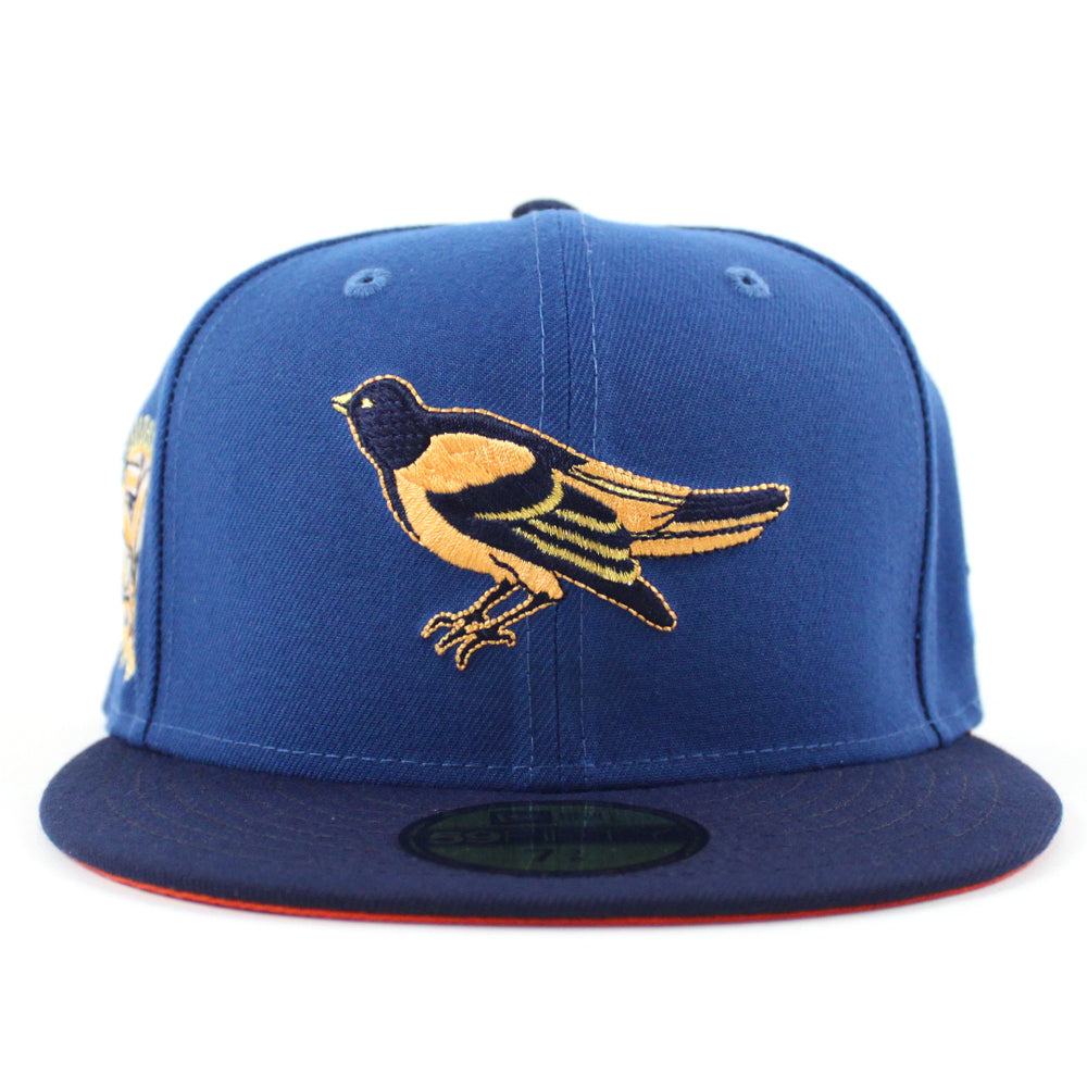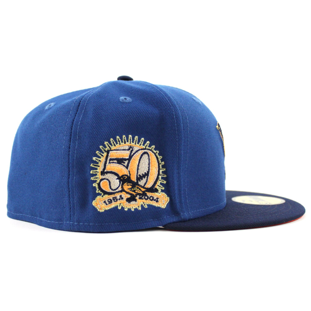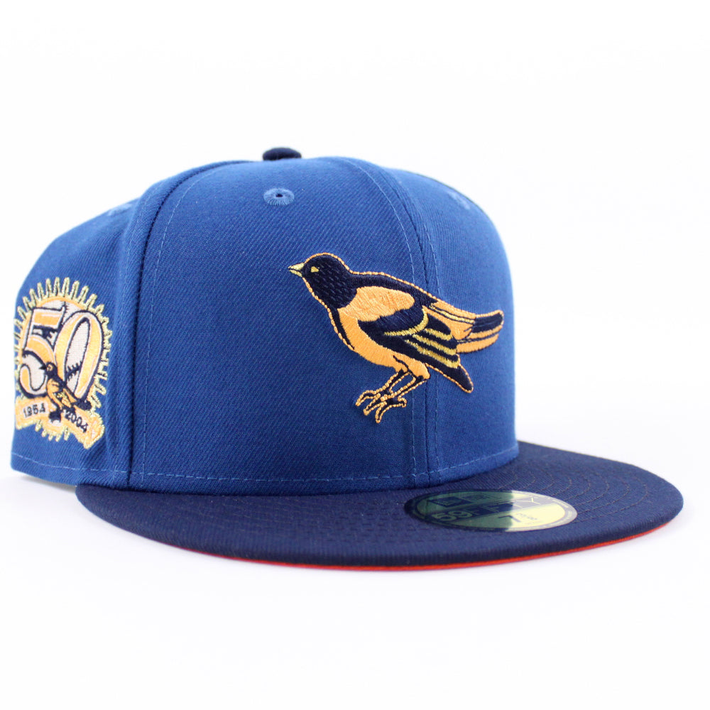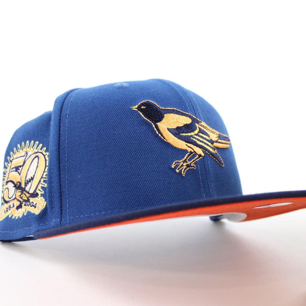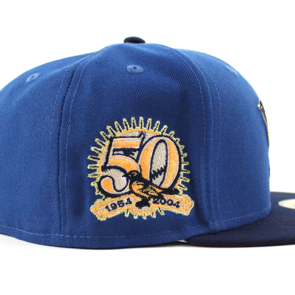 Baltimore Orioles 50th Anniversary 59Fifty New Era Fitted Hat in Light Blue, Navy and Orange Under Brim.