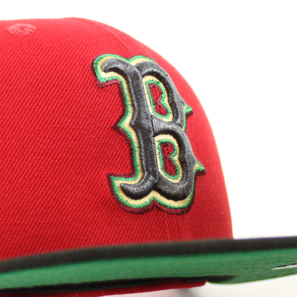 Boston Red Sox 2004 World Series Champion New Era 59Fifty Fitted Cap in Scarlet Red, Black and Green Under Brim with Metallic thread in the logo.