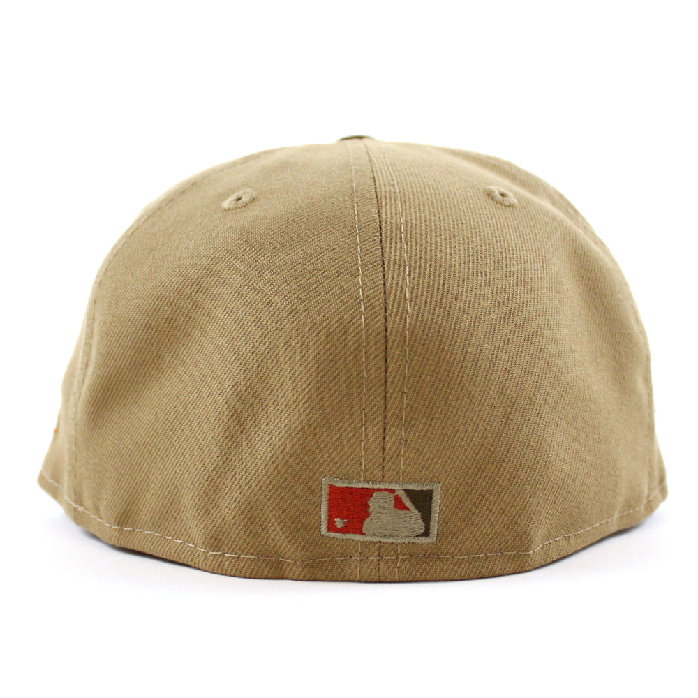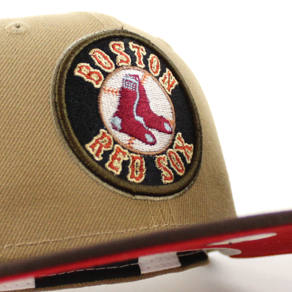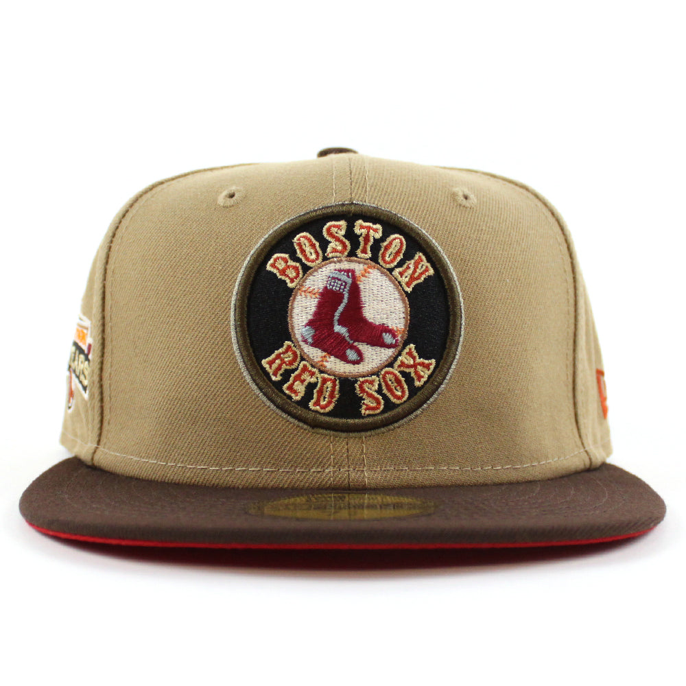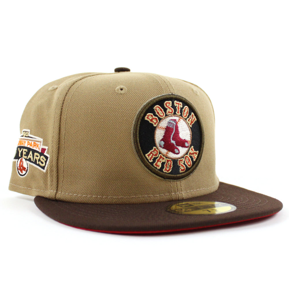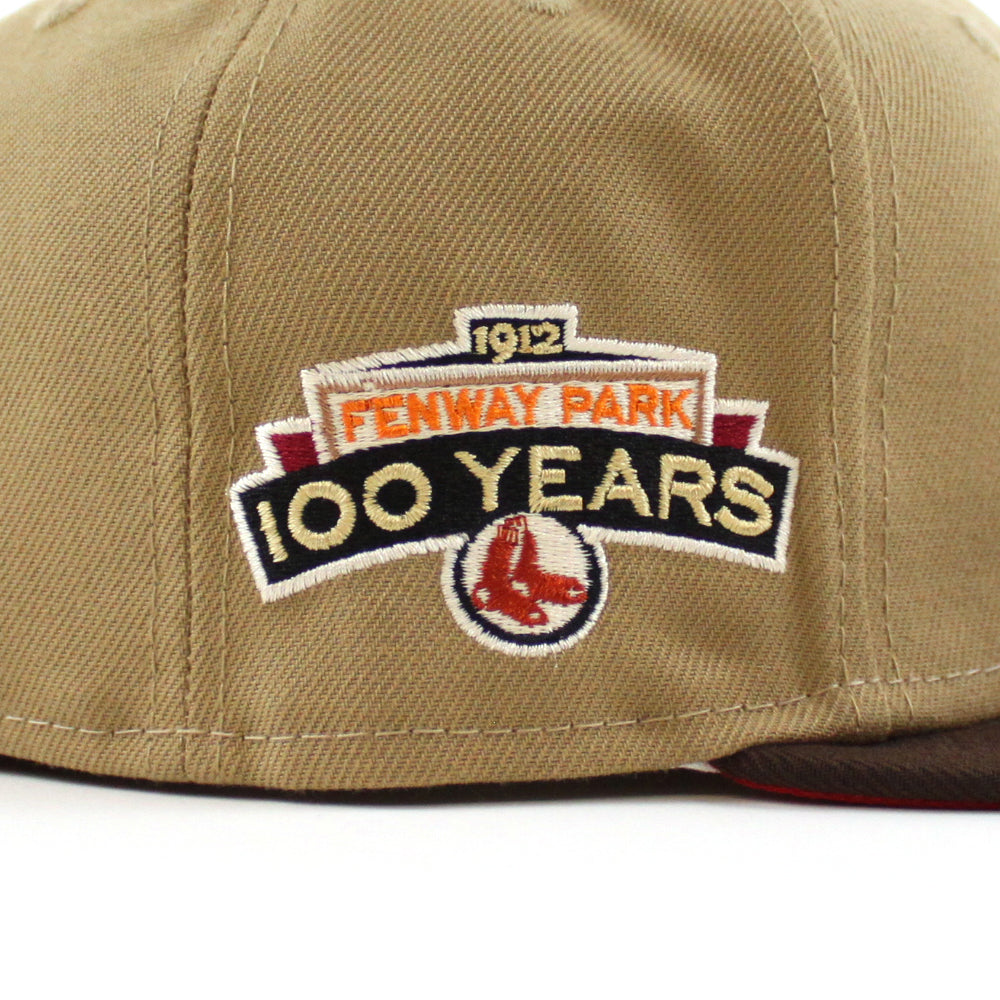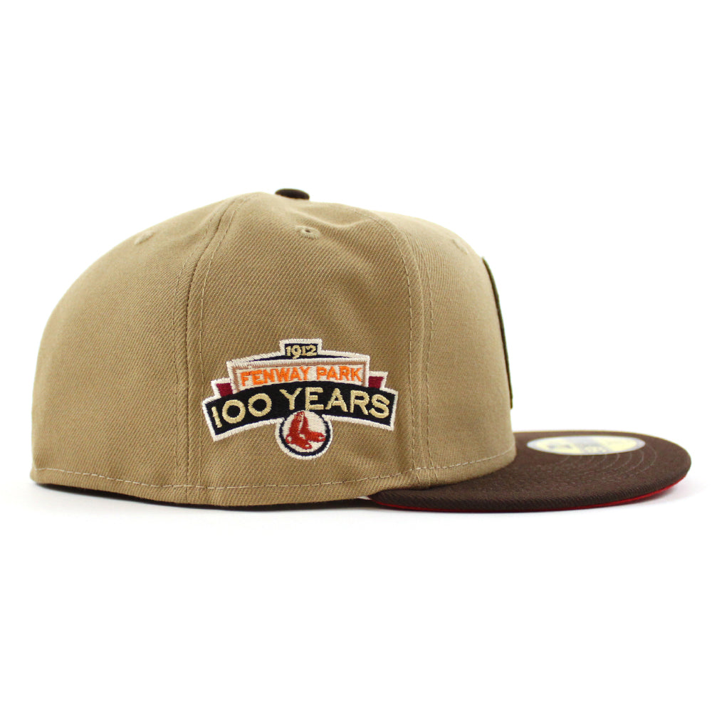 Boston Red Sox Fenway Park 100 Years New Era 59Fifty Fitted Cap in Khaki, Burnt Wood and Scarlet Under Brim.