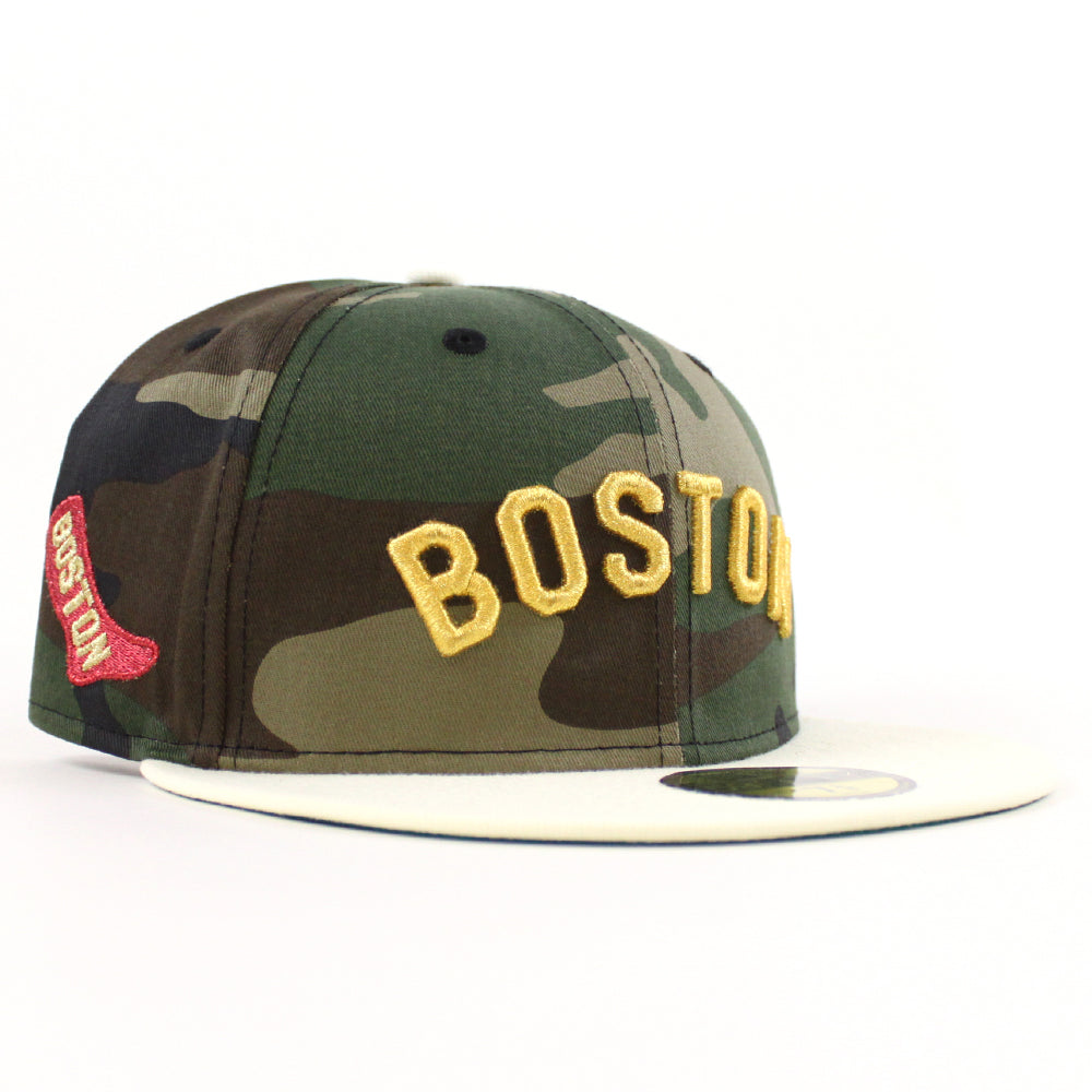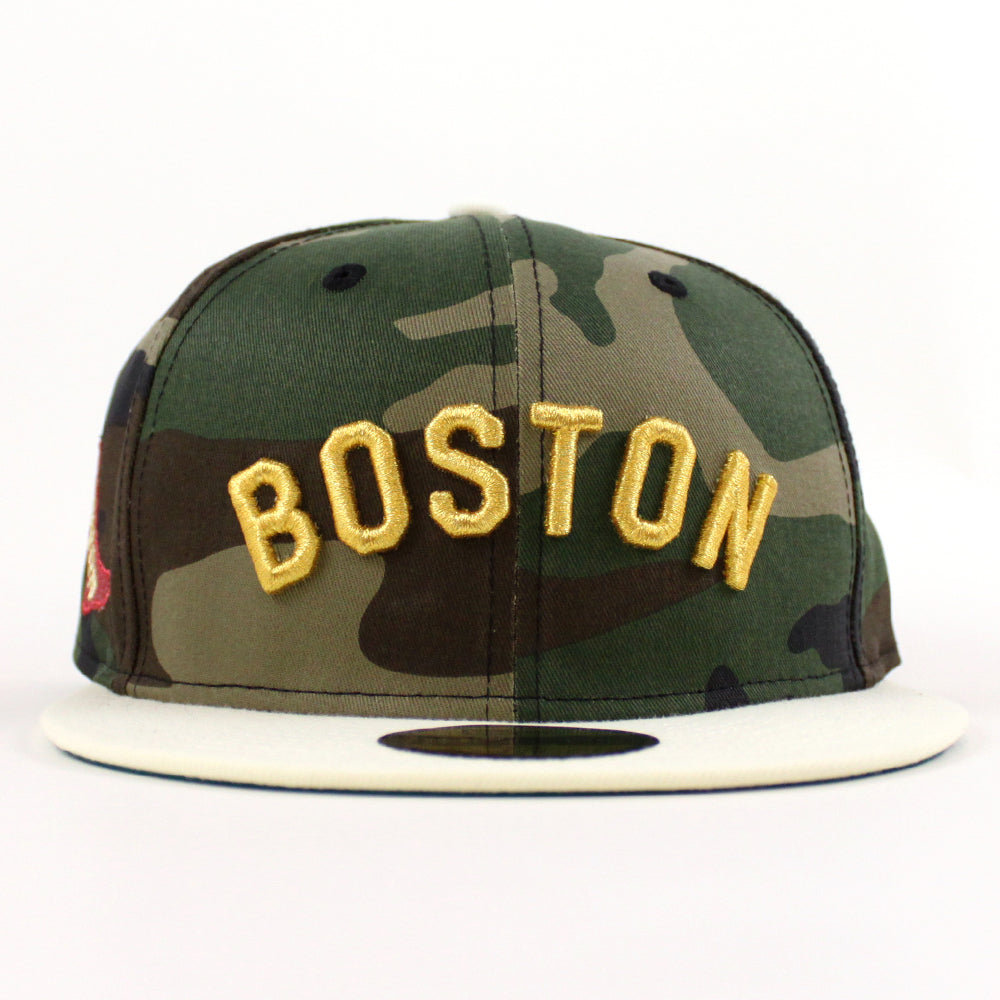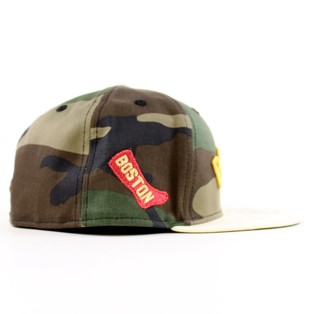 Boston Red Sox Red Sock Patch New Era 59Fifty Fitted Cap in Woodland Camo, Chrome White and Green Under Brim.
