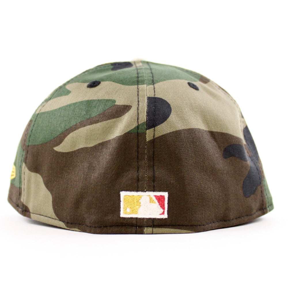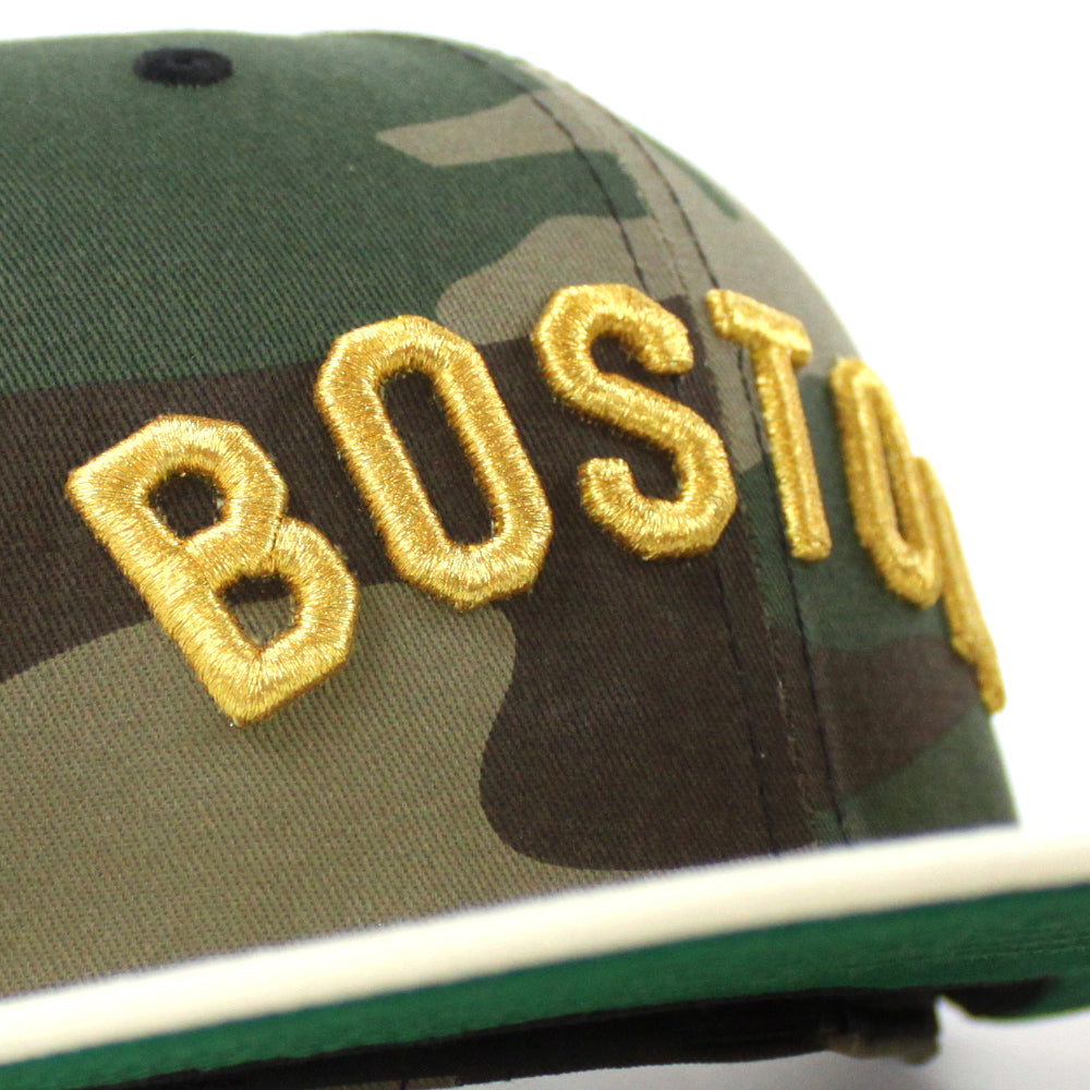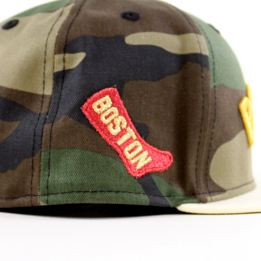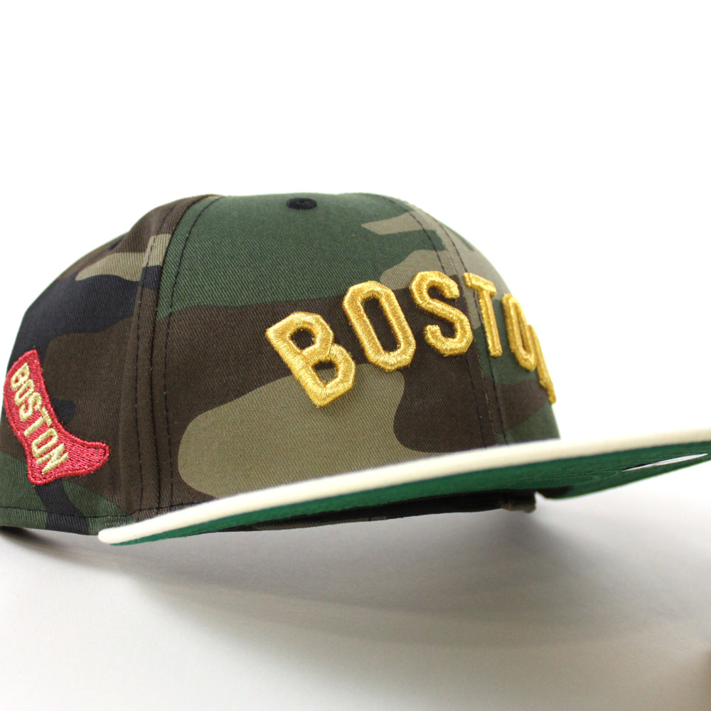 Boston Red Sox Red Sock Patch New Era 59Fifty Fitted Cap in Woodland Camo, Chrome White and Green Under Brim.