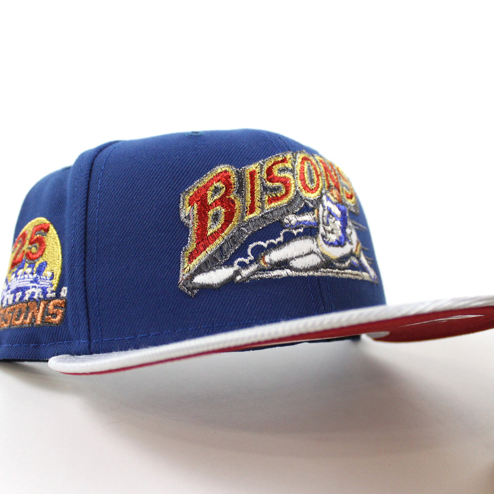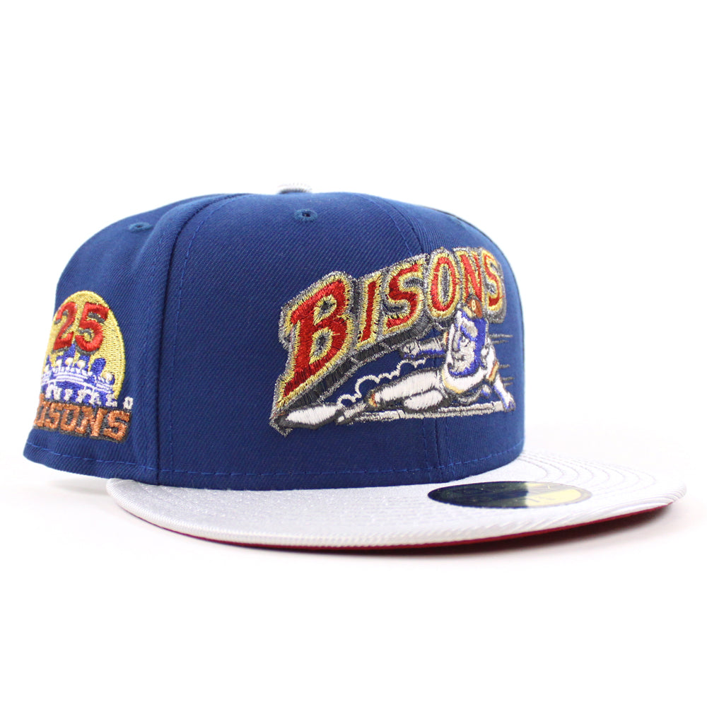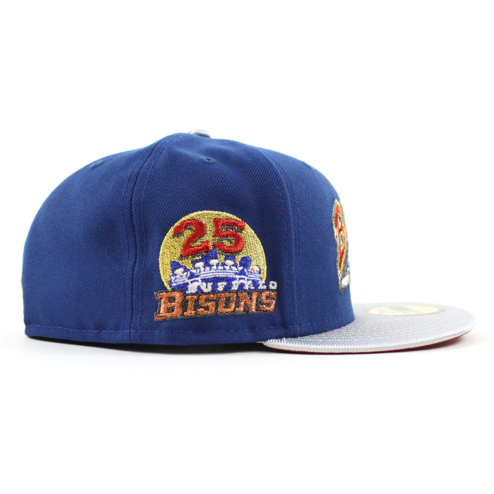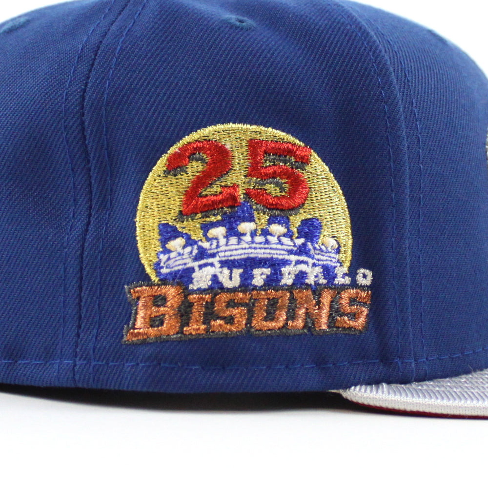 Buffalo Bisons Bisons 25 Patch New Era 59Fifty Fitted Cap in Songbird Blue, Metallic Silver, and Pinot Red Under Brim.