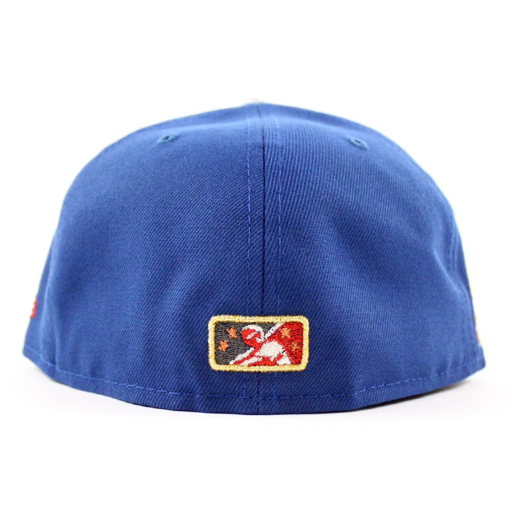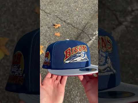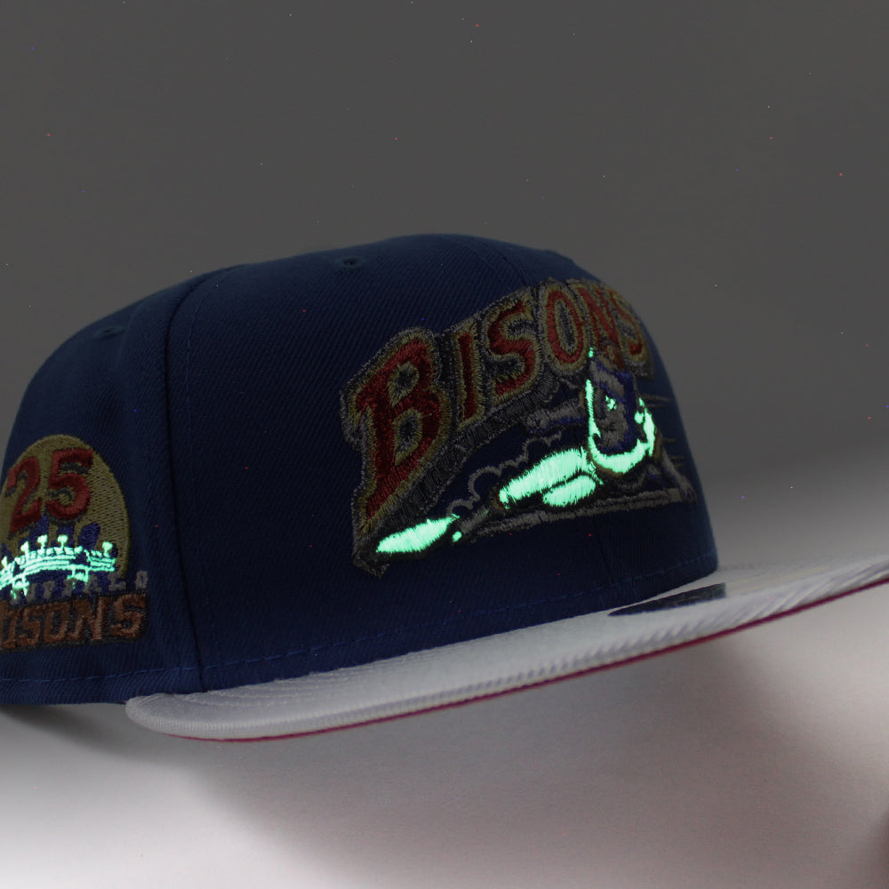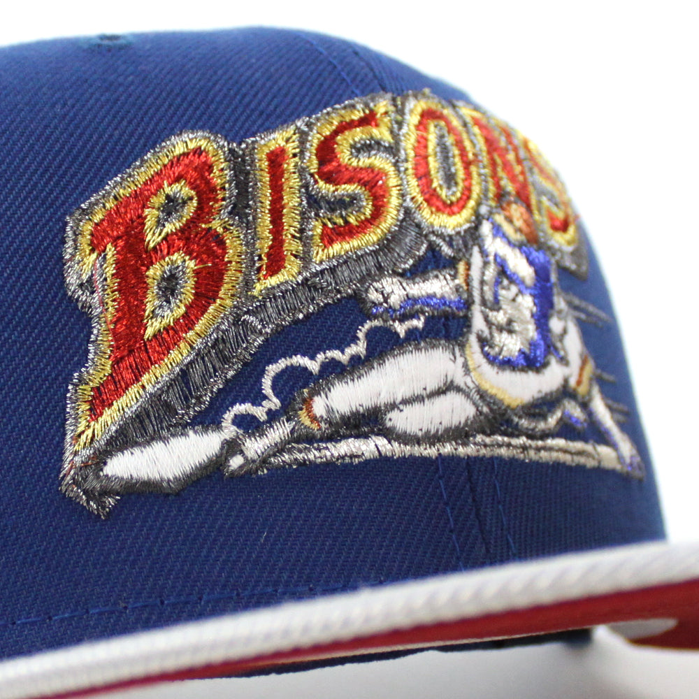 Buffalo Bisons Bisons 25 Patch New Era 59Fifty Fitted Cap in Songbird Blue, Metallic Silver, and Pinot Red Under Brim.
