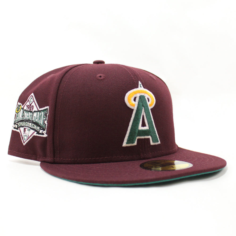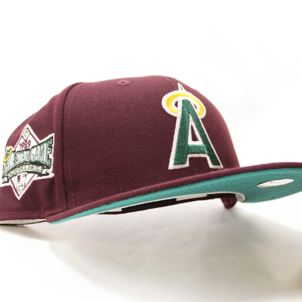 California Angels 1989 All-Star Game New Era 59Fifty Fitted Hat in Maroon and Teal Under Brim.