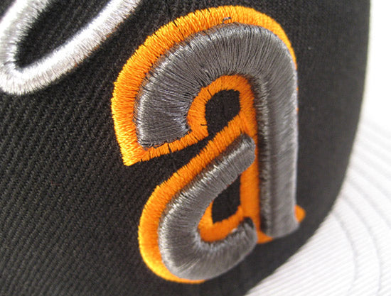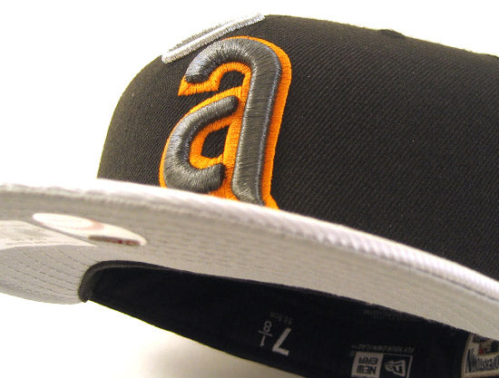 This throw back California Angels New Era Fitted Hat is done up in Black and Silver. The visor is metallic silver along with the top. The fitted is black based and the logo itself features metallic dark silver, metallic silver and pale orange. The fitted is finished with a gray under Brim.