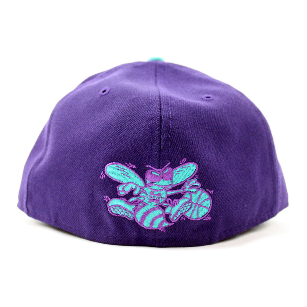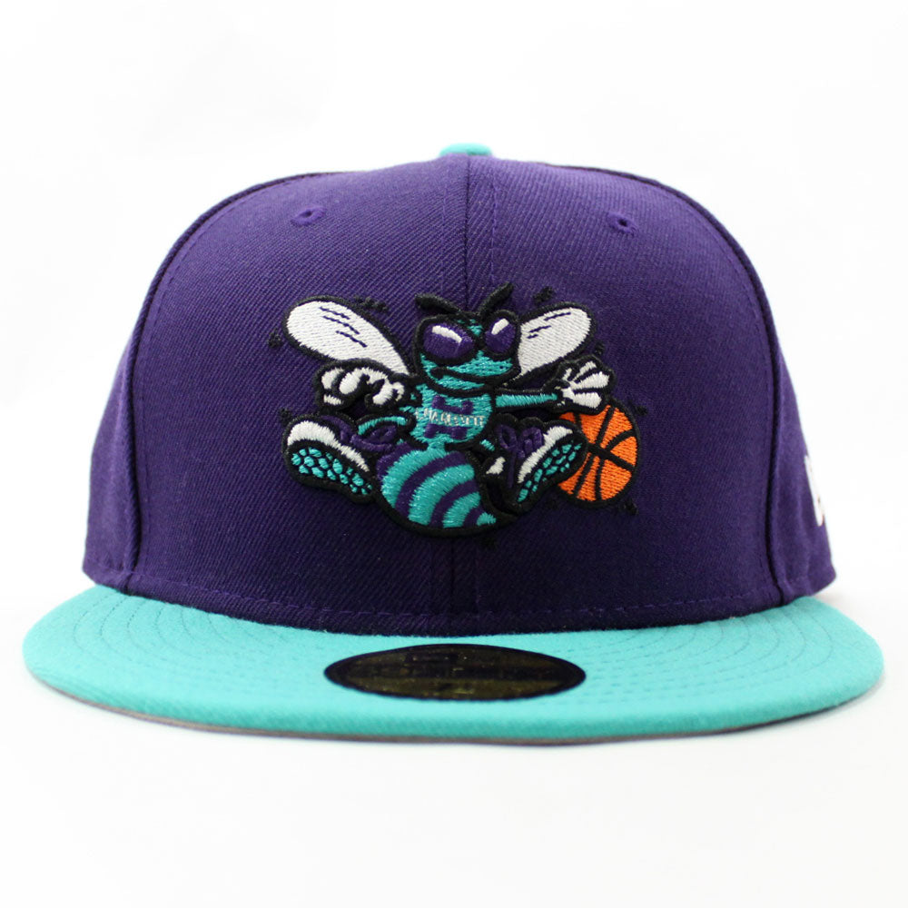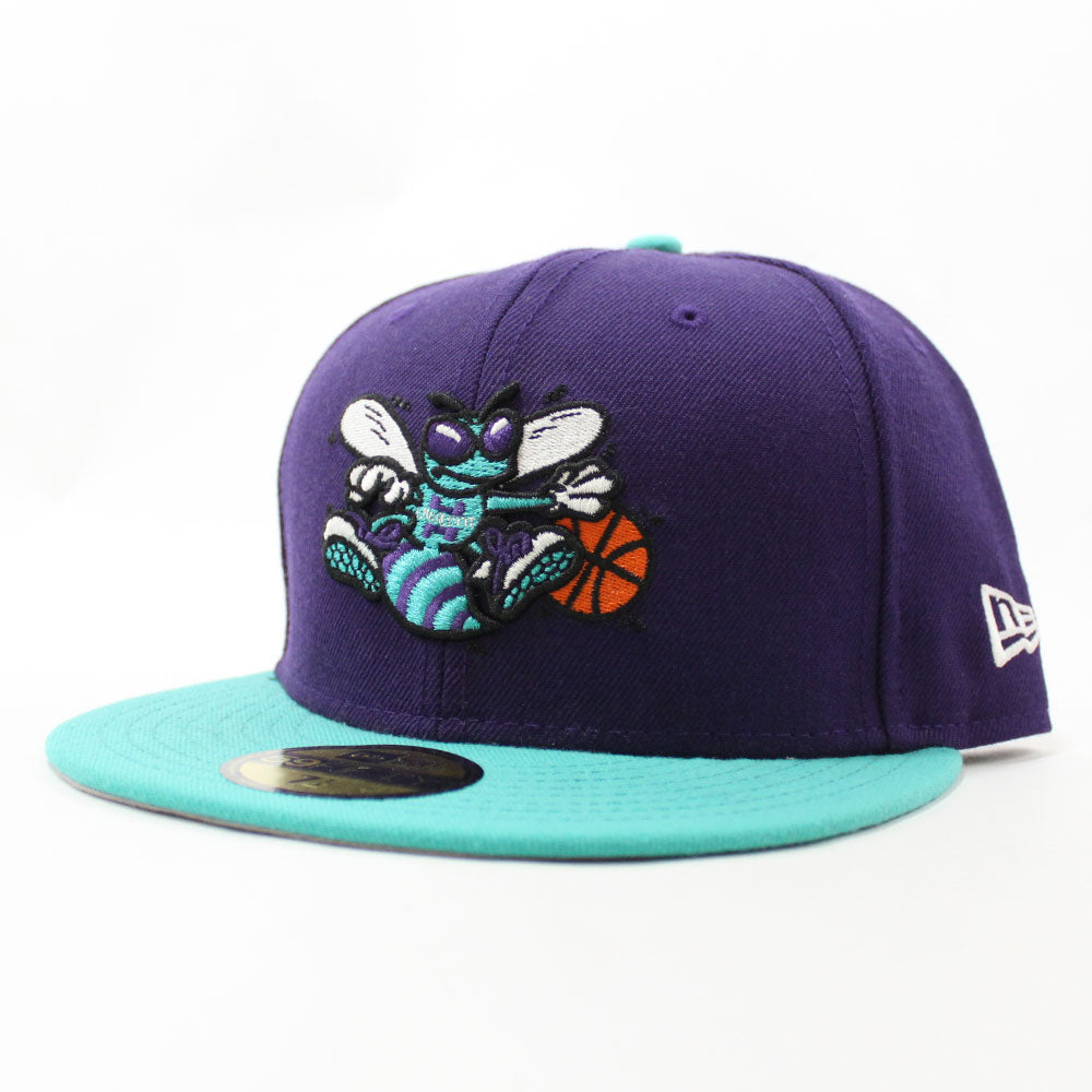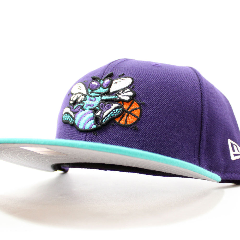 Before the Charlotte Hornets changed to their new logo they had one of the best logo's of the 90s. The Hornet holding the basketball reminds us of the days of Alonzo Mourning and Larry Johnson. The New Era 59Fifty Fitted hat is featured on a purple base with teal accents. It also features a gray under brim