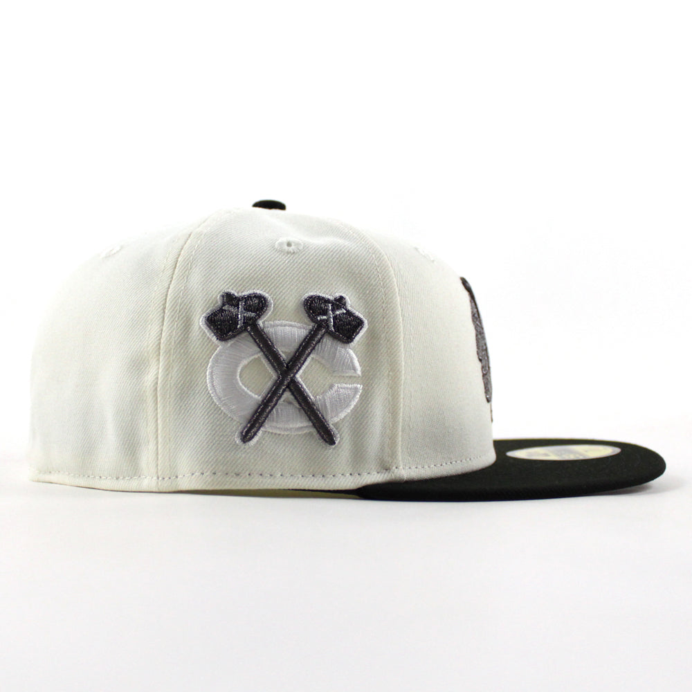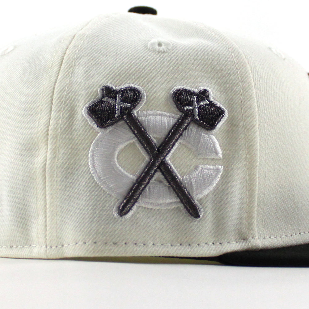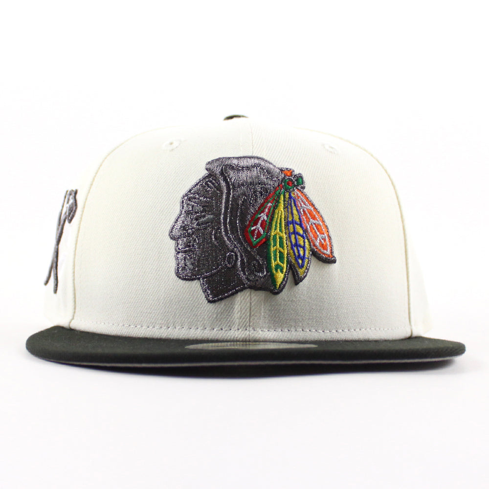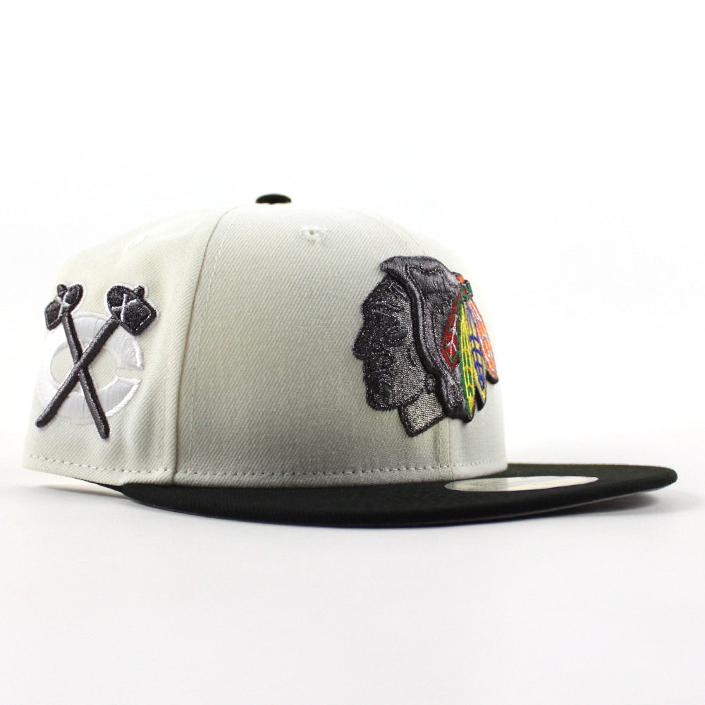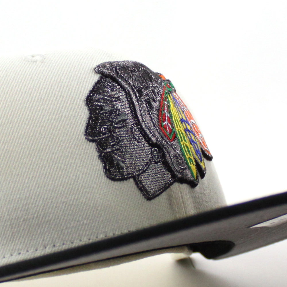 Chicago Blackhawks Black Hawks Logo New Era 59Fifty Fitted Hat in Chrome White Black and Gray Under brim.