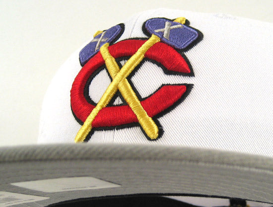With the change towards warm weather means we'll start dropping more spring and summer colored New Era 59FIFTY Fitted Hat. This Blackhawks New Era 5950 Fitted Cap is white based with a grey visor and button. The best part of the fitted is the logo, It shows shades of purple, yellow and red with a hint of black.