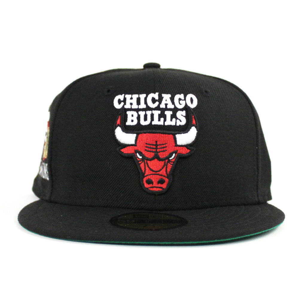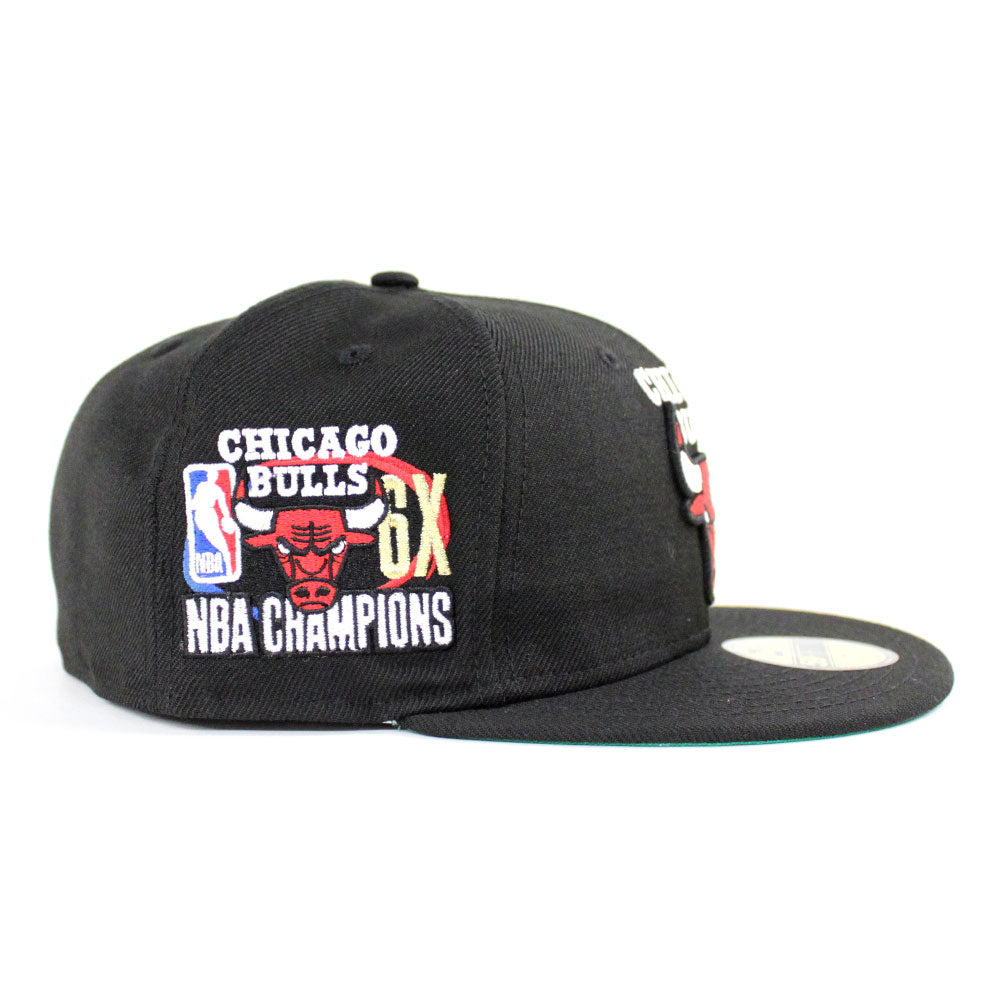 Chicago Bulls NBA CHAMP New Era 59fifty Fitted Hat in Black with a Gray Under Brim.