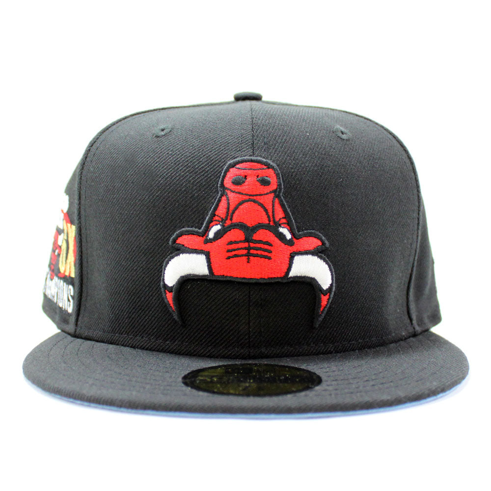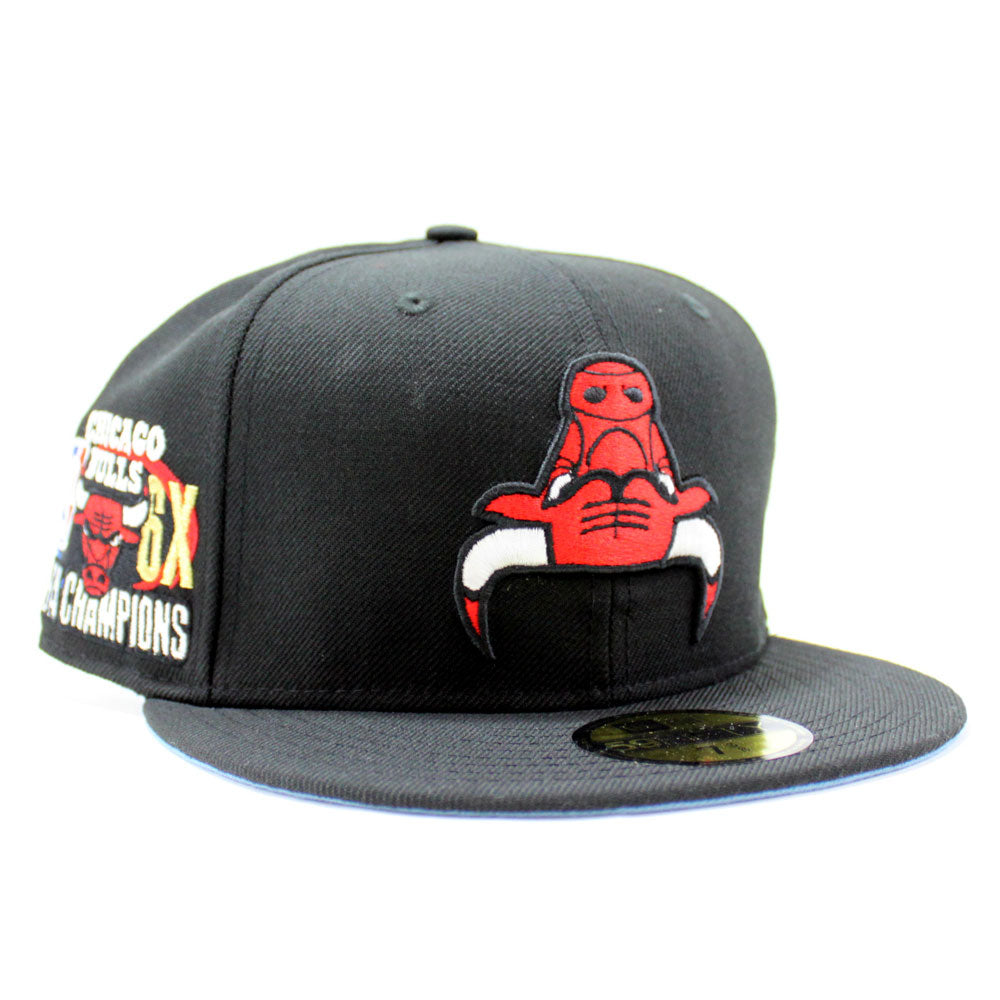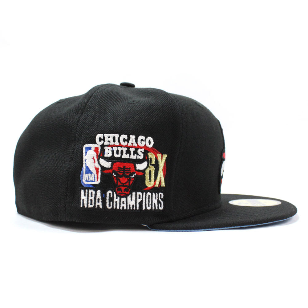 Chicago Bulls UPSIDE DOWN NBA CHAMP New Era 59fifty Fitted Hat (Black Sky Blue Under Brim)