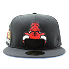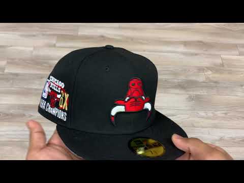 Chicago Bulls UPSIDE DOWN NBA CHAMP New Era 59fifty Fitted Hat in Black with a Sky Blue Under Brim.