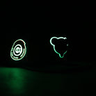 Simply Expose Logo to Sunlight (or bright light) for at least one full minute to activate the green phosphorescent glow. The longer it is exposed, the longer and brighter the afterglow will be.