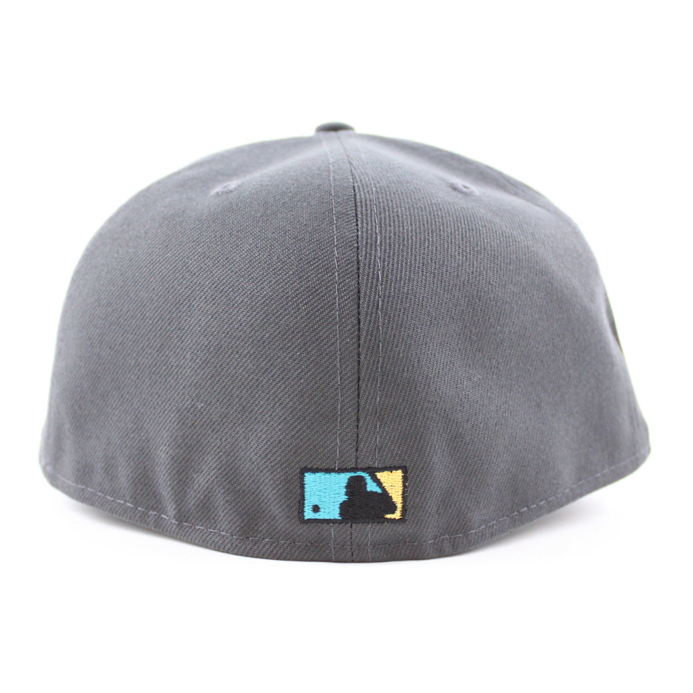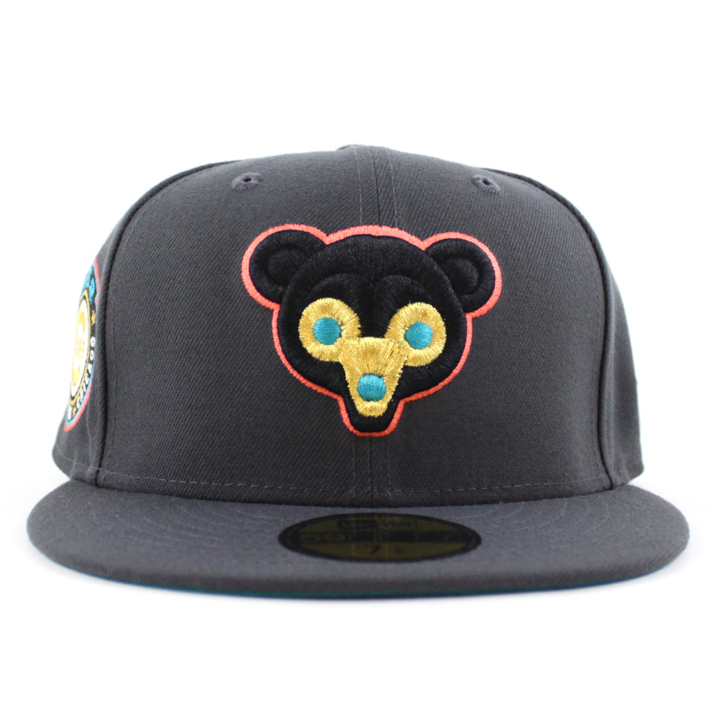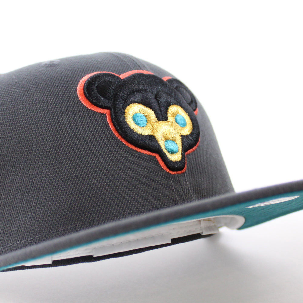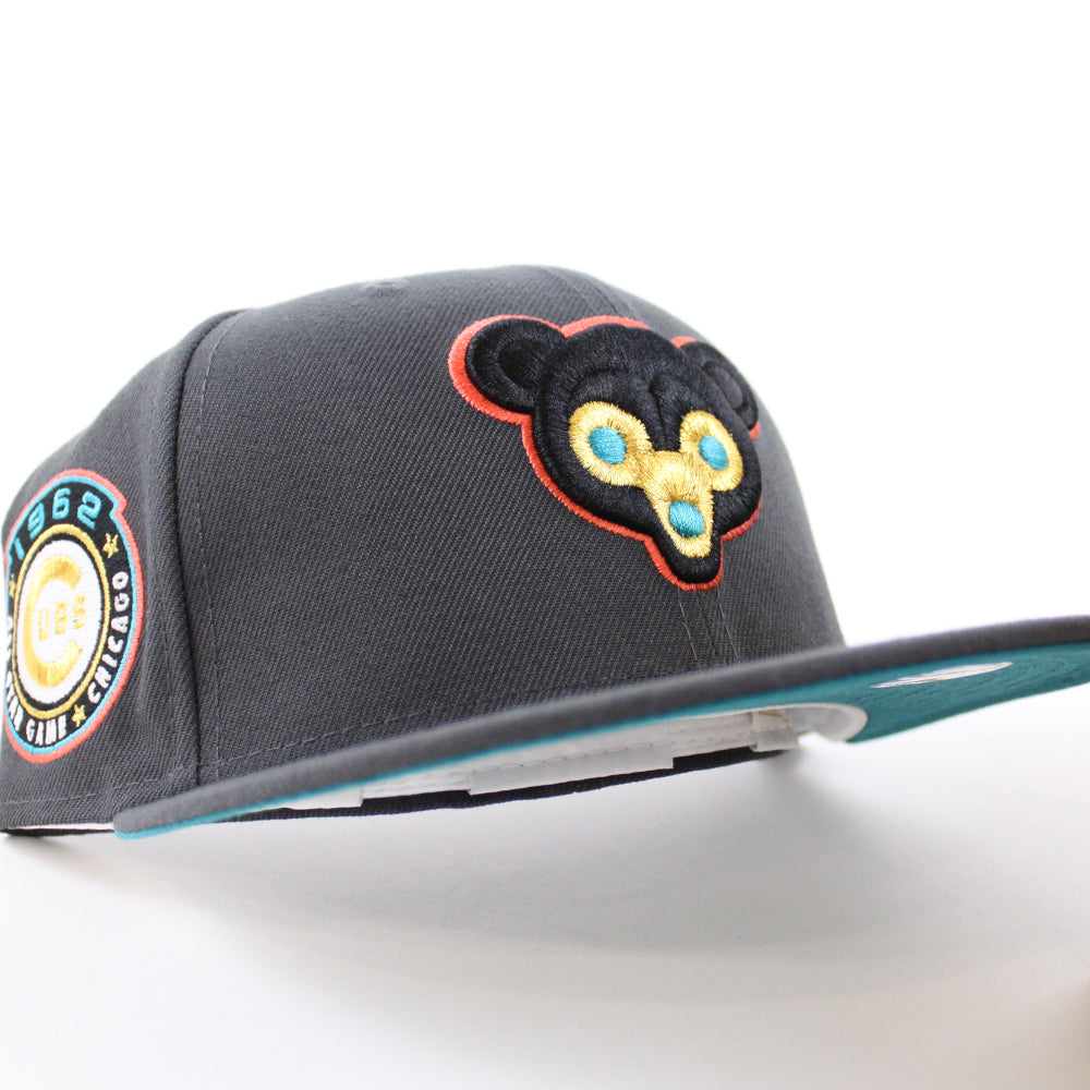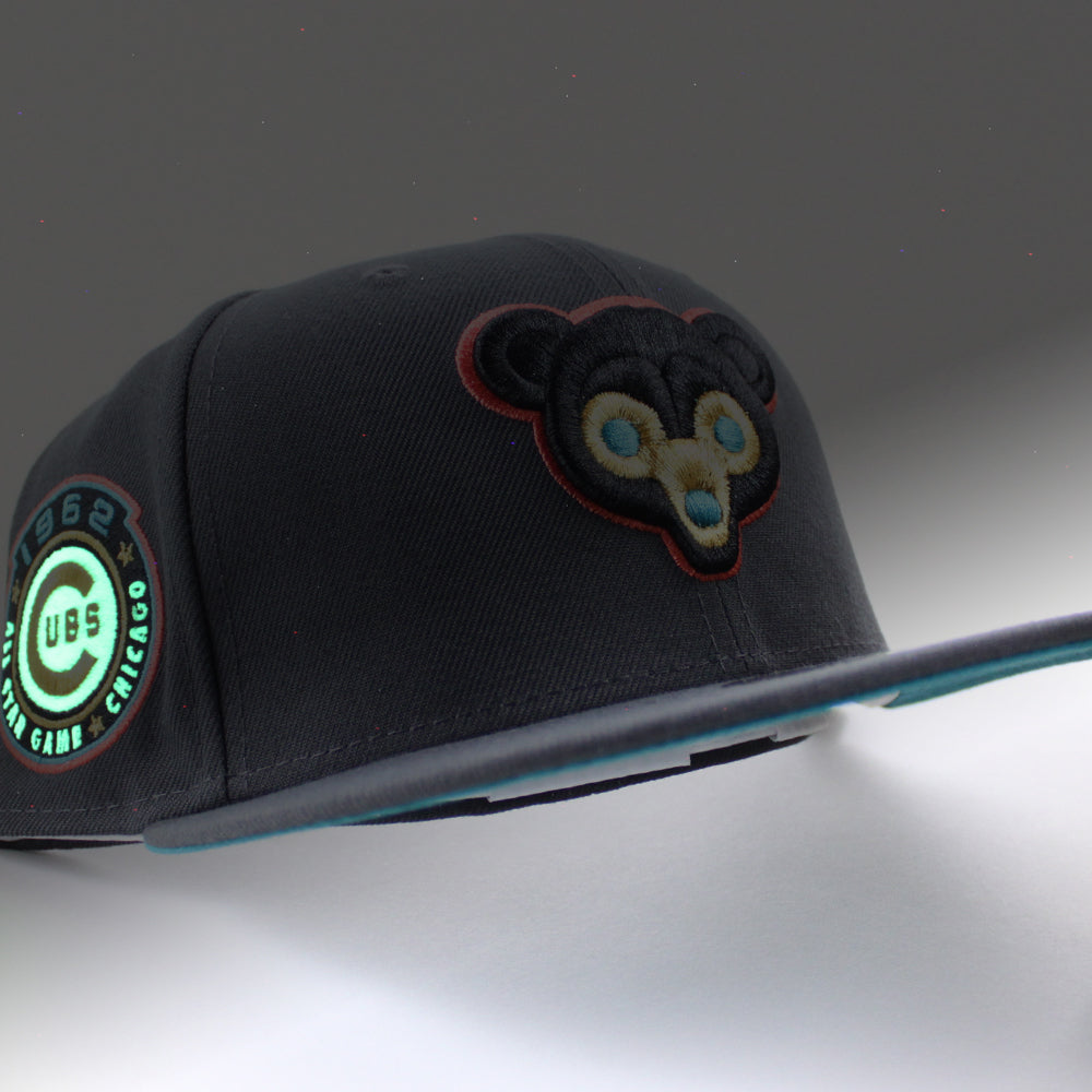 Chicago Cubs 1962 All Star Game 59Fifty New Era Fitted Hat in Dark Gray and Aqua Under Brim. Logo: Glow in the Dark