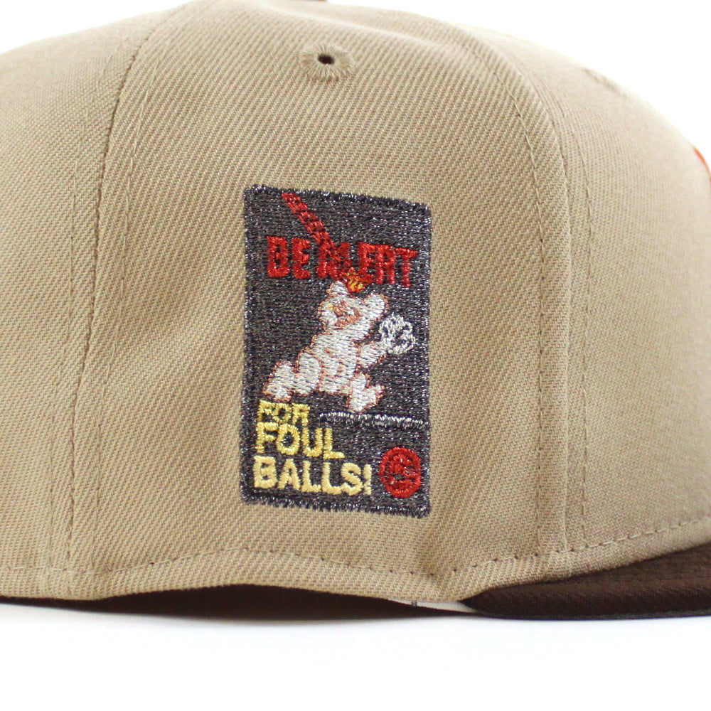 Chicago Cubs Be Alert For Foul Balls New Era 59Fifty Fitted Hat (Camel Burnt Wood Storm Gray Under Brim)