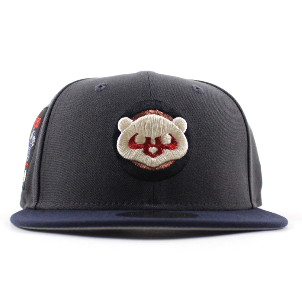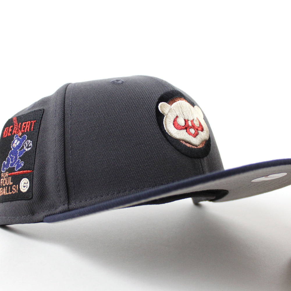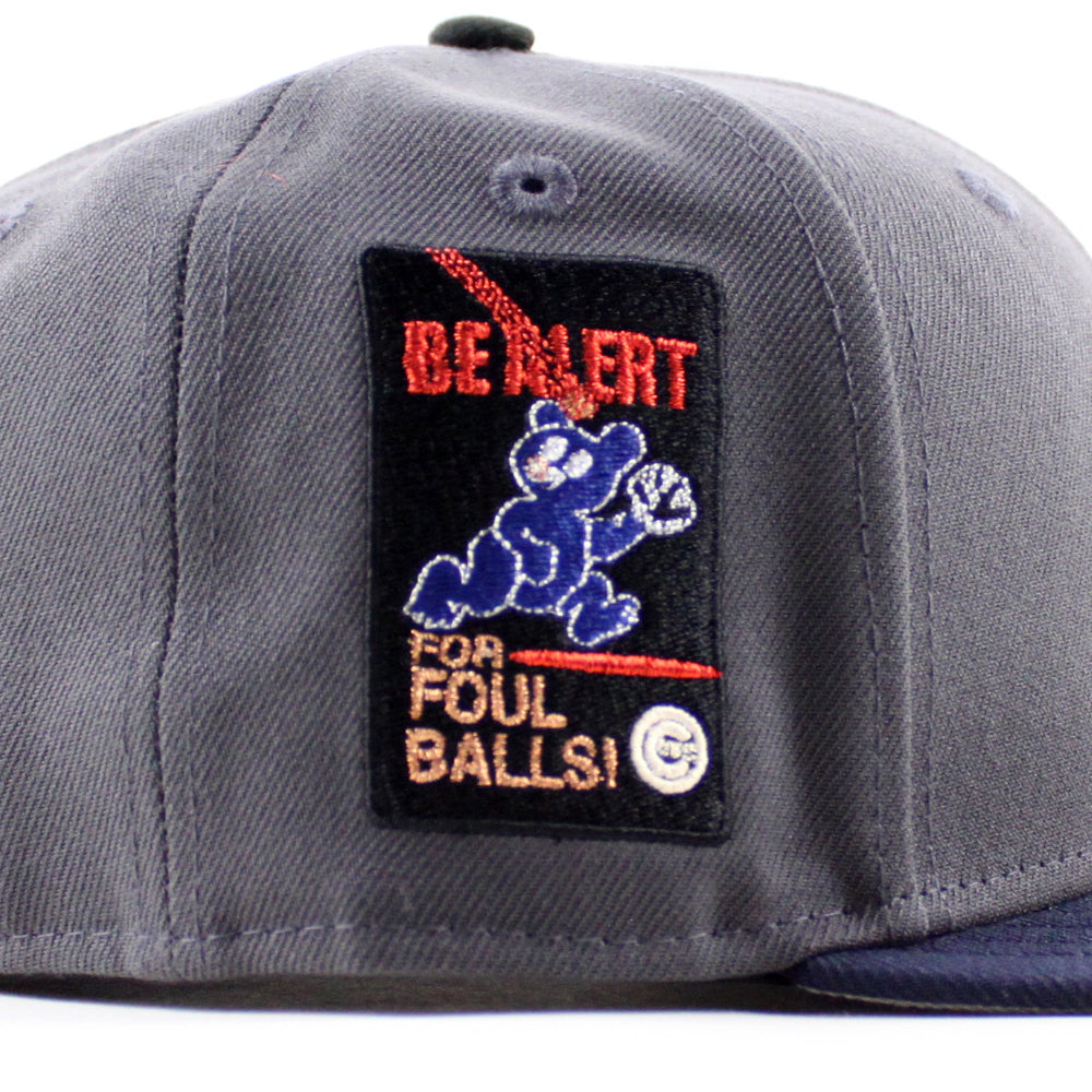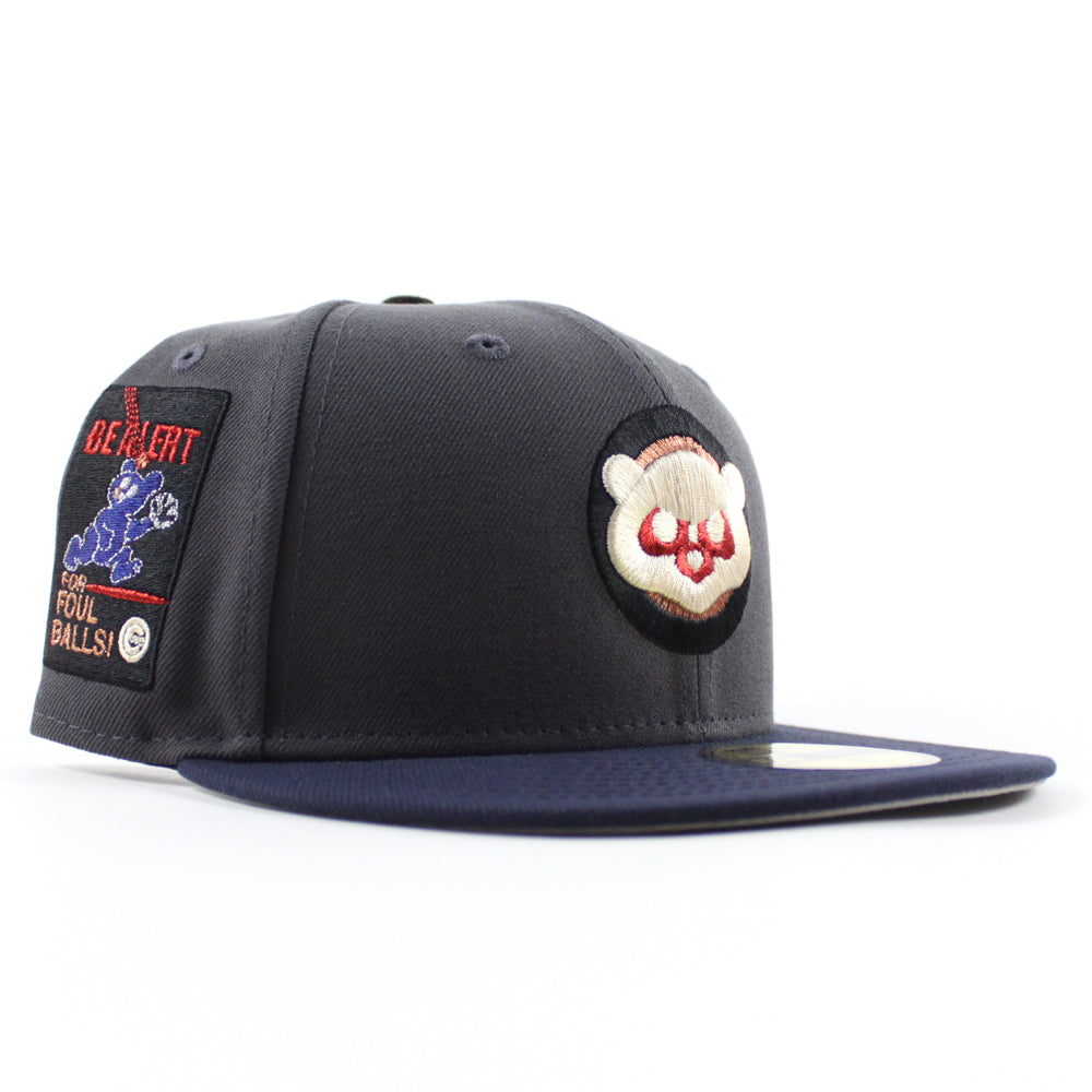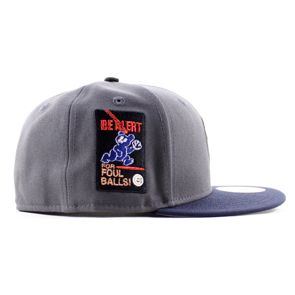 Chicago Cubs Alert For Foul Balls 59Fifty New Era Fitted Hat in Graphite Gray, Navy and Green Under Brim.Β