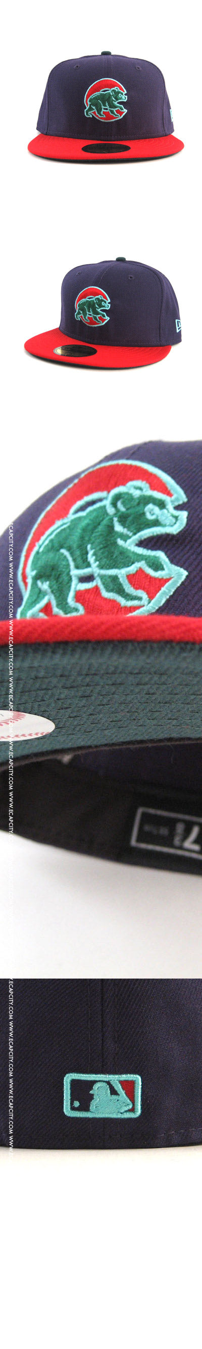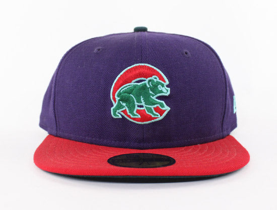 The Chicago Cubs New Era Fitted 59Fifty Hat features the very popular Cub walking through the 'C' logo. It's on a purple based Fitted hat with red accents, it also has a touch of sea glass.