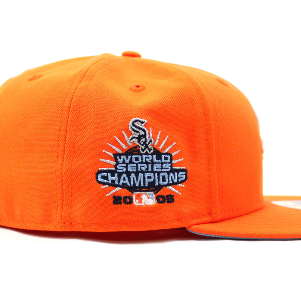 Chicago White Sox 2005 World Series CHAMPIONS New Era Fitted 59Fifty Cap in Rush Orange & Sky Blue Under Brim.
