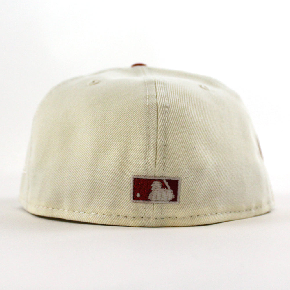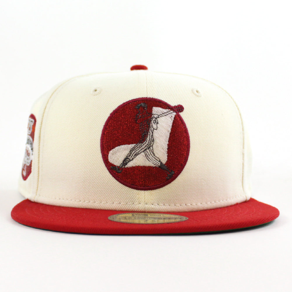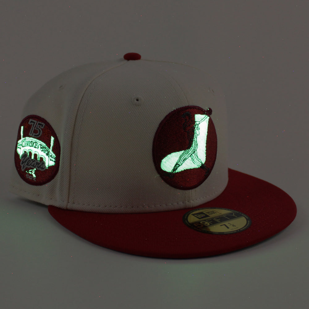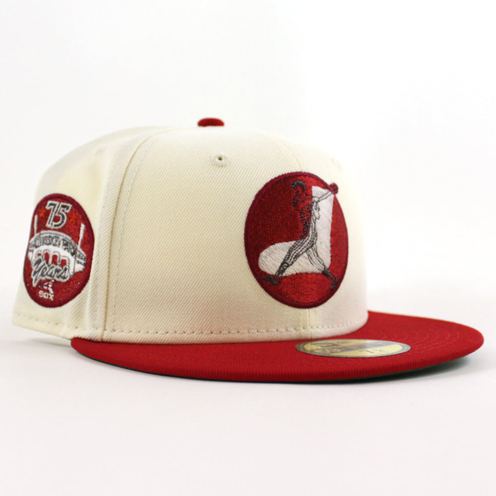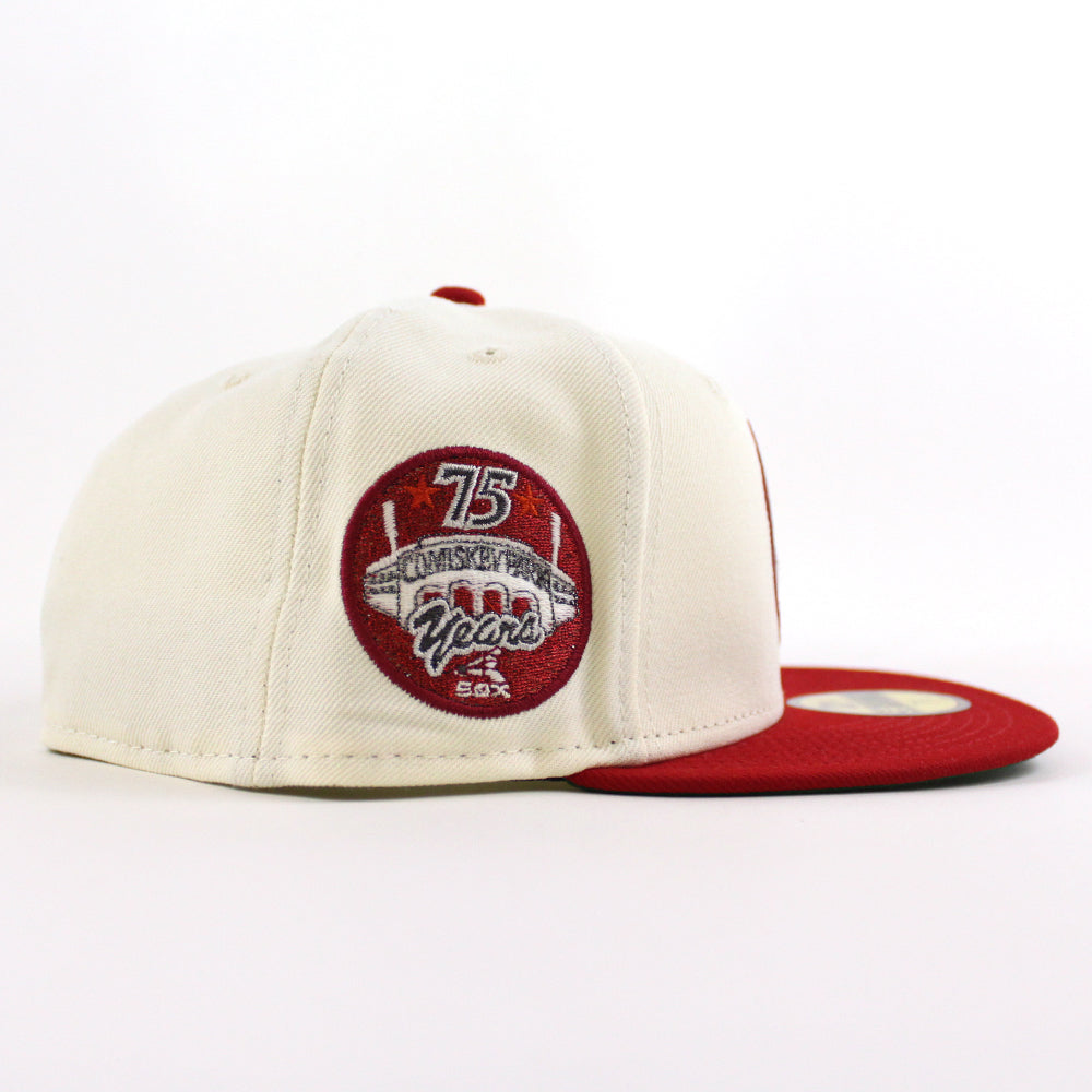 Chicago White Sox Comiskey Park New Era Fitted 59Fifty Cap in Chrome White, Scarlet Red and Gray Under Brim.
