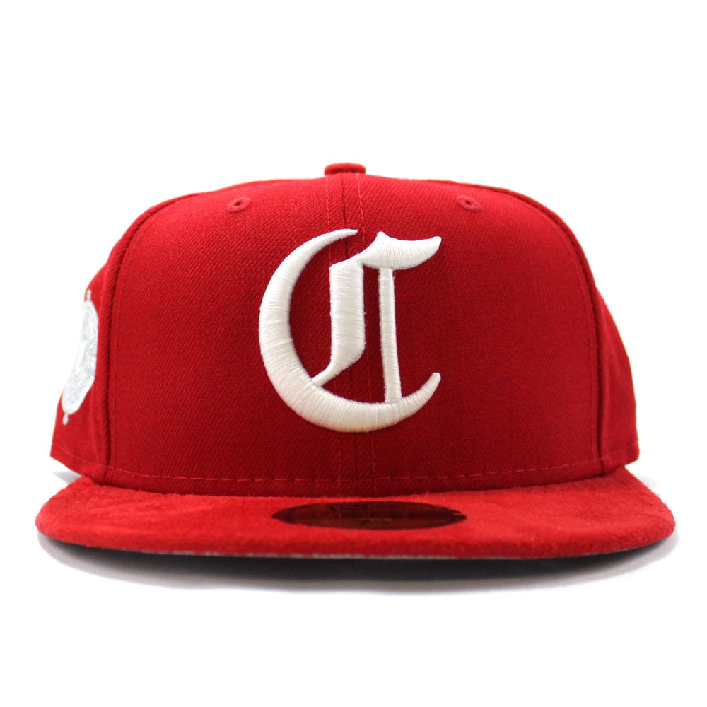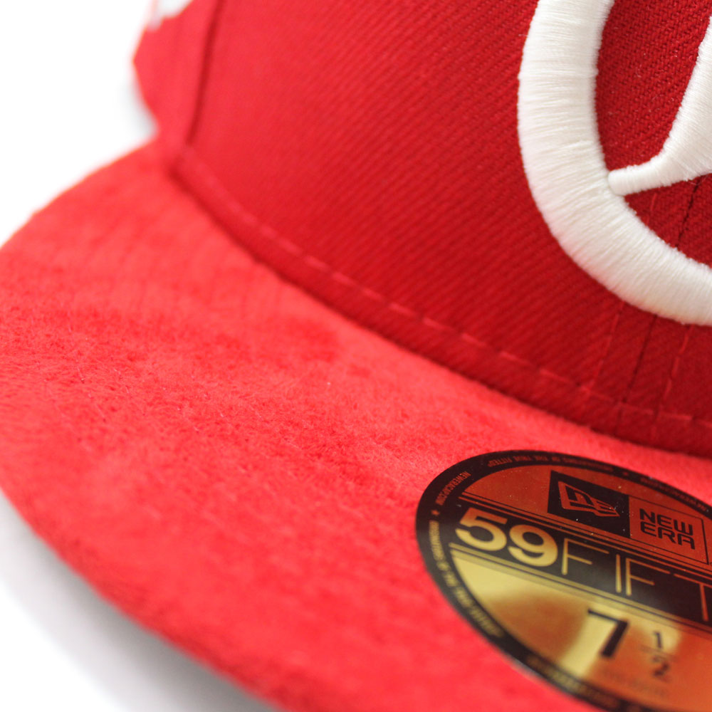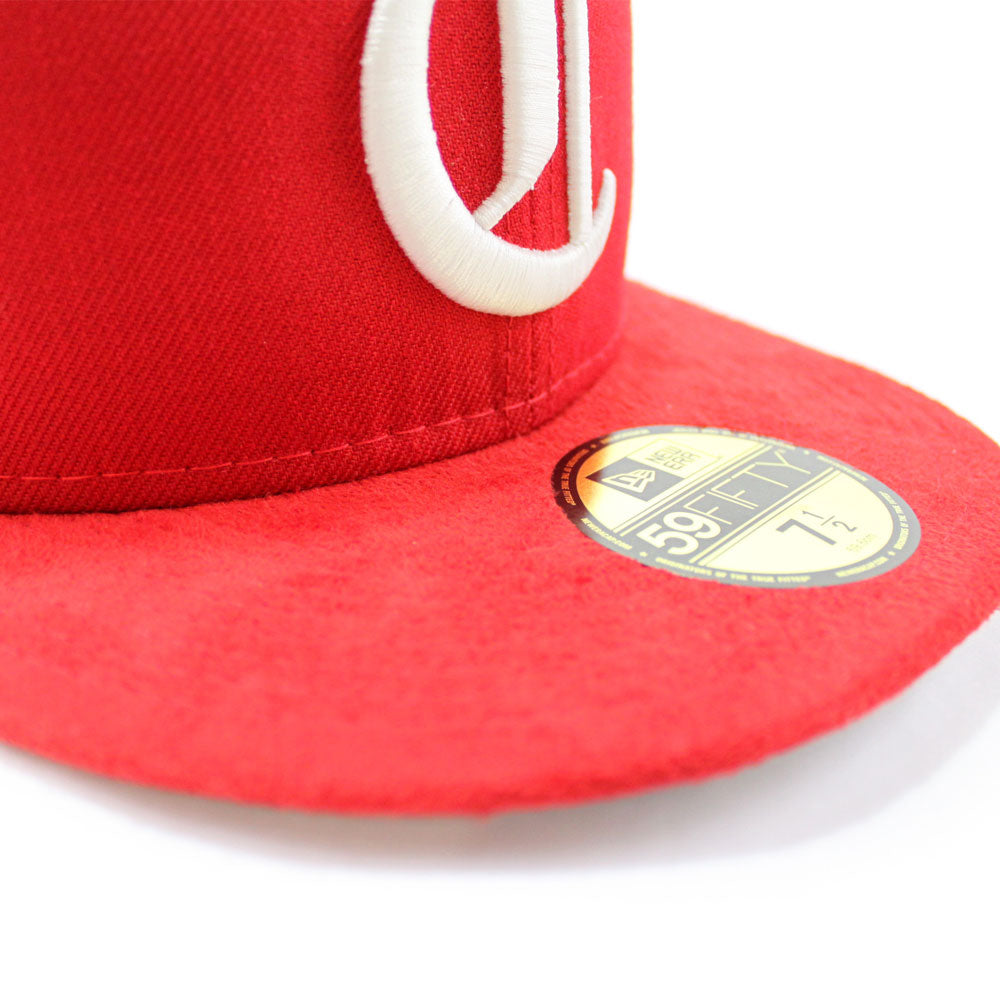 Cincinnati Red Stockings 1890-1899 Retro New Era 59Fifty Fitted Hat in Red Wool Hat, Red SUEDE and Grey Under Brim.