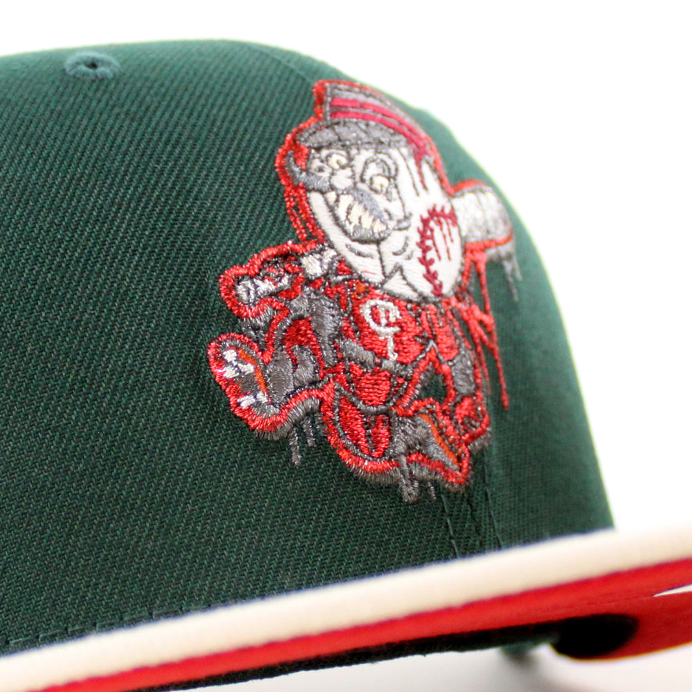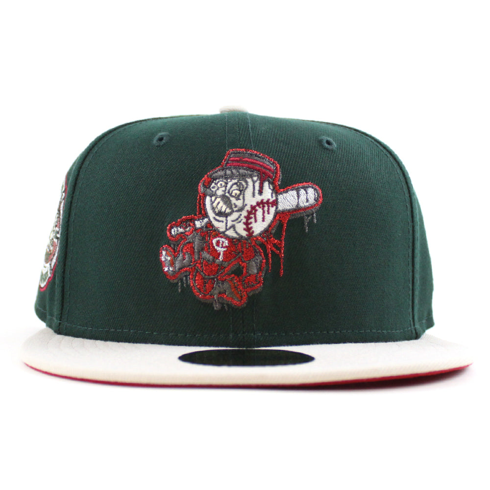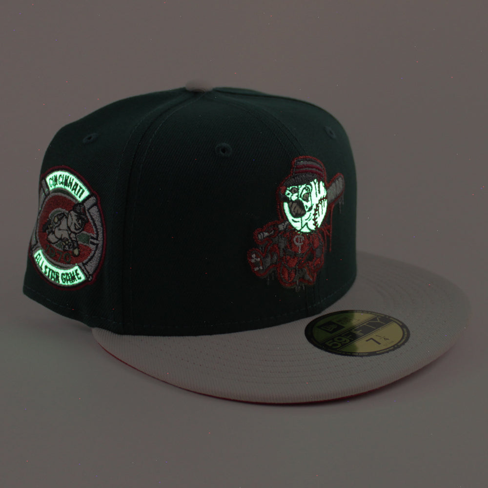 Drip logo Cincinnati Reds 1970 All Star Game New Era 59Fifty Fitted Cap in Dark Green, Stone and Red Under Brim. Logo: Glow in the Dark.