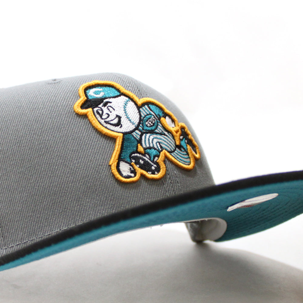 Cincinnati Reds 1970 AllStar Game New Era 59Fifty Fitted Hat in Storm Gray With Black Visor, and Teal Under Brim.