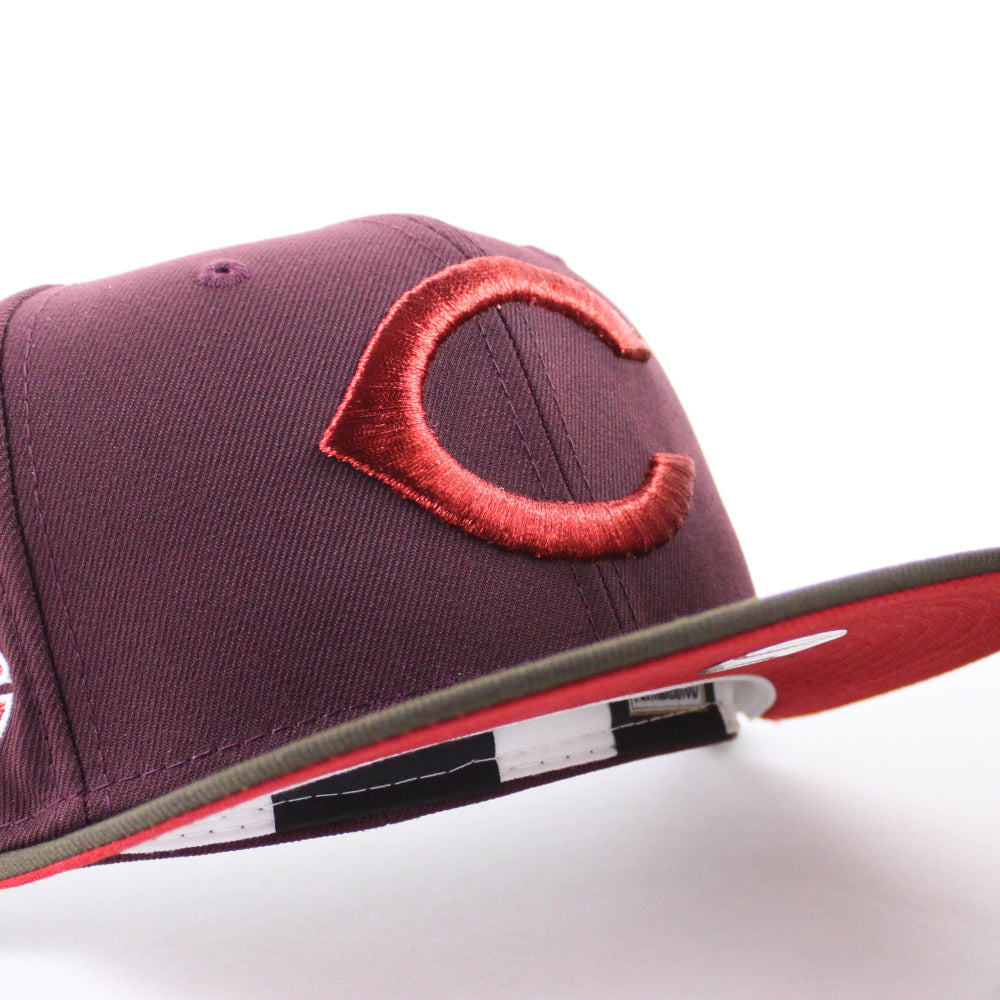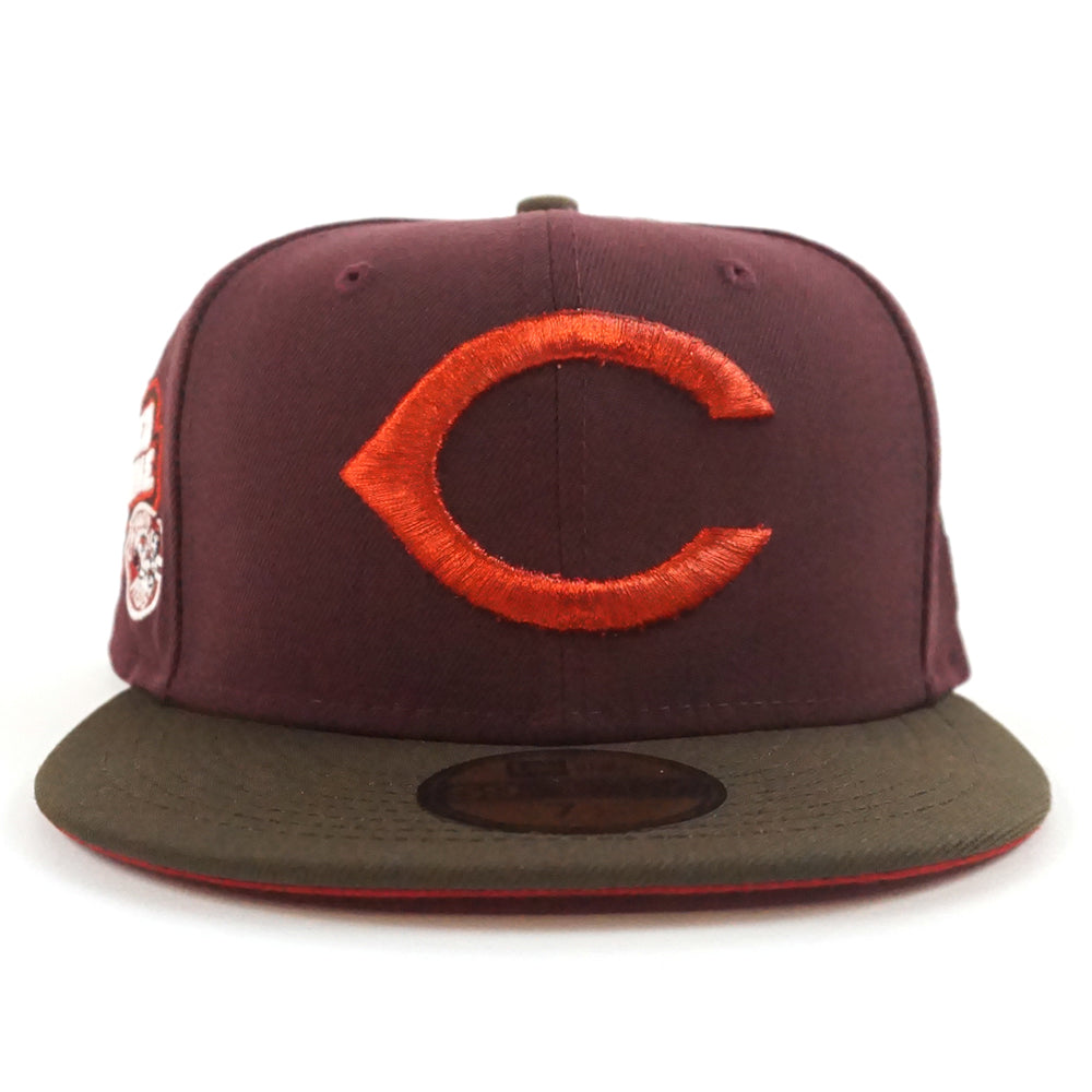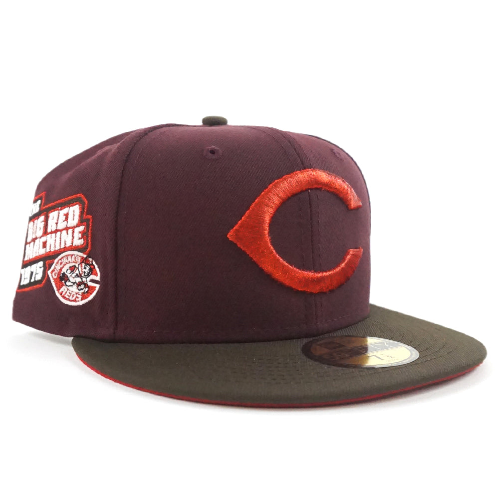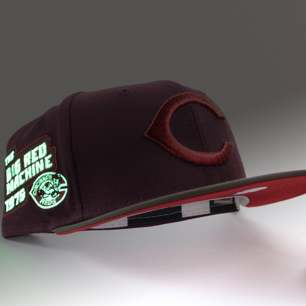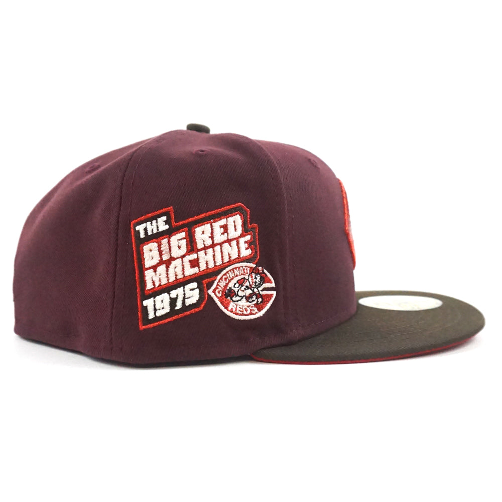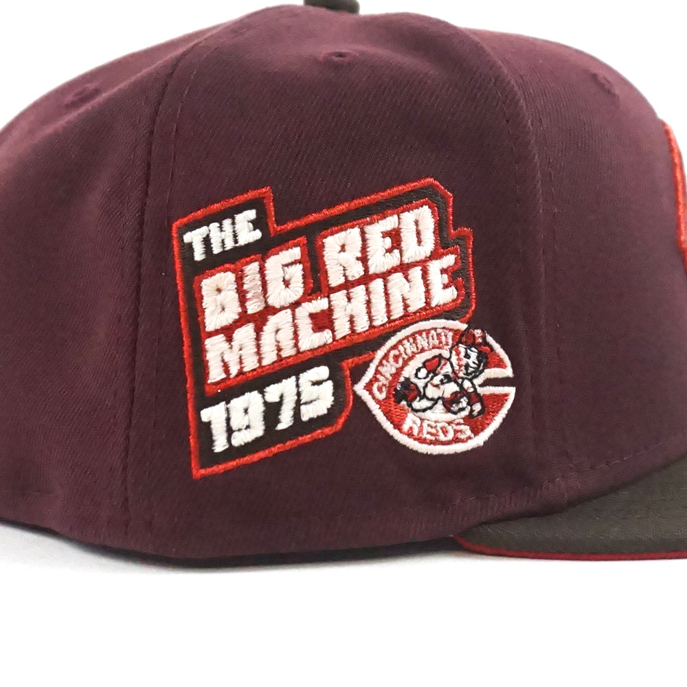 Cincinnati Reds The Big Red Machine 1975 New Era 59Fifty Fitted Hat in GITD Maroon, Walnut and Red Under Brim.